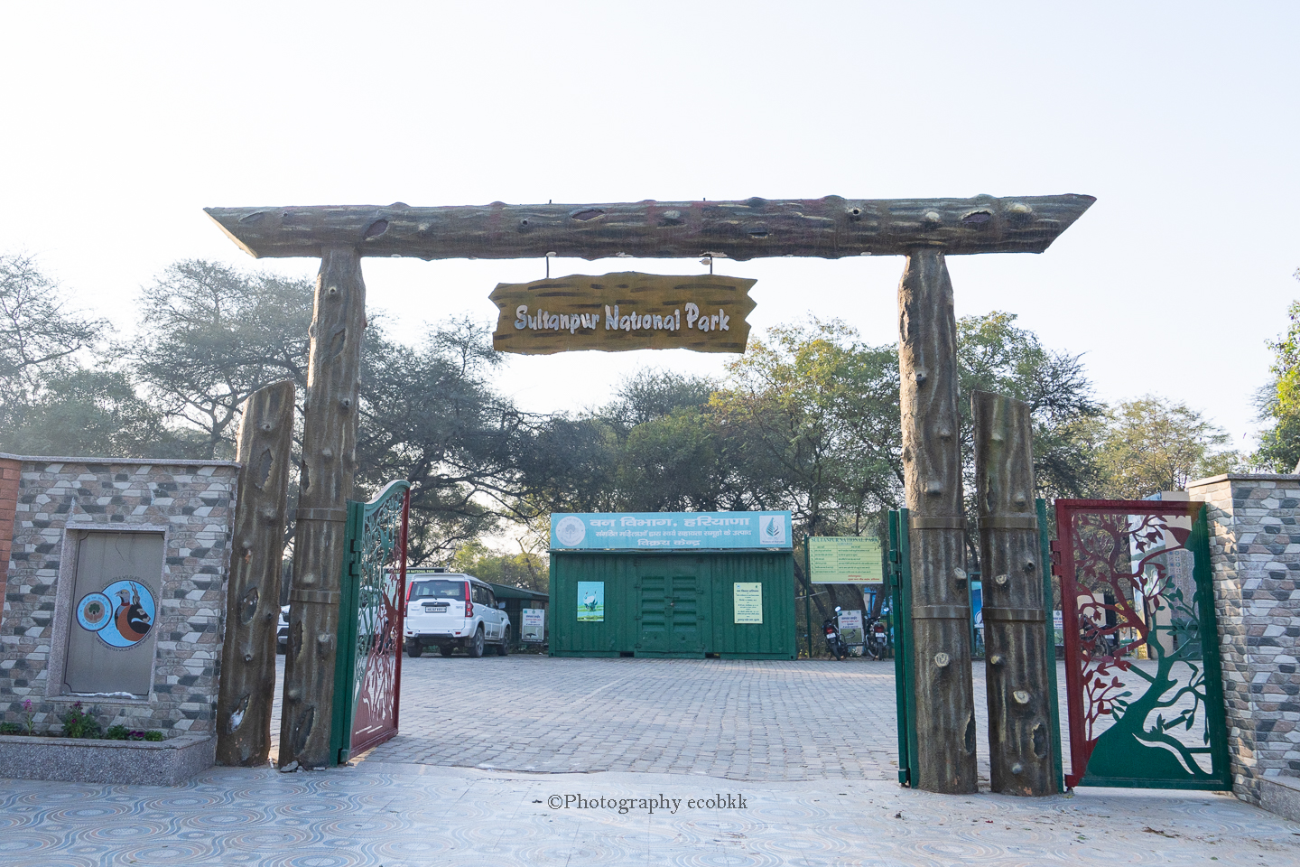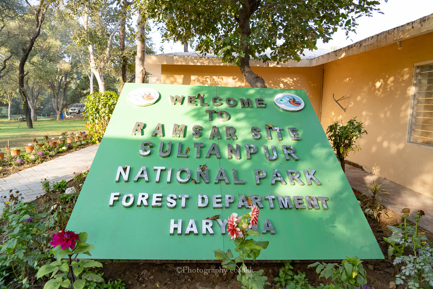 「スルタンプール国立公園」は、インドのデリー首都圏のハリアナ州グルグラムに位置し、たくさんの野鳥とニルガイを観察することができる国立公園です。園内には野鳥の説明版や展望台もあり、歩きやすく舗装されています。専用車で移動することも可能ですが、筆者らが訪問した平日の日中は、歩いて移動している人のほうが多いかなぁ、という印象でした。