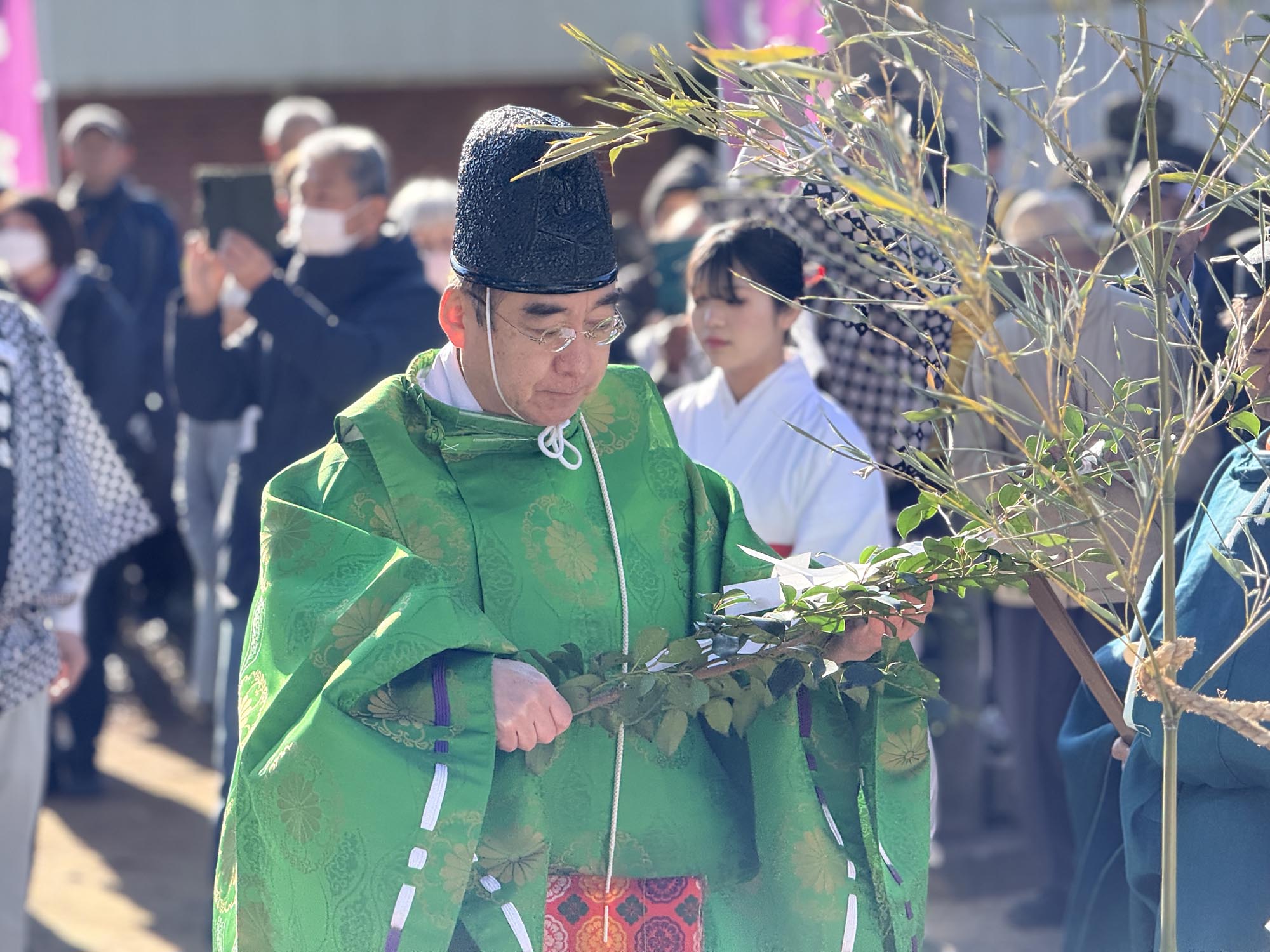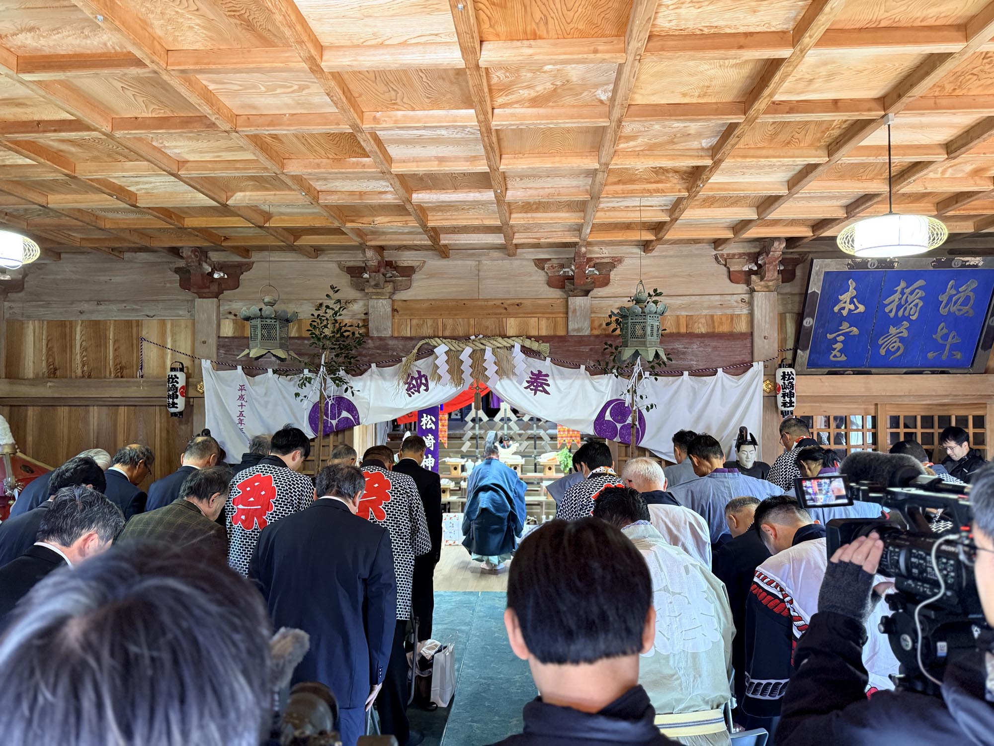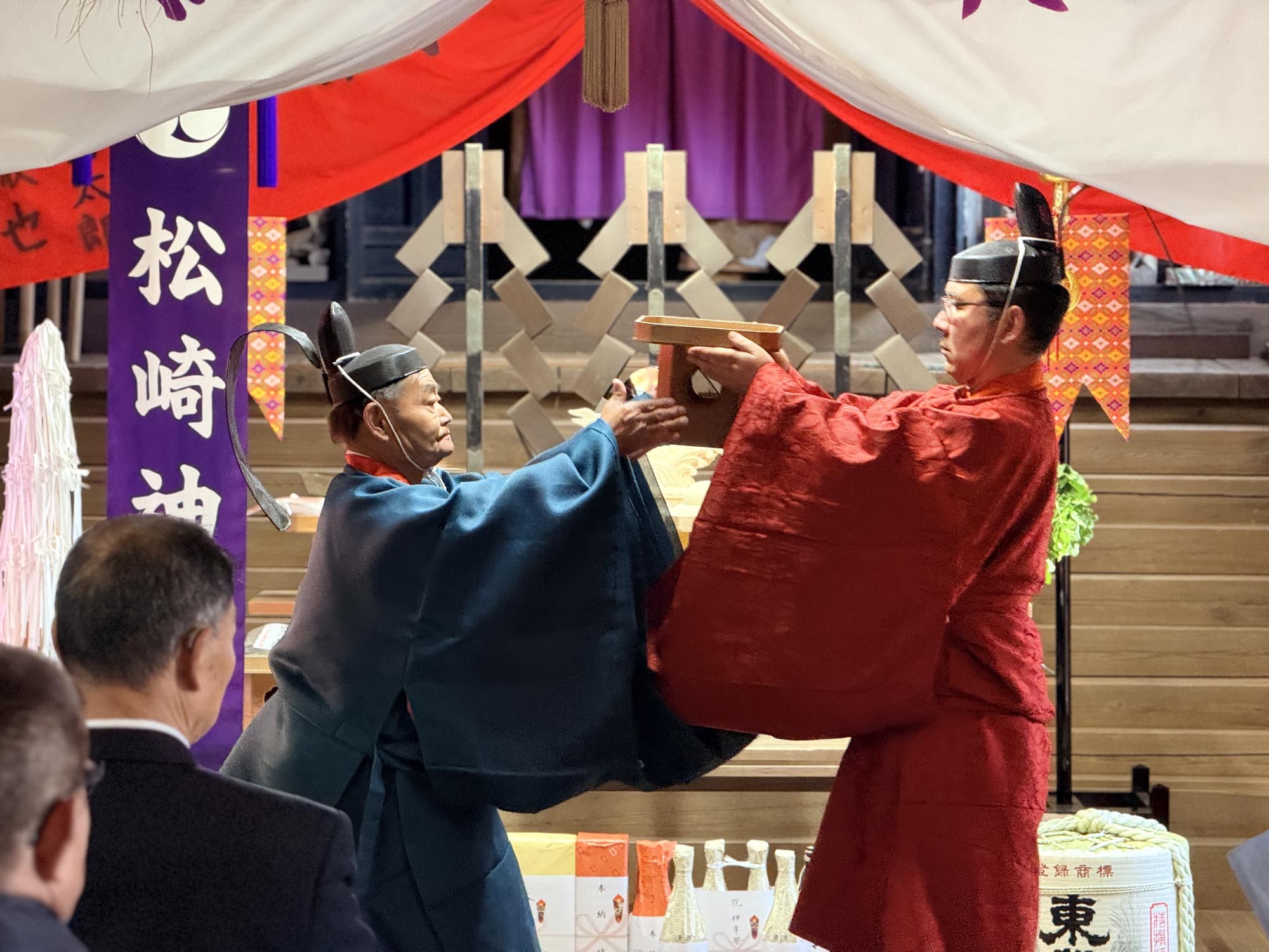 狩衣を纏い、烏帽子を被った神官が手洗所の前で修祓(しゅばつ)の儀を行います。続いて巫女を携えて境内を進み、本堂のなかへ。神様に食事を供える献饌(けんせん)の儀、祝詞の奏上、そして玉串奉奠(たまぐしほうてん)として榊の枝を供え、感謝を捧げます。