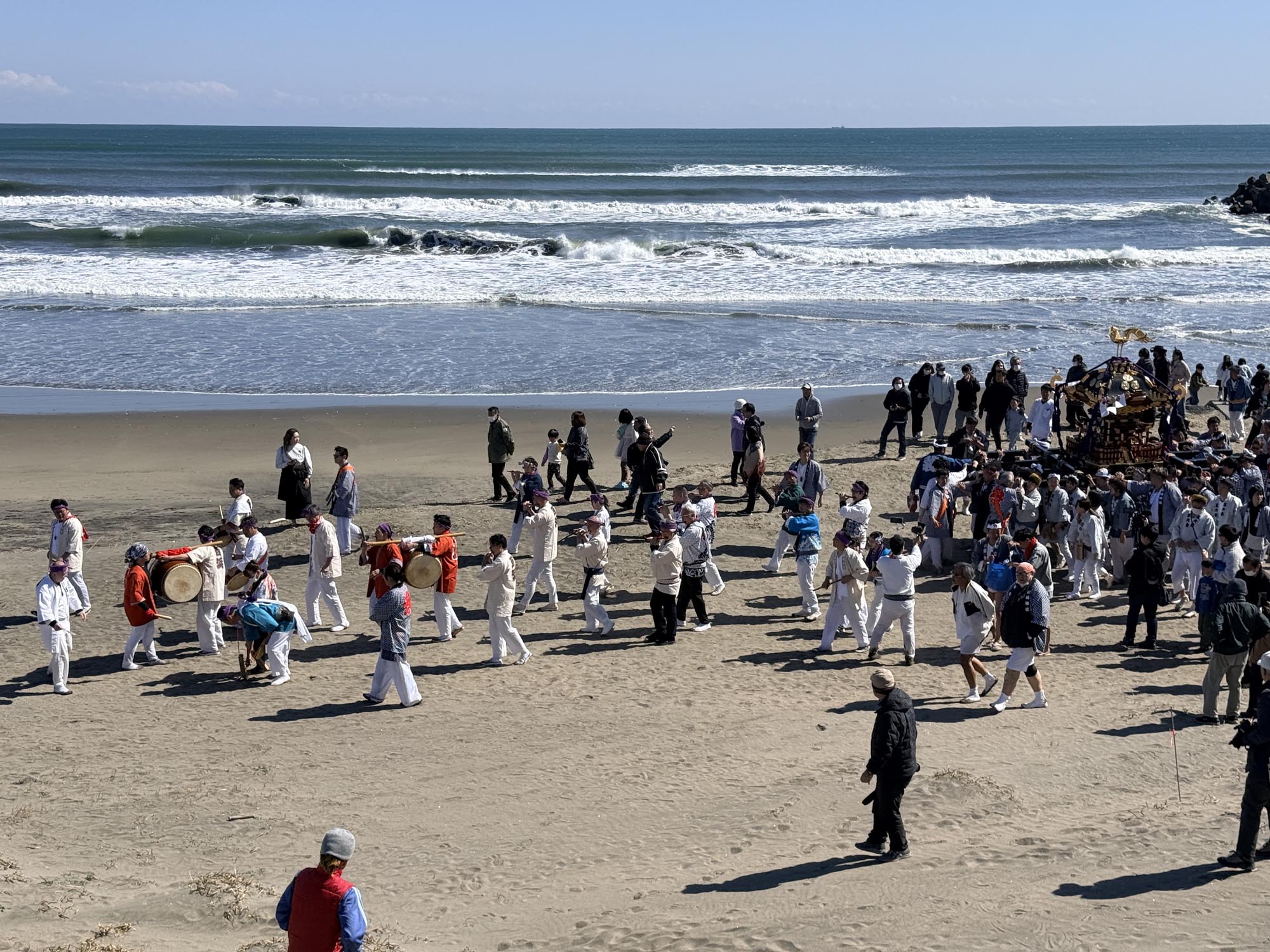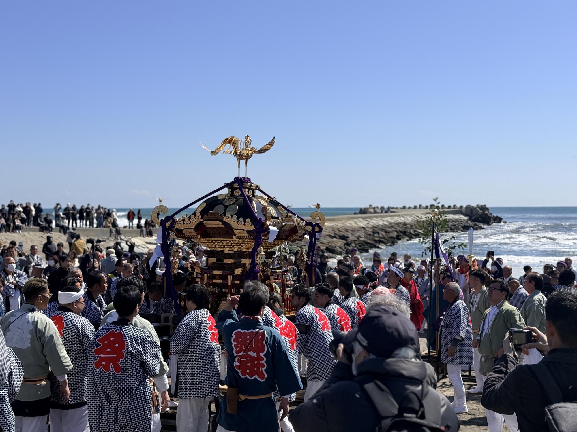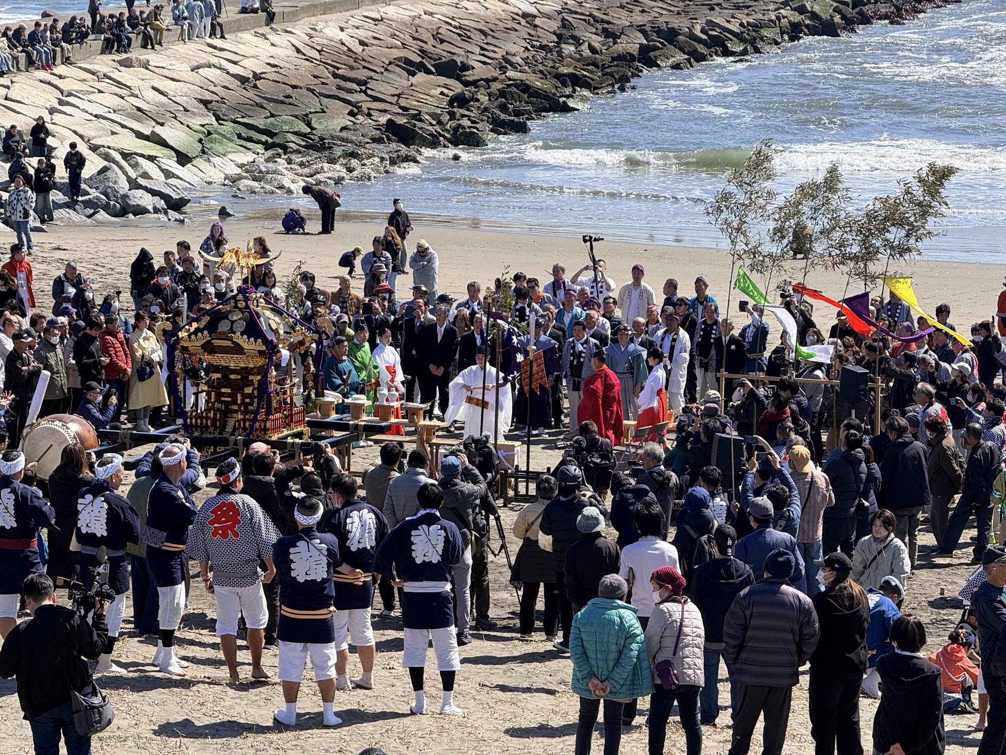 浜へ到着すると、そこにはすでに大勢の人が集まっていました。しばらくして神輿とお囃子隊が到着し、祭壇がセッティングされた浜辺で本祭が執り行われます。