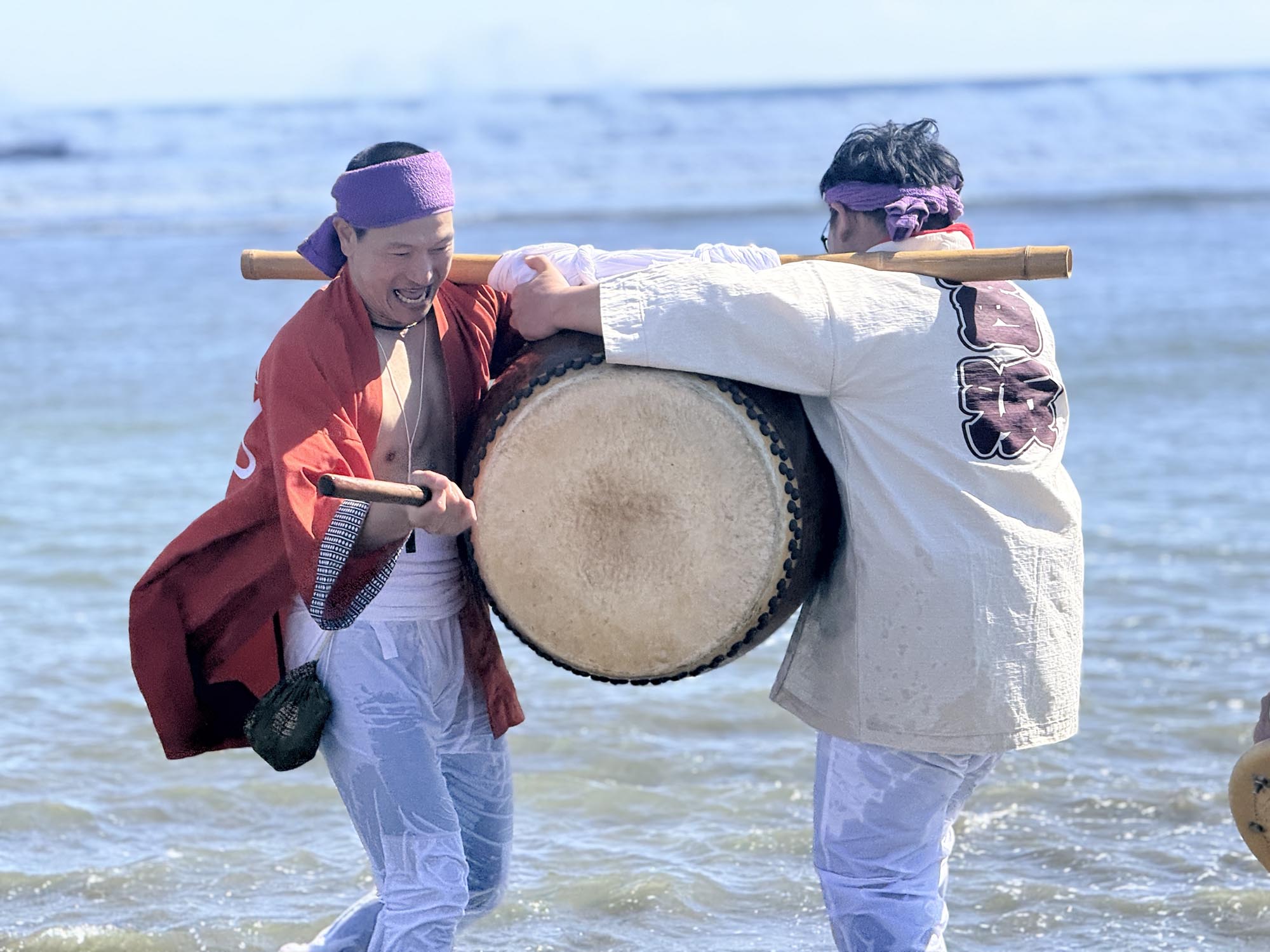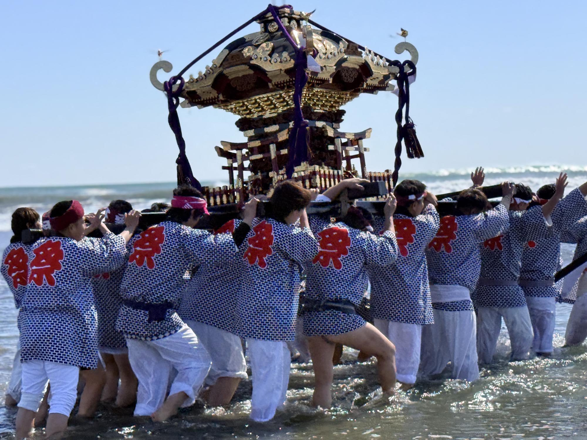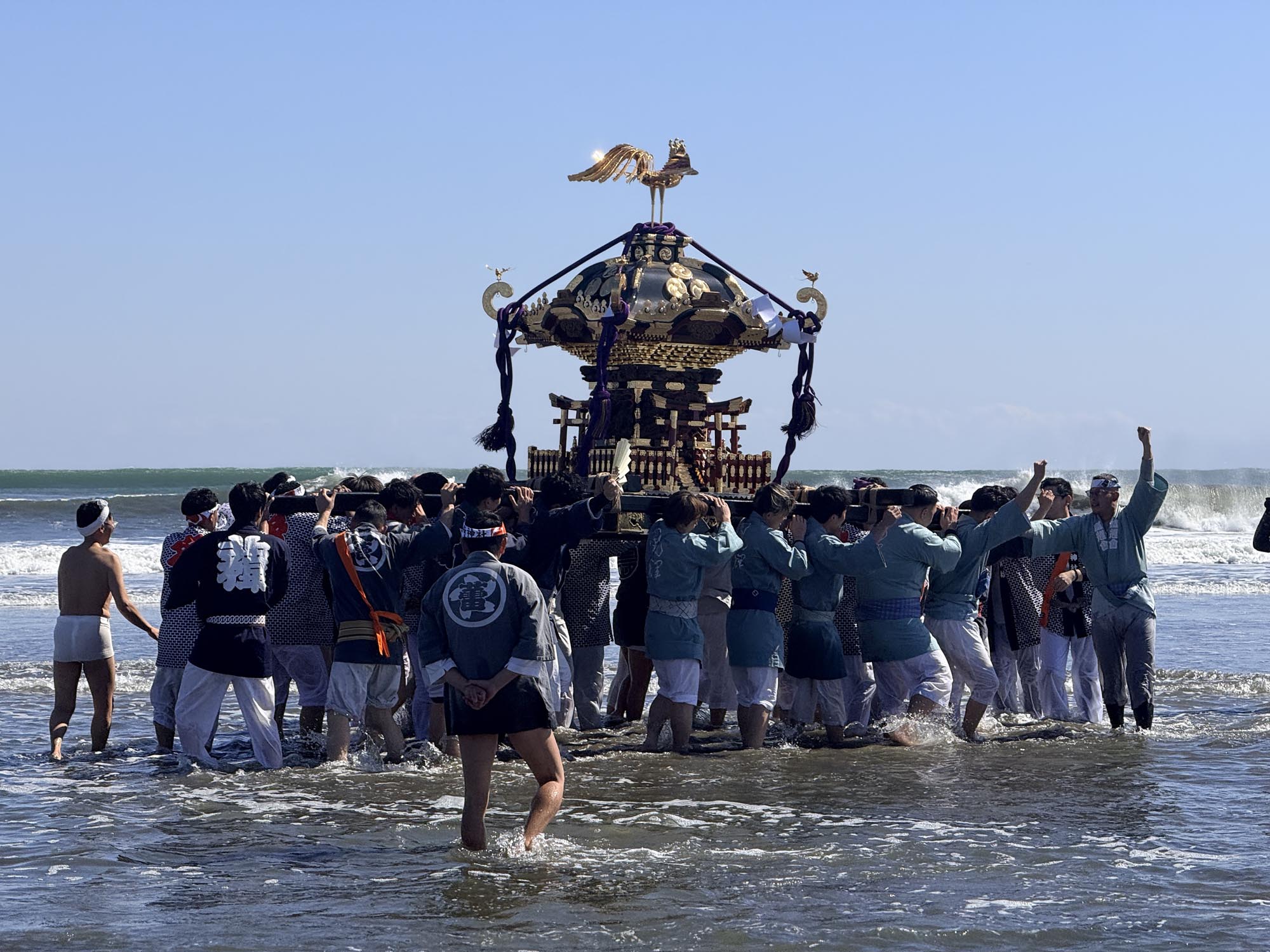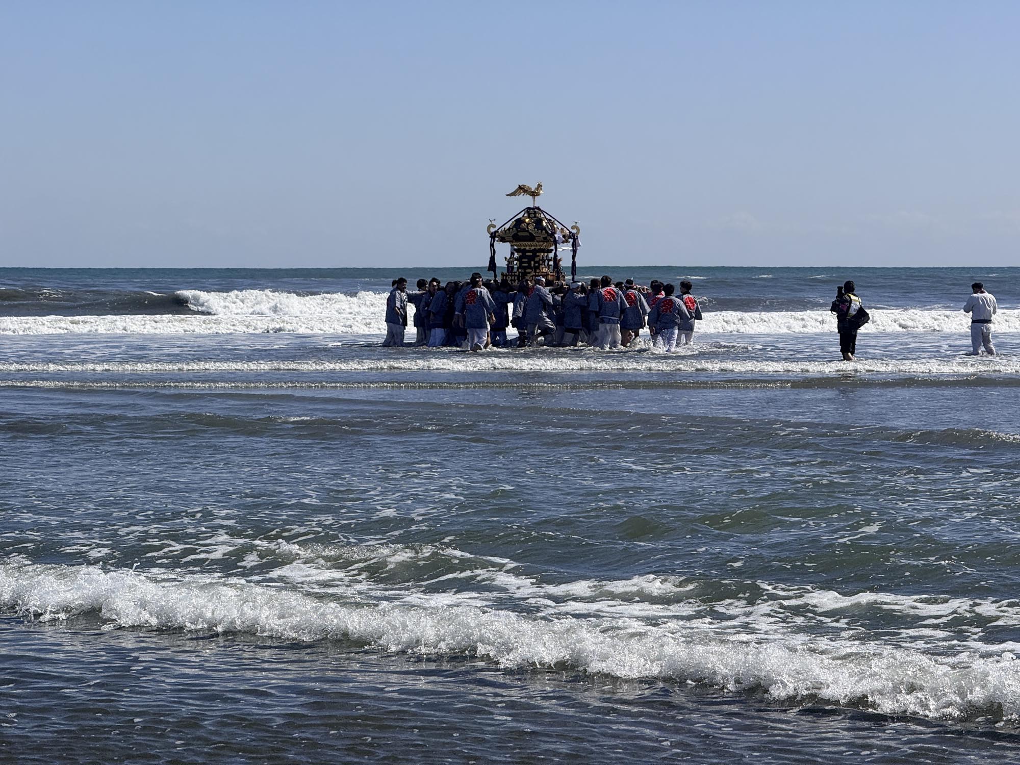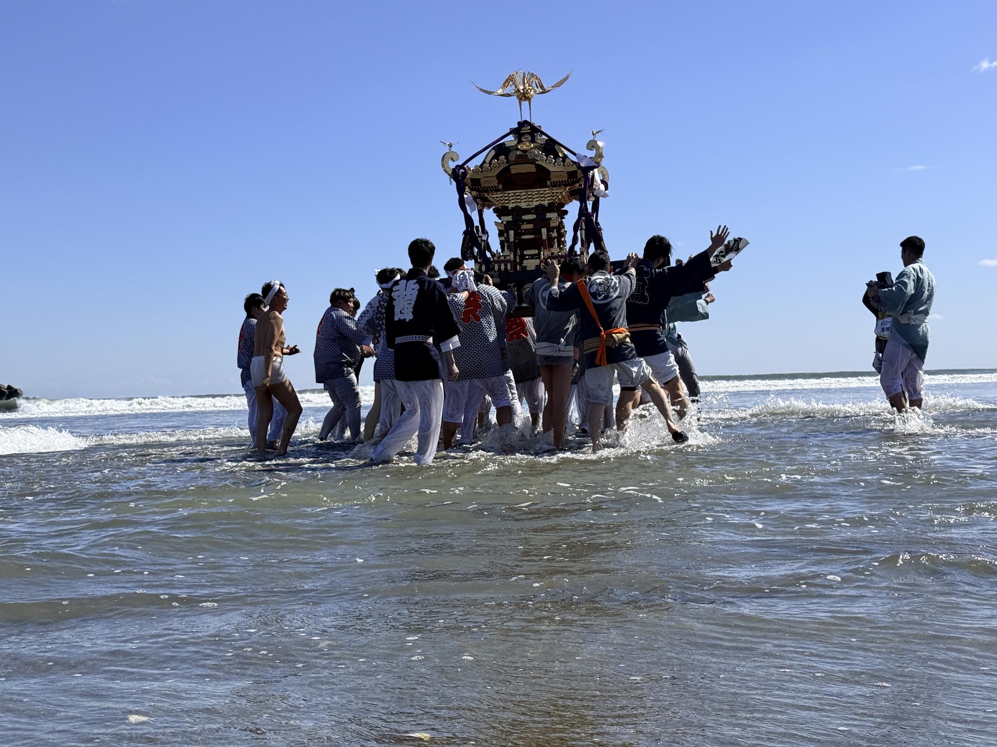 思った以上に浅瀬が続いており、神輿は遠くへ遠くへと進んでいきます。波に打たれながらも、威勢のいい掛け声が響き渡っていました。