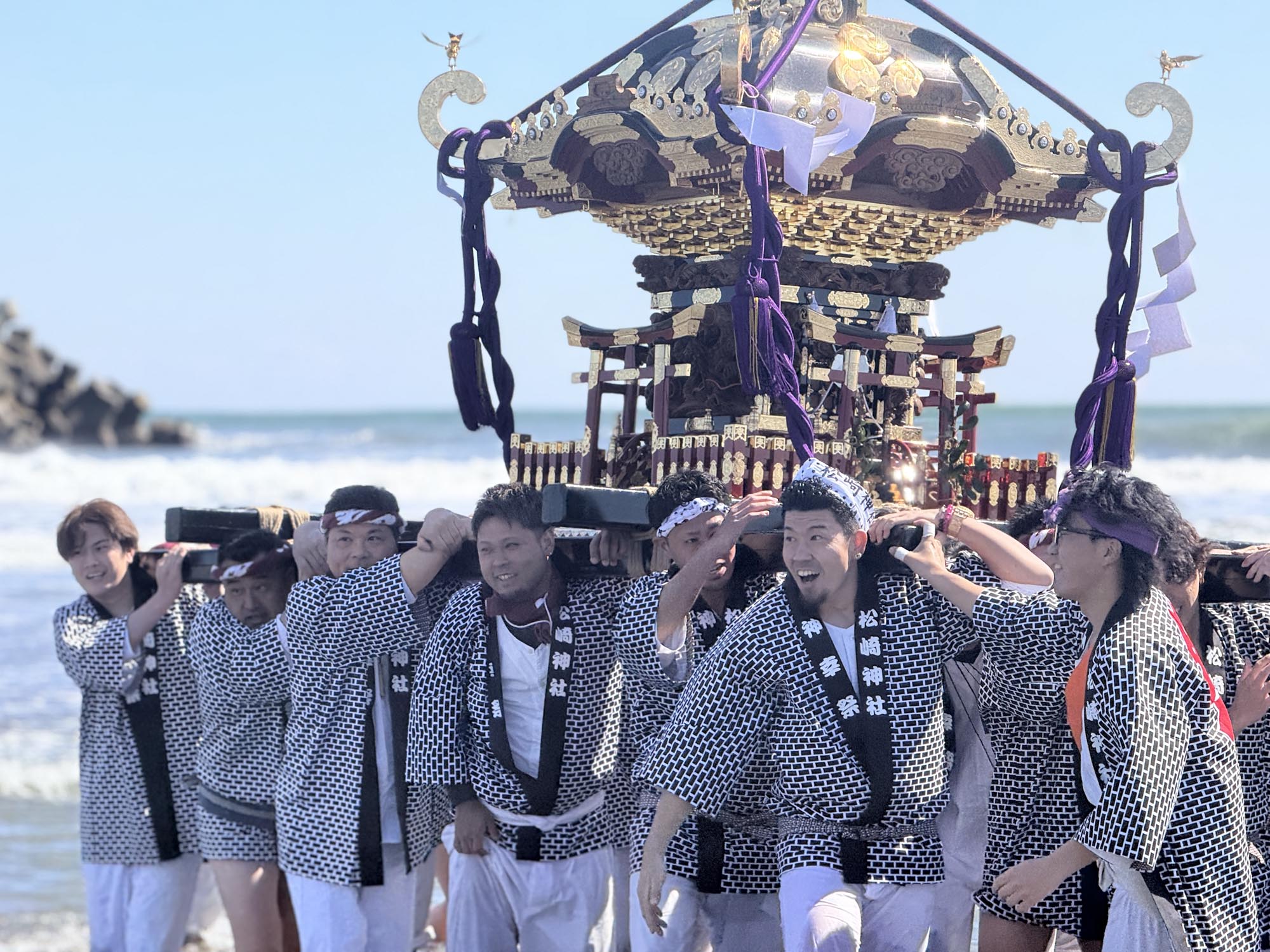海のなかで揉まれ、十分に自然の力と清めを受けた神輿は再び陸へと上がり、長い旅路を終えて松崎神社へと帰還していきました。