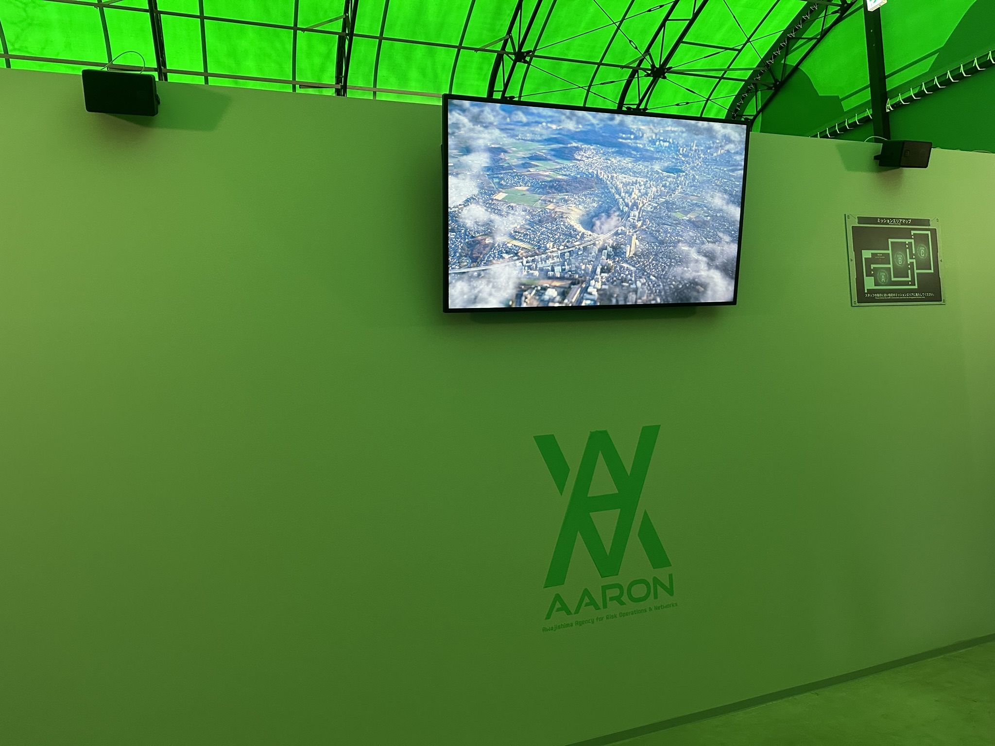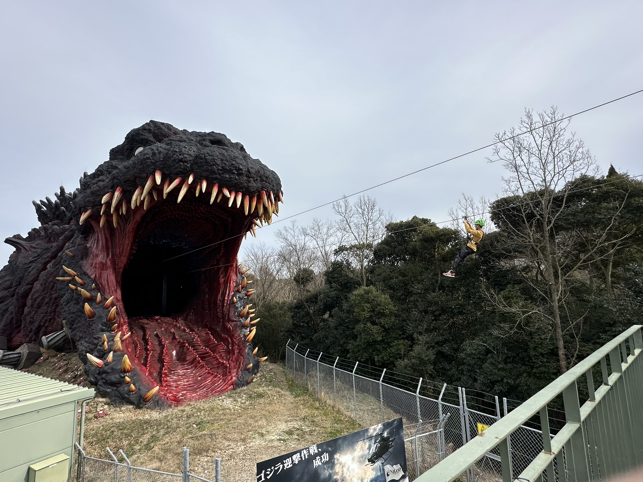 「ゴジラ迎撃作戦」は、全長約120mのゴジラをテーマにした体験型アトラクションです。参加者は架空の組織「国立ゴジラ淡路島研究センター(NIGOD)」の隊員となり、ジップラインや対ゴジラシューティングなどを体験しながらゴジラに立ち向かうストーリーを体感できます。