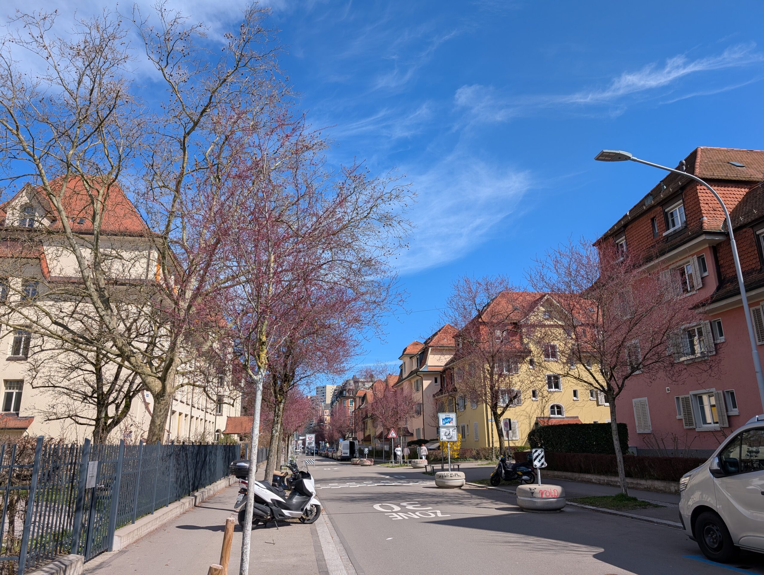3月中旬、チューリッヒに春の兆しが届いています。ポカポカと温かな日差しが続いたかと思えば、週末にぐっと冷え込む気まぐれな天気。そんな空模様の下、さっそく桜の名所として知られるベルタ通り(Bertastrasse)へ足を運んでみました。