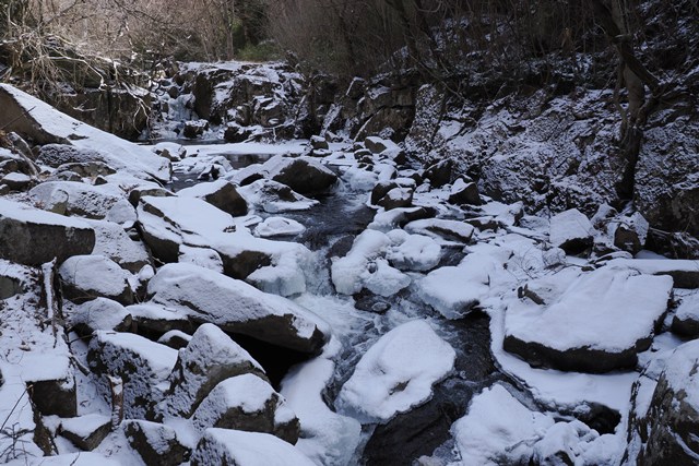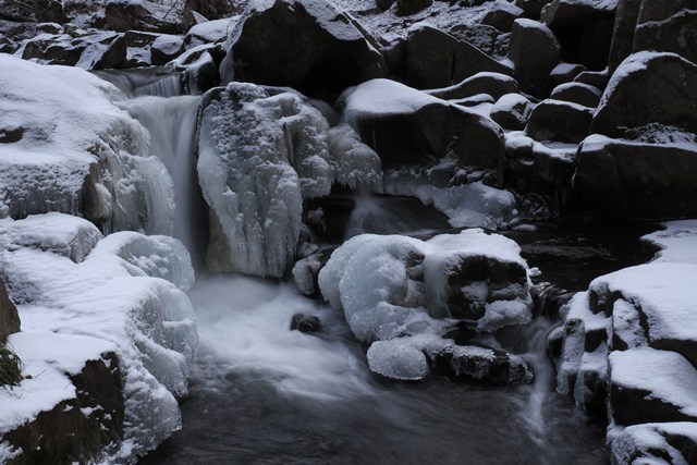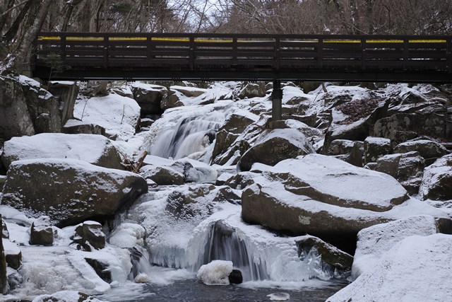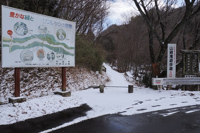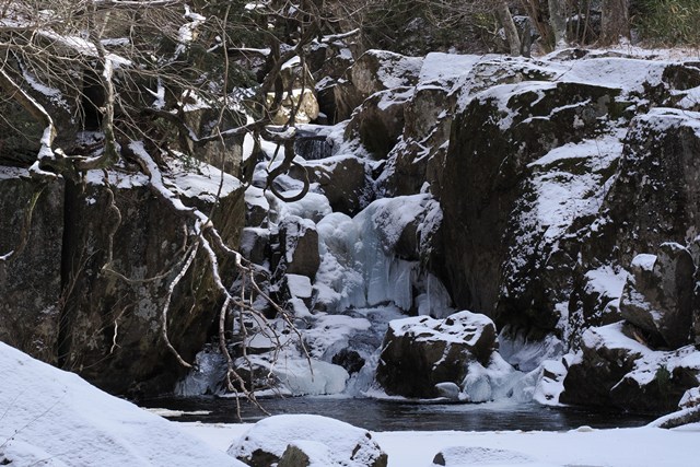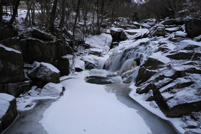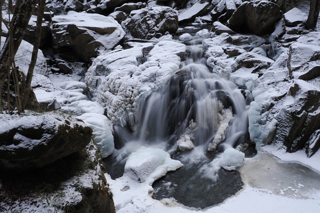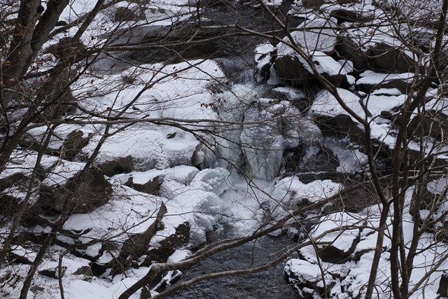 平田村は中倉地区にある山鶏滝へ。里山の一角にある小さな滝ですが、アクセスの良さも相まって人気があります。今回は約4年ぶりに冬季の様子を伺いました。