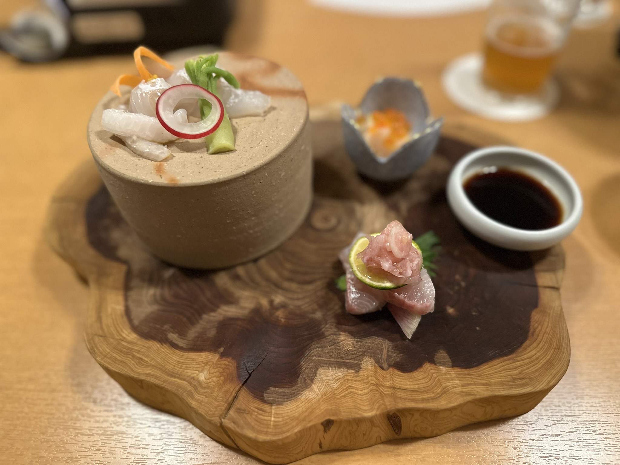 淡路島は古くから「御食国(みけつくに)」として知られ、海と山の恵みに恵まれた食材の宝庫です。発酵や燻製を取り入れた創作和食のコースでは、鮑や鰆炙り寿司、伊邪那美黒牛の串焼きなど、島の旬の味覚を楽しめます。