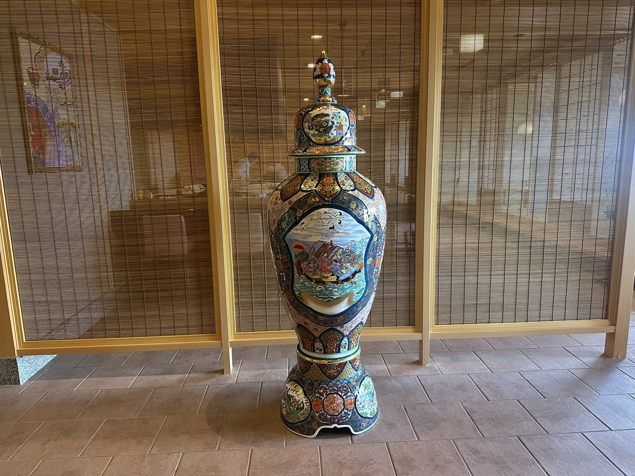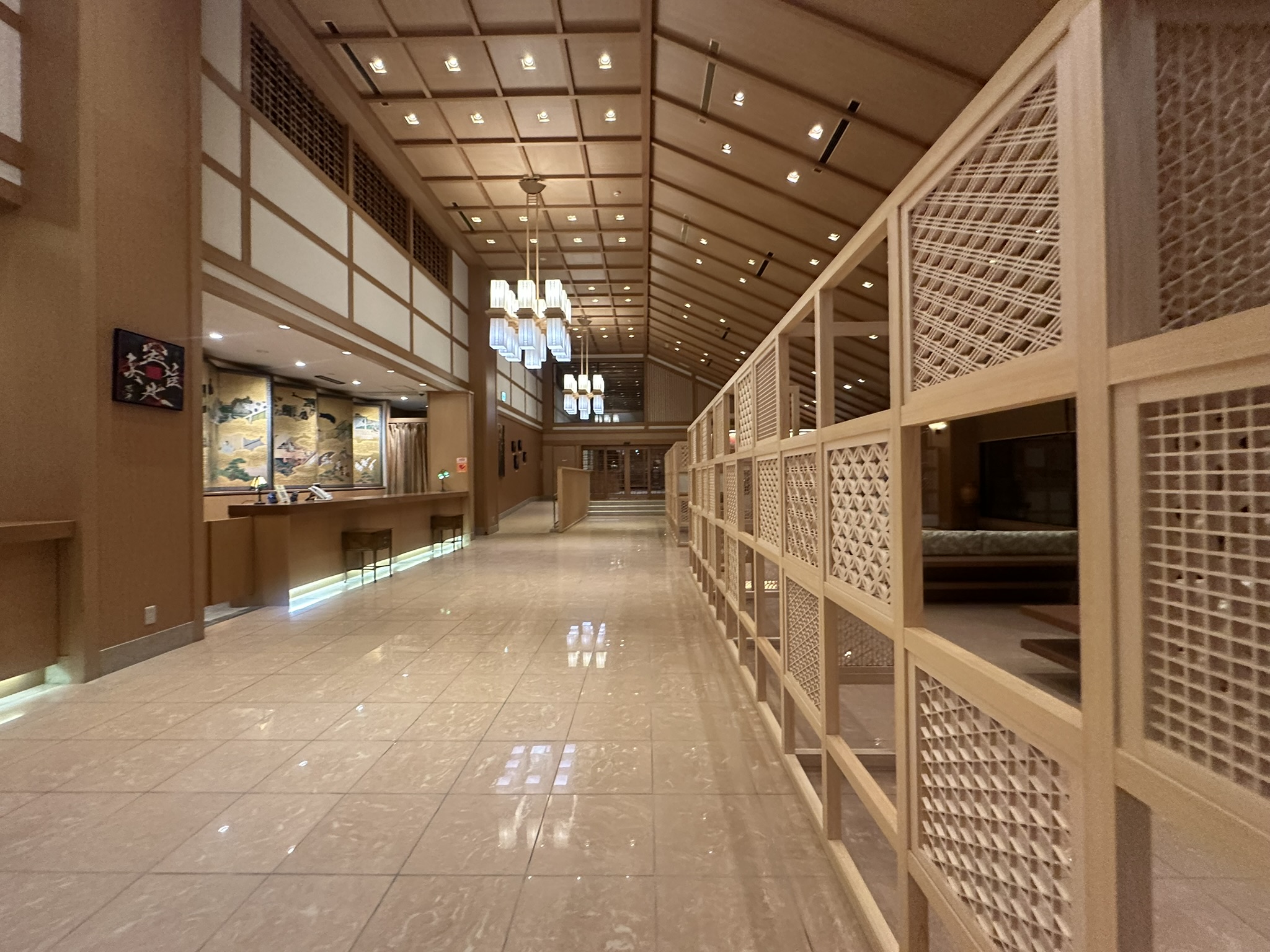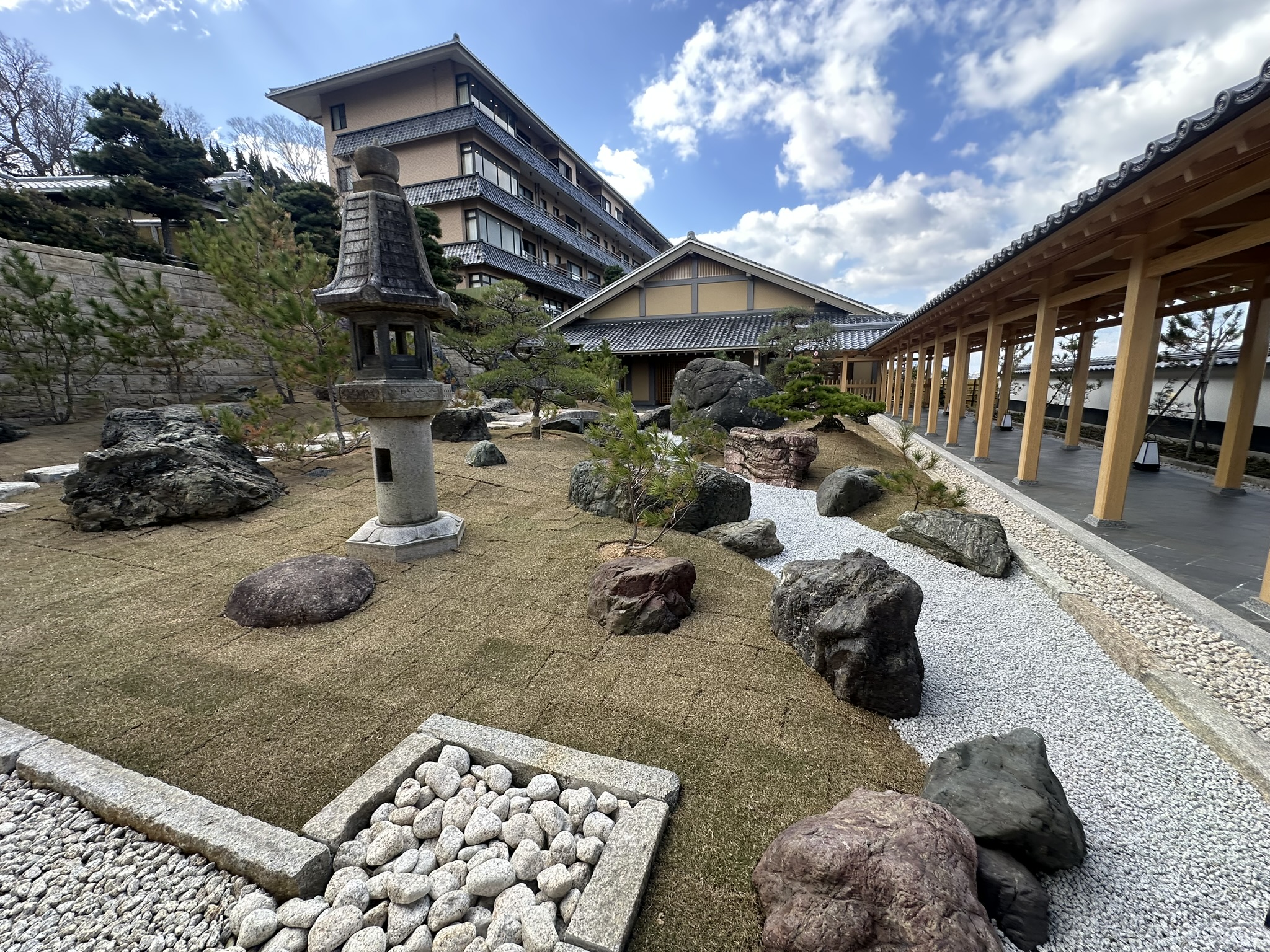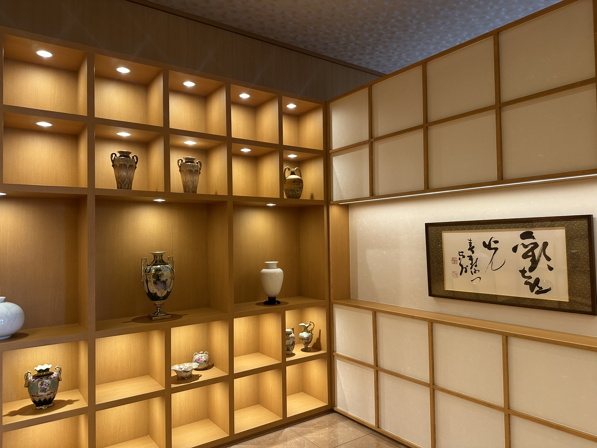 館内には石に刻まれた「洗心和方」、回廊、日本庭園、有田焼の大壺、タニハタの組子など、日本の伝統美が随所に散りばめられています。