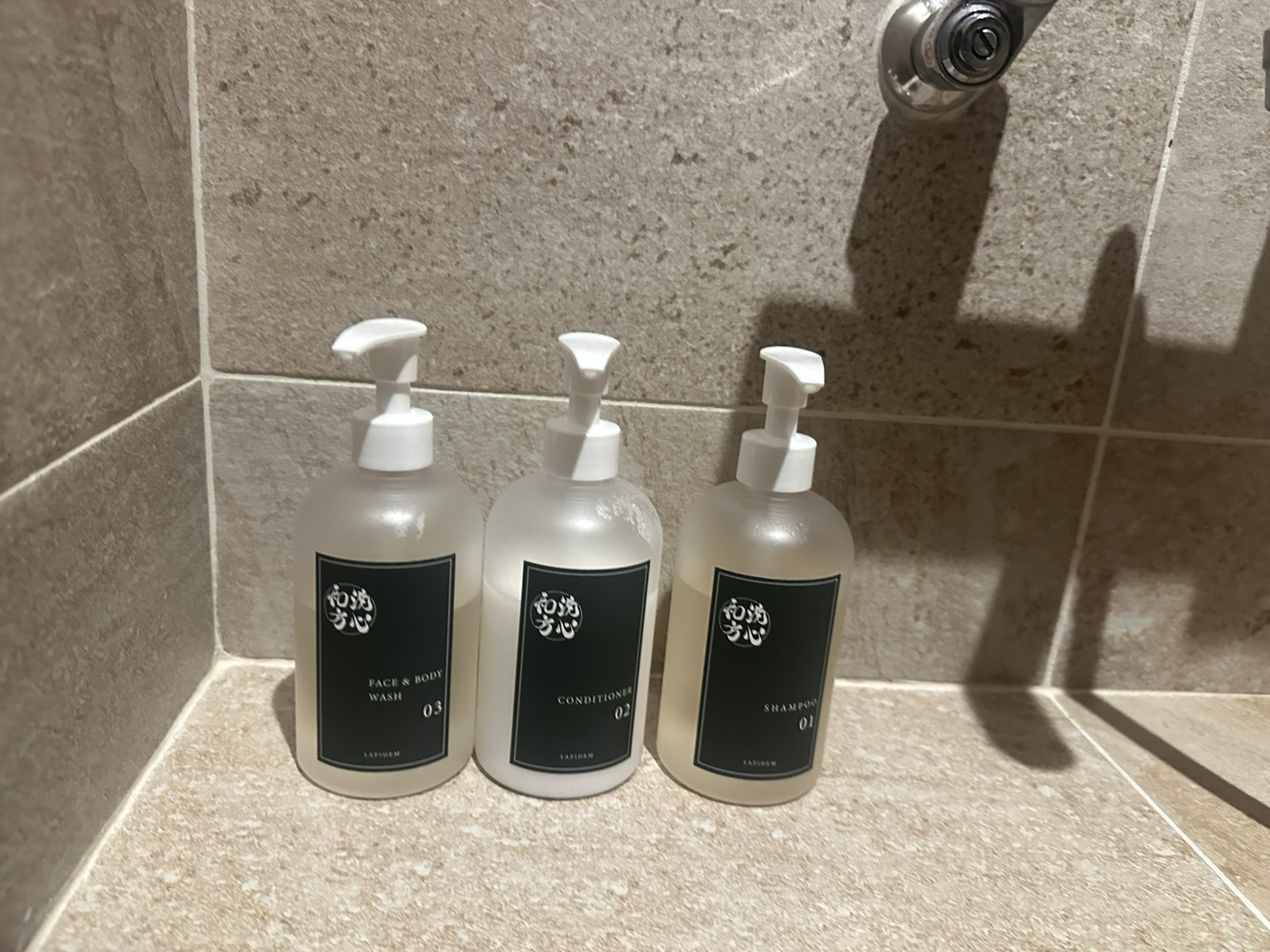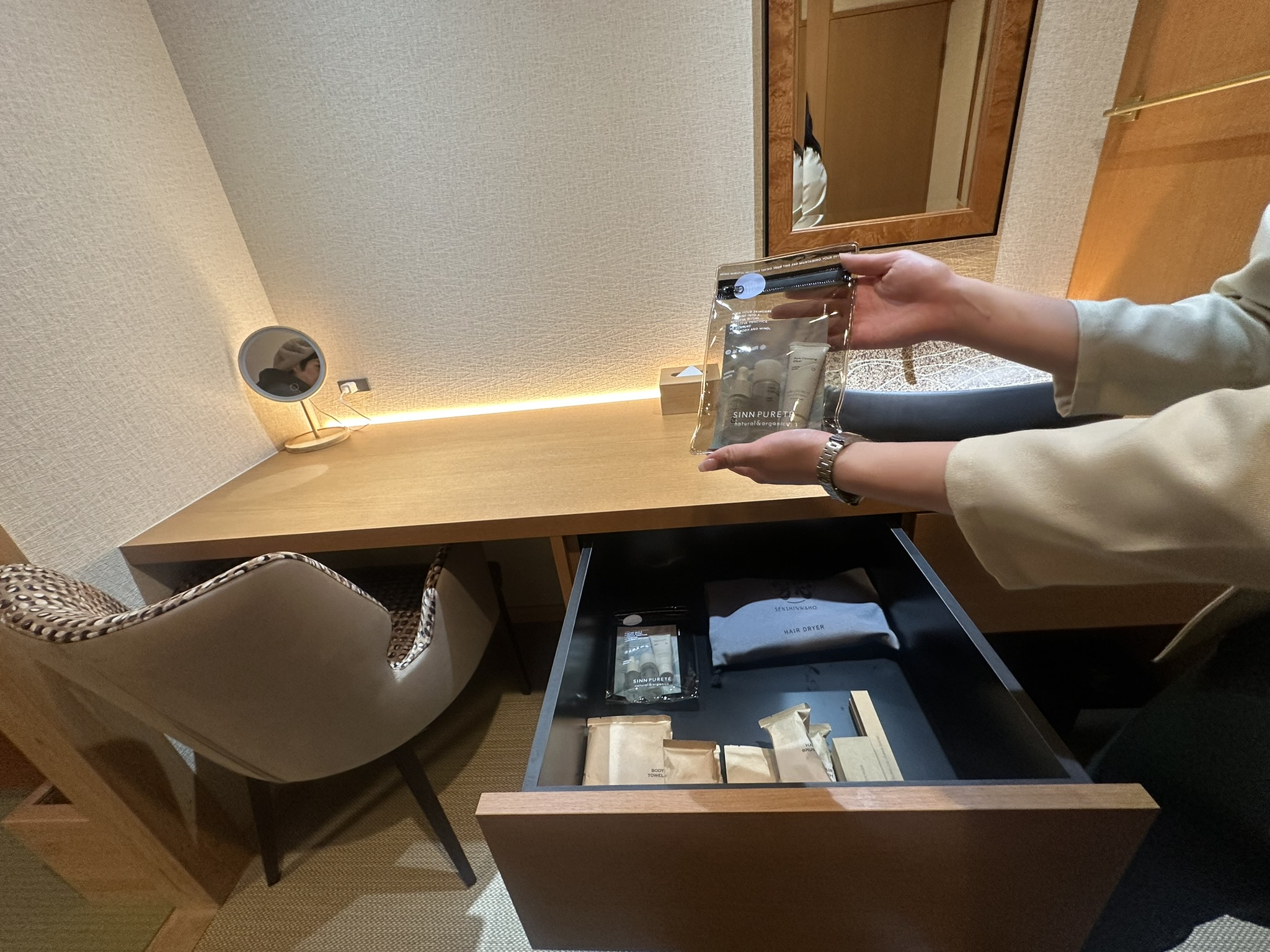 アメニティは基礎化粧品から基本的なホテル用品まで揃っており、必要最低限の持ち物は衣類だけで十分な内容です。