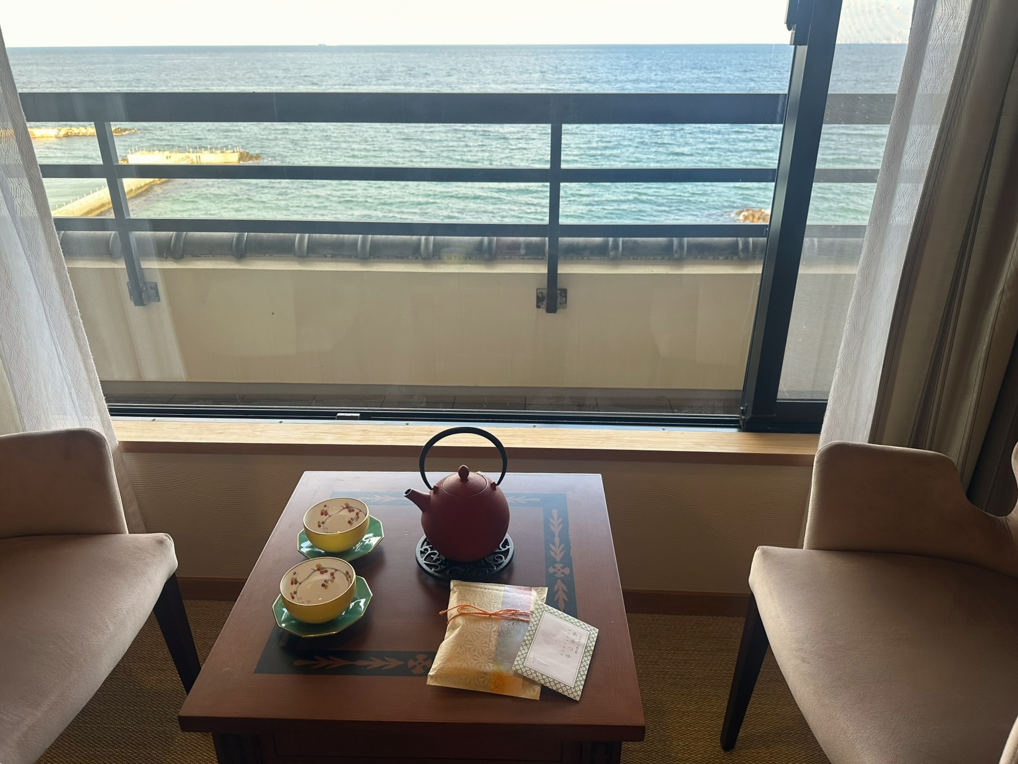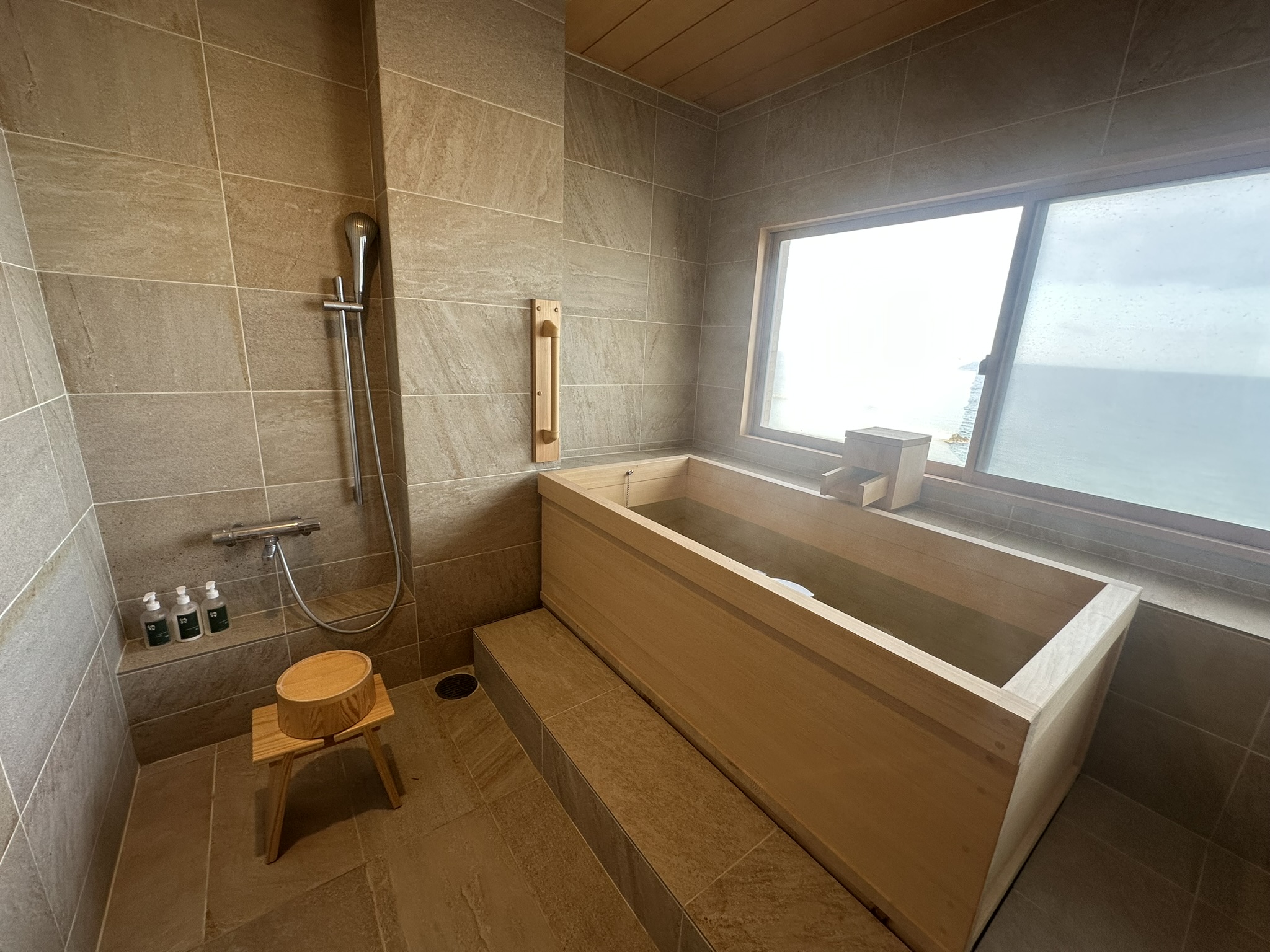 時間とともに移ろう空や海の色を眺めながら、心が落ち着く空間です。客室には檜風呂もあり、浴室から海を眺めながらゆったり過ごせます(客室風呂は温泉ではありません)。