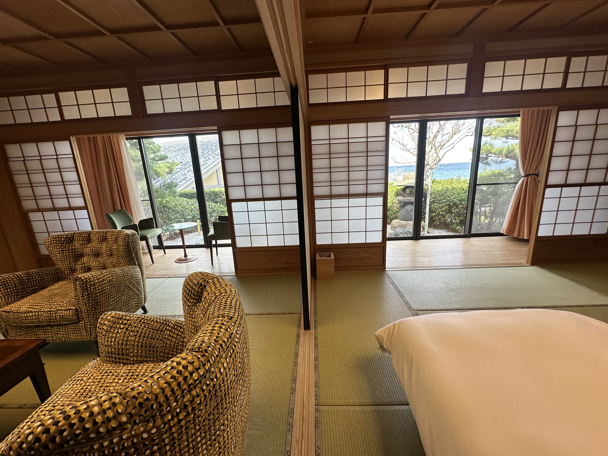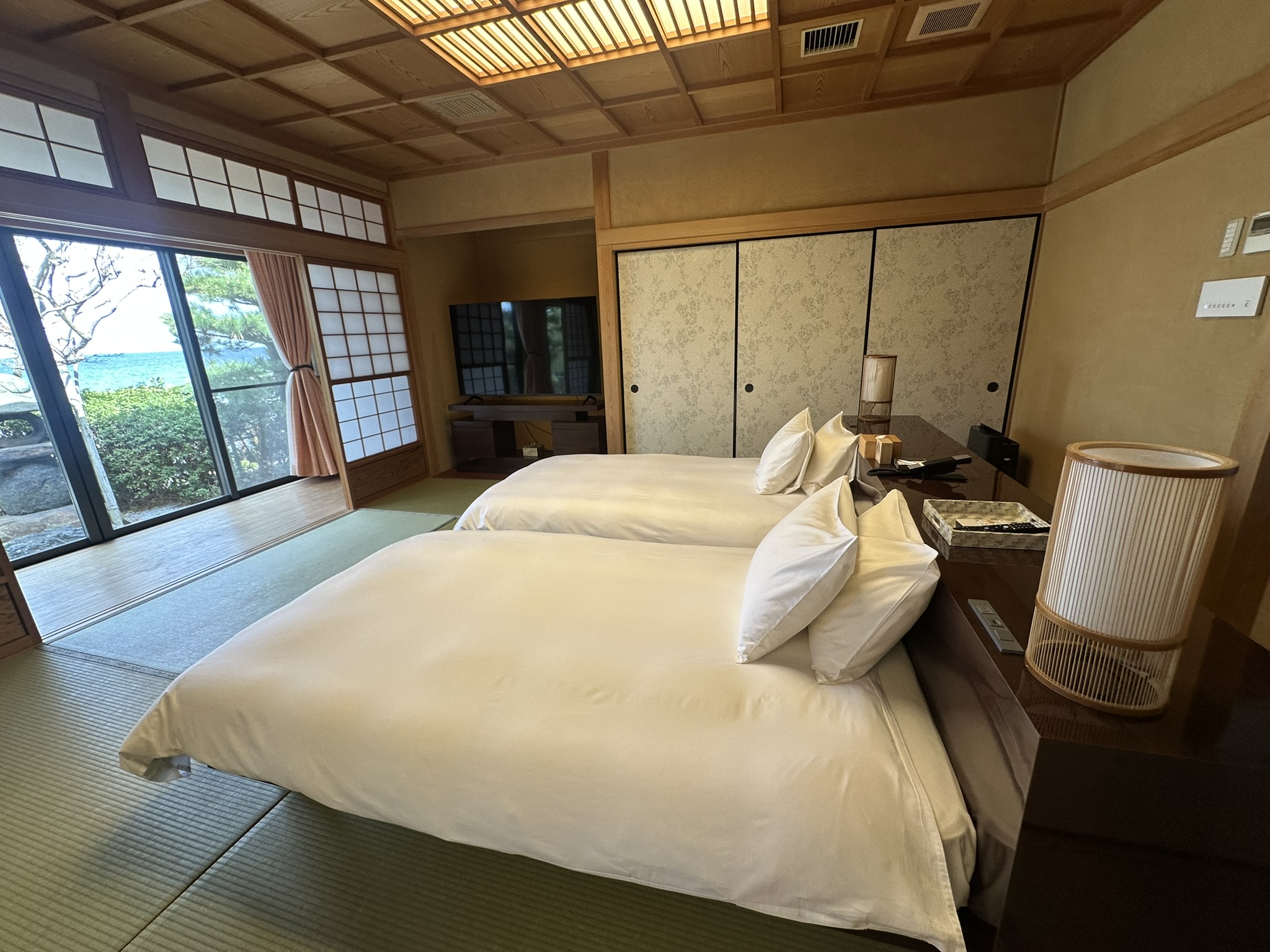 洗心和方の建物は 5階建て で、全室オーシャンビュー。宿泊した展望風呂付きデラックスルーム(約44㎡)からは瀬戸内海を一望できるようになっています。