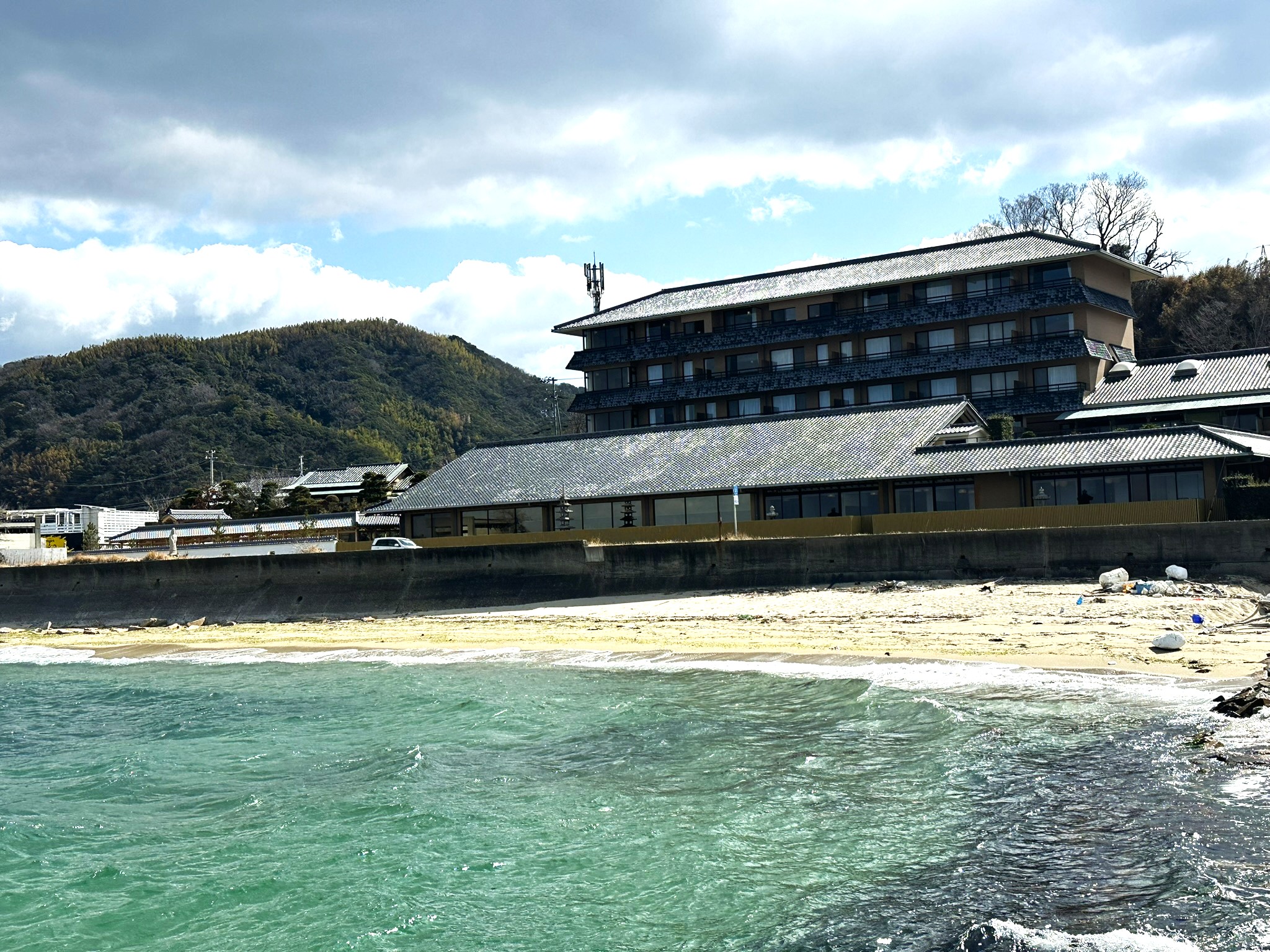 宿のすぐ前には北淡県民サンビーチが広がり、徒歩1分ほどで海へアクセス可能です。遠浅で穏やかな海が広がり、夏には海水浴も楽しめます。