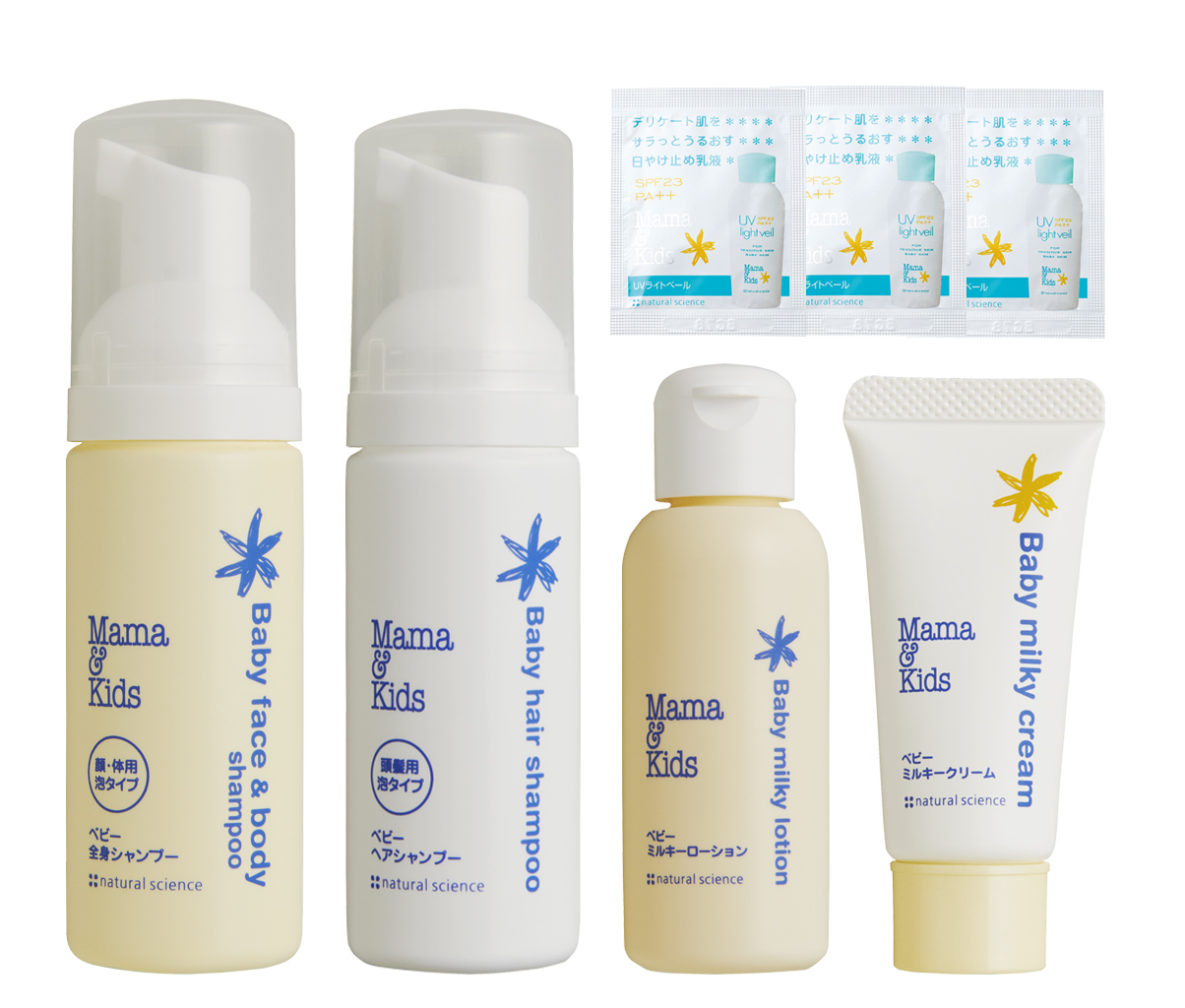 赤ちゃんのすこやかな肌を育てるベビーラインのトライアルセットはコンパクトで旅行にぴったり。セットの中には全身ベビーシャンプー、ベビーヘアシャンプー、全身保湿用のベビーミルキーローションに加え、カサカサケアに最適なクリームと肌にやさしいUVケアのサンプルも一緒にイン。全アイテムが透明なビニールポーチに入っているので、旅にもプレゼントにもぴったりです。