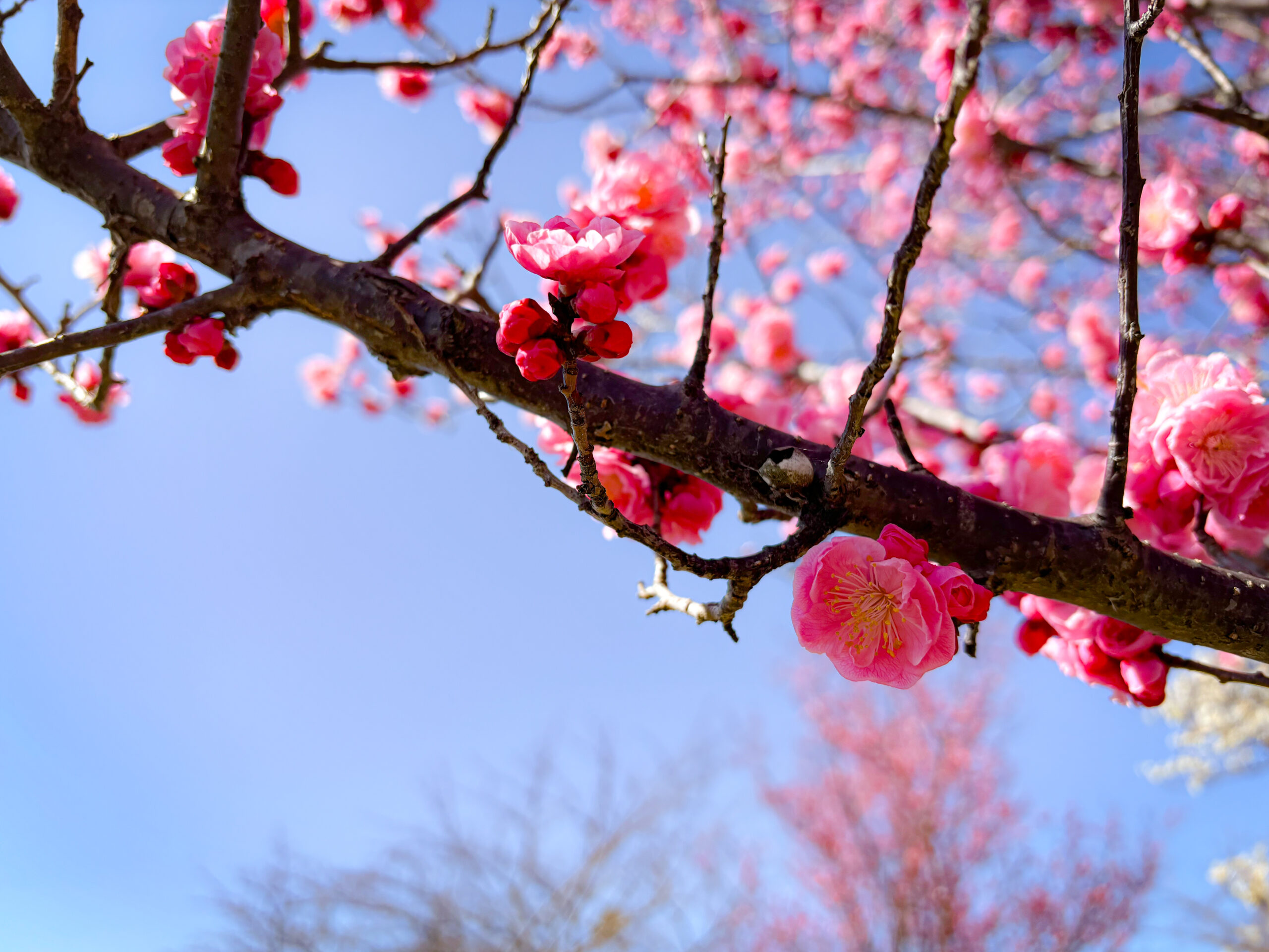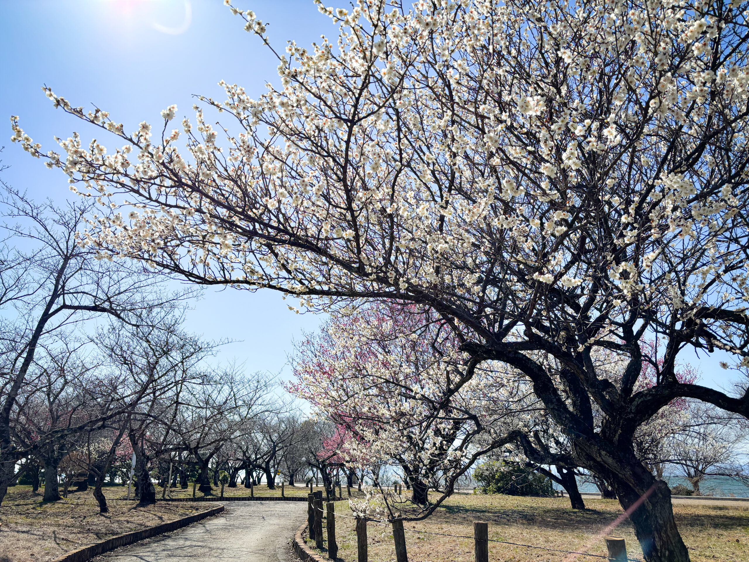 まず訪れたいのは、長浜市にある豊公園です。公園内の遊歩道をゆっくりと歩いていくと、視界が少しずつ開け、やがて目の前に琵琶湖が広がります。春の訪れを感じるこの時期は、梅の花がほころび始め、ほのかな甘い香りが風に乗って漂ってきます。足元にはやわらかな日差し、頬に触れるのはまだ少し冷たい空気。そのコントラストが季節の移ろいをやさしく教えてくれます。蕾もたくさんあり、これから満開を迎える梅をまだまだ楽しめます。
