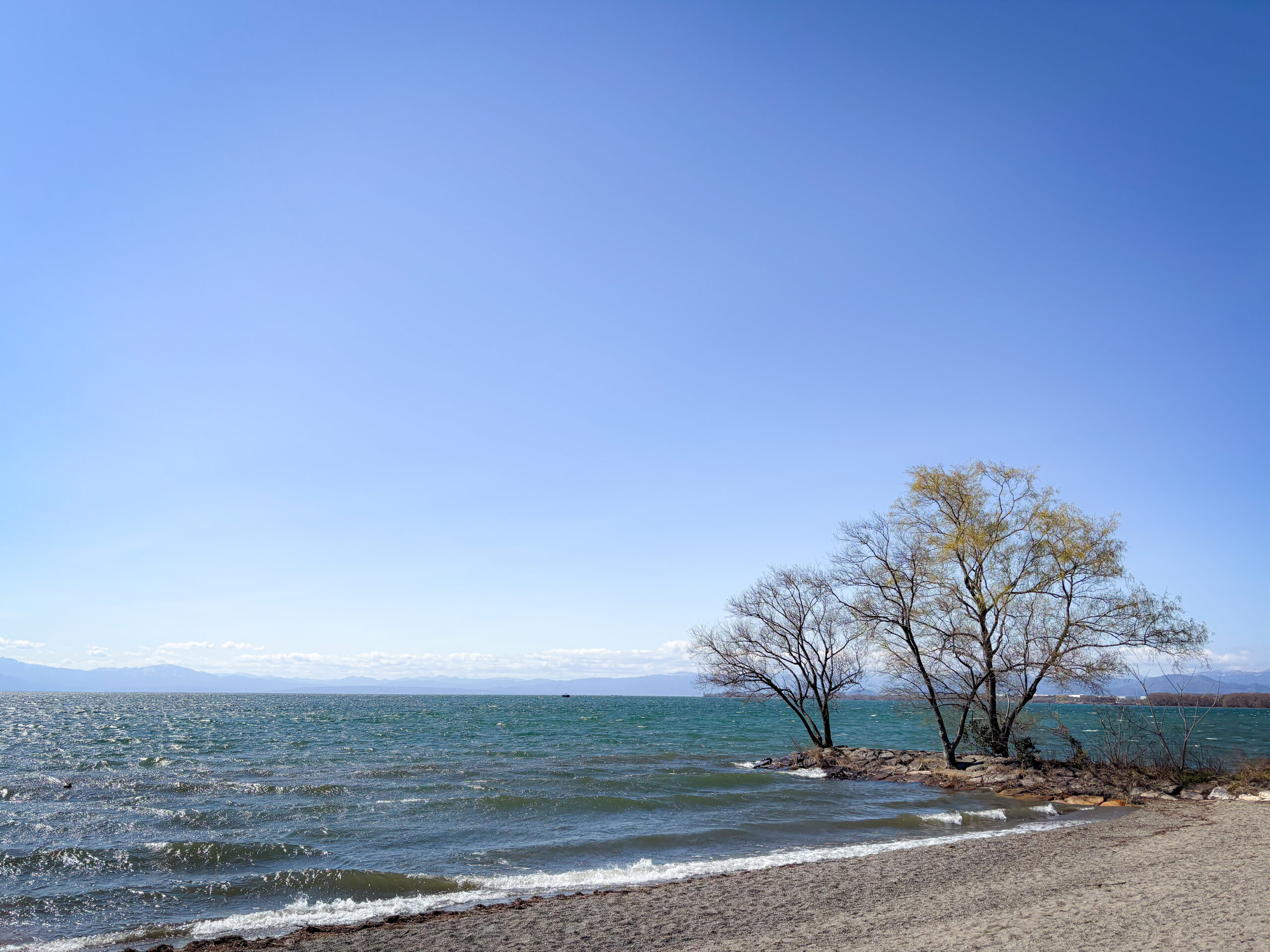 続いて紹介するのは、湖岸沿いに点在する公園のひとつ、「湖岸緑地 田村-2」です。琵琶湖の東側には「湖岸緑地」とよばれる整備された公園がいくつもあり、それぞれに異なる表情の湖景色を楽しめます。長浜から彦根へ向かう途中にある田村-2は、ドライブの合間に立ち寄るのにちょうどよい場所です。