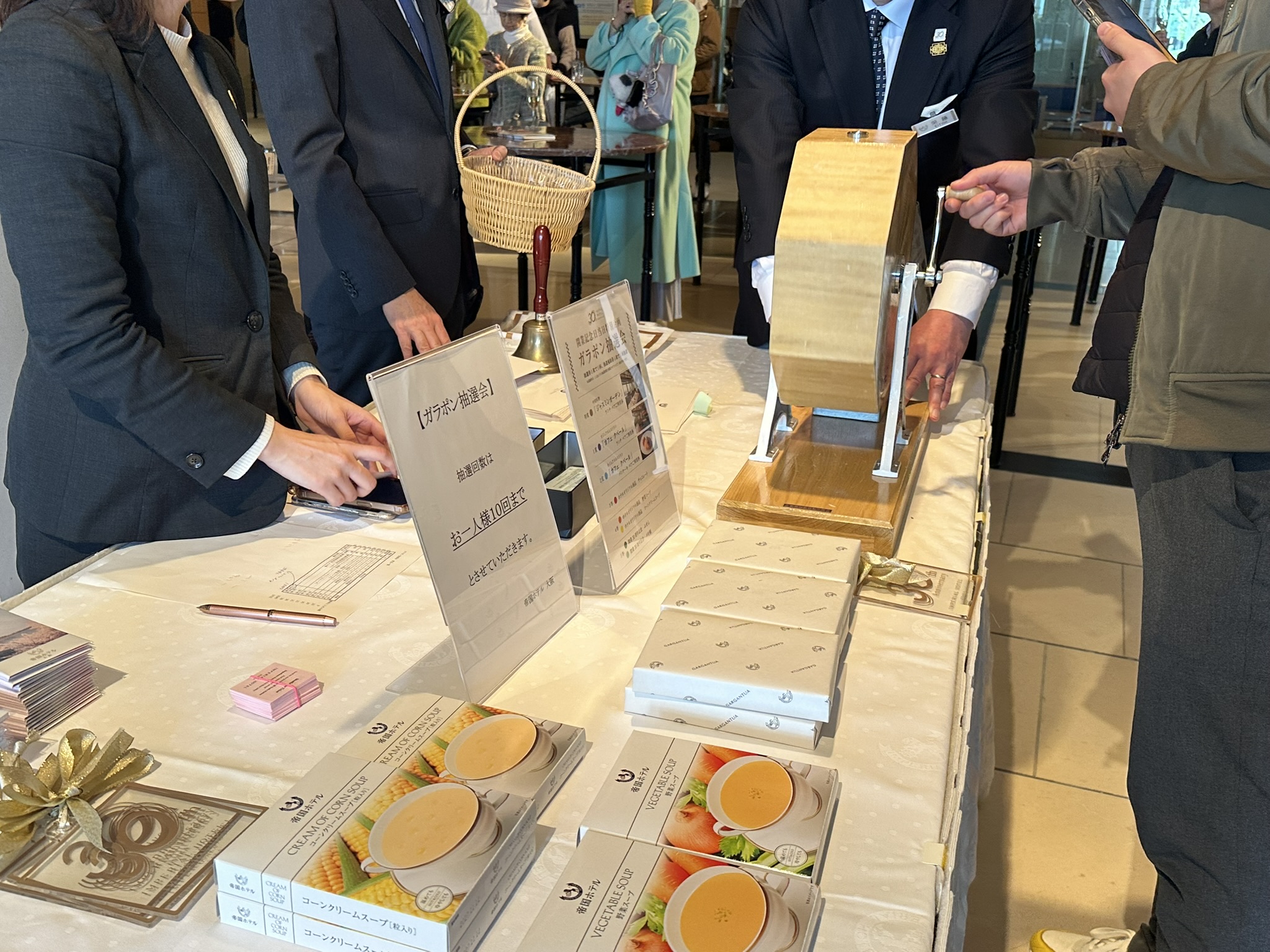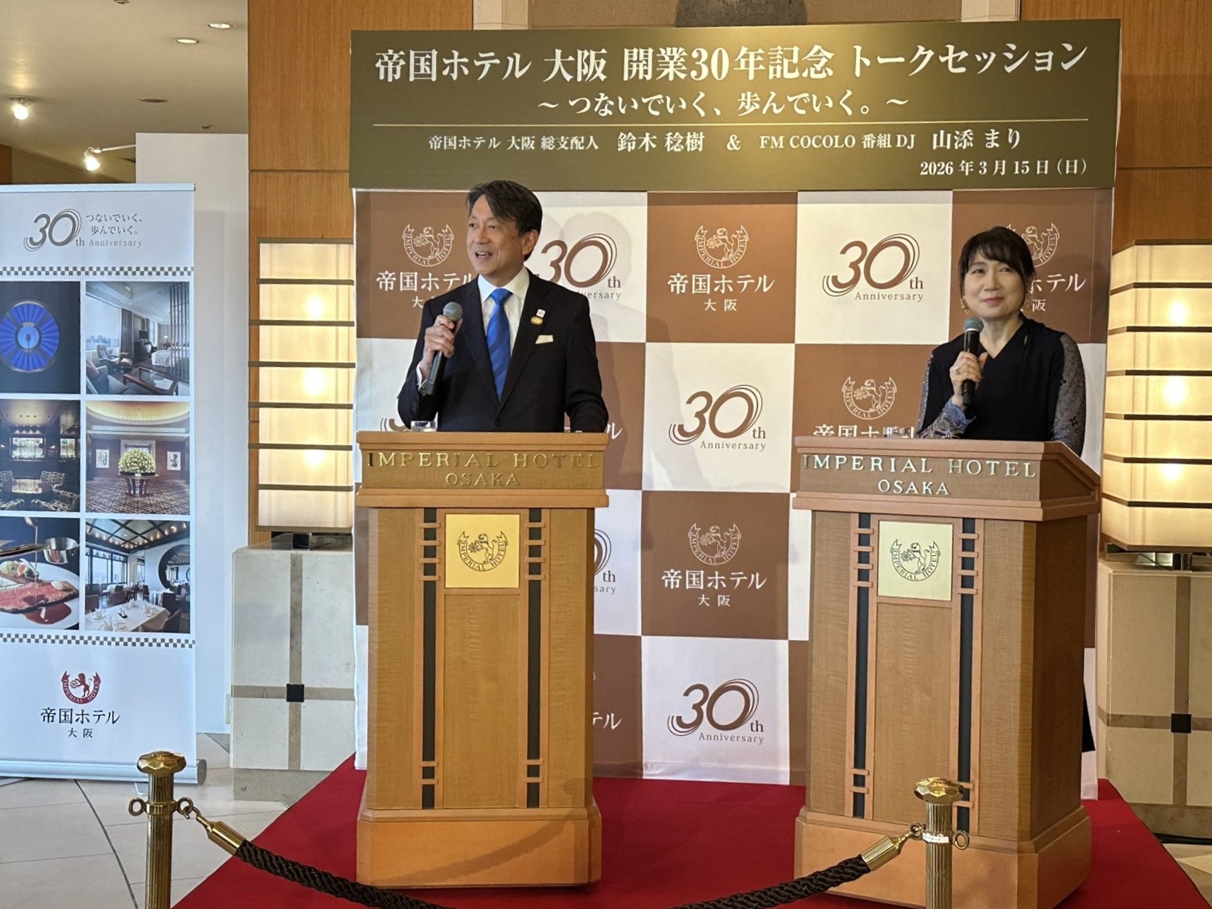 滞在のタイミングは、ちょうど30周年の節目でした。当日は1階ロビーで、鈴木総支配人とFM COCOLOの山添まりさんによるトークセッションが行われ、館内には和やかな空気が流れていました。抽選会やシャンパンサービスなど華やかな演出がありながらも騒がしさはなく、あくまで落ち着いた空気感。帝国ホテルらしい“品のある祝い方”が印象的でした。