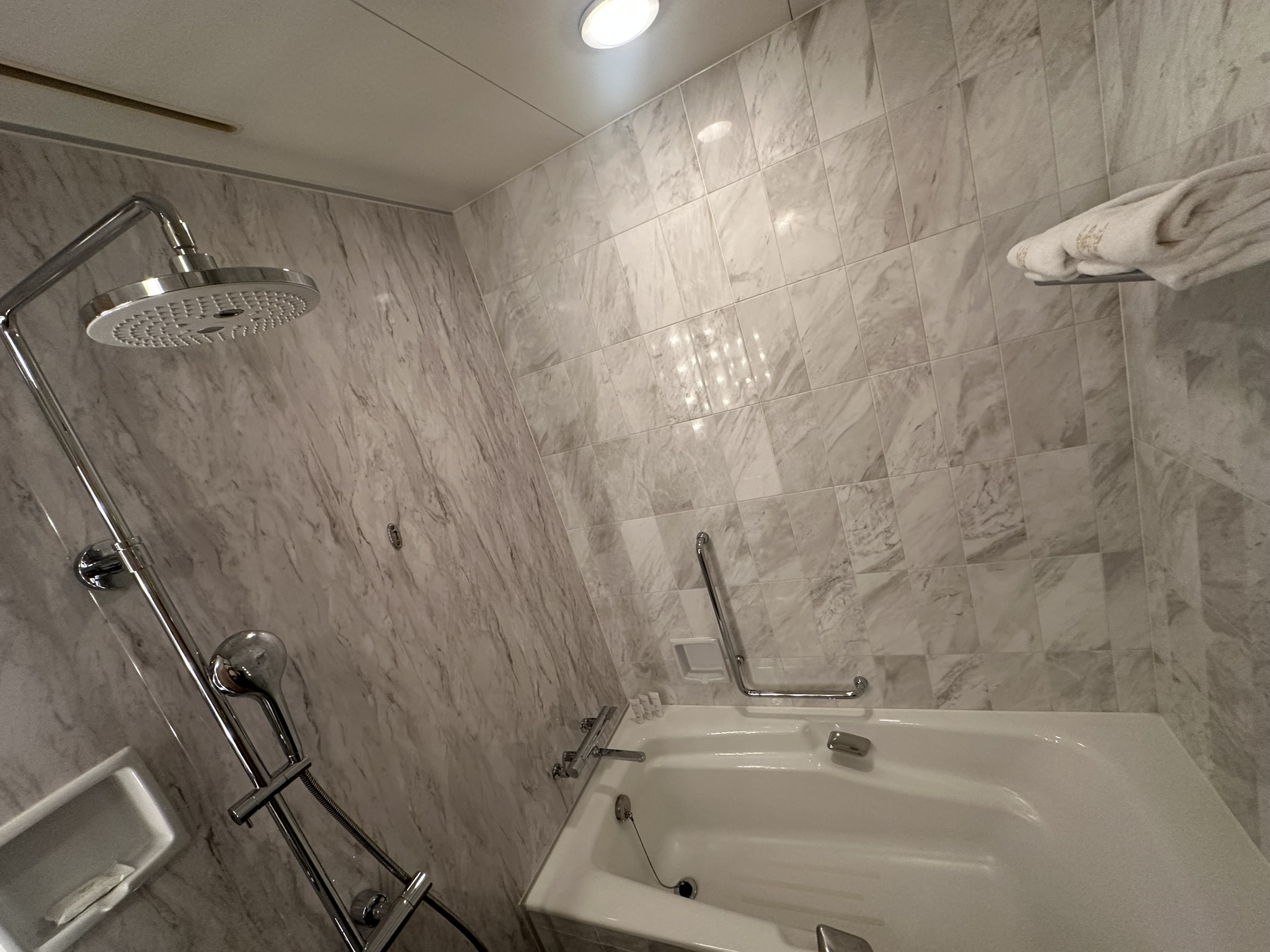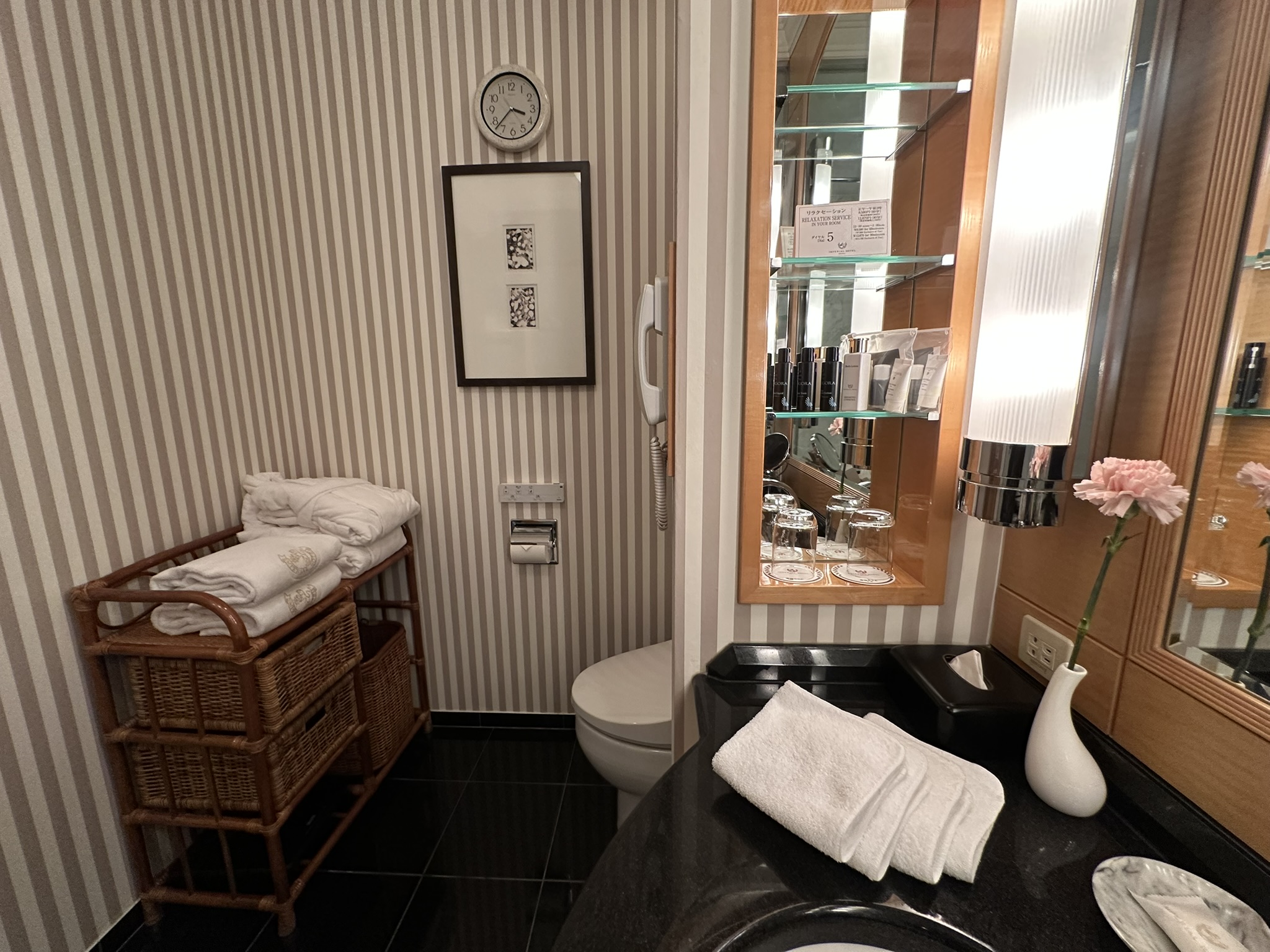 ナイトウェアはパジャマタイプと浴衣タイプの両方が用意されており、バスローブも揃っています。浴衣には「ていこくほてる」とさりげなく描かれていて、粋な上品さが感じられました。タオル類も含め、すべてが過不足なく整えられており、滞在中に不便を感じることはありませんでした。