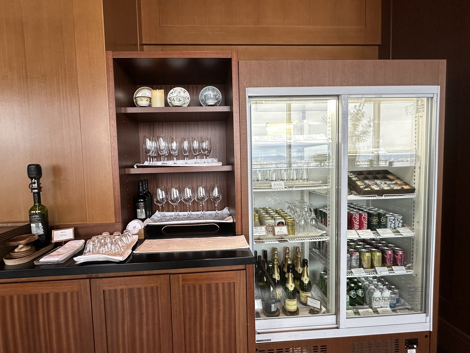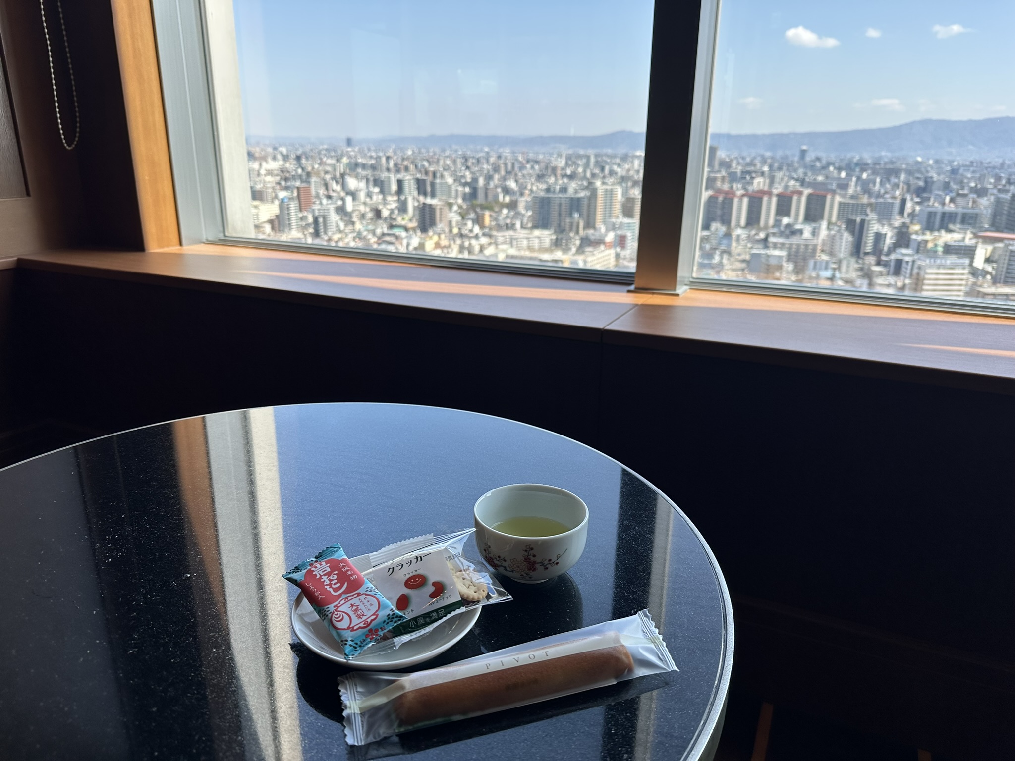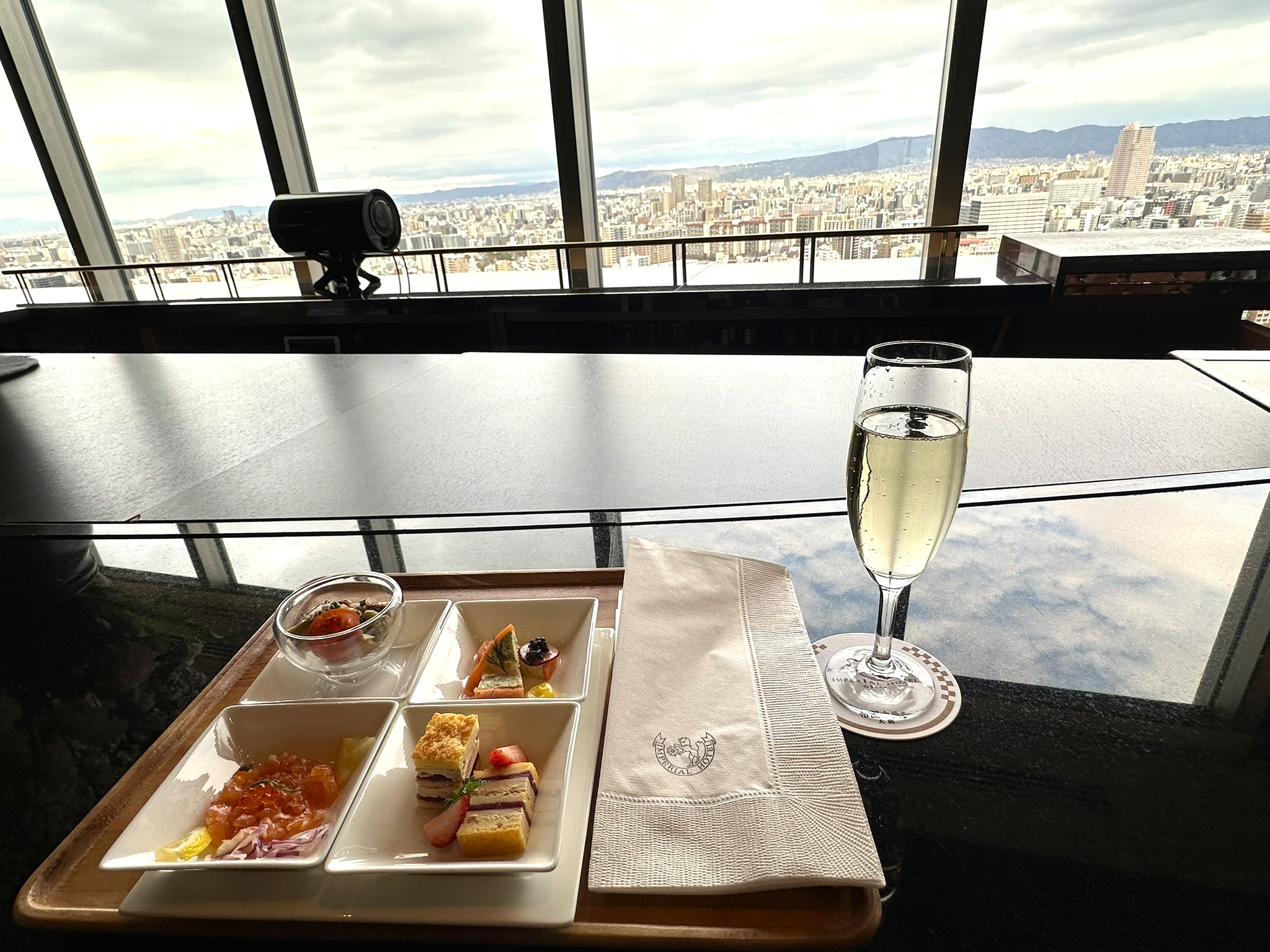 インペリアルフロア宿泊者は、帝国ホテル 大阪の23階にある専用ラウンジを利用できます。ラウンジでは時間帯ごとに変わるプレート料理やドリンクが用意され、アフタヌーンやイブニングのひとときも楽しめます。コーヒーや紅茶はもちろん、ワインやウイスキーなどのアルコールも揃い、窓越しに景色を眺めながら静かに過ごす時間は格別です。