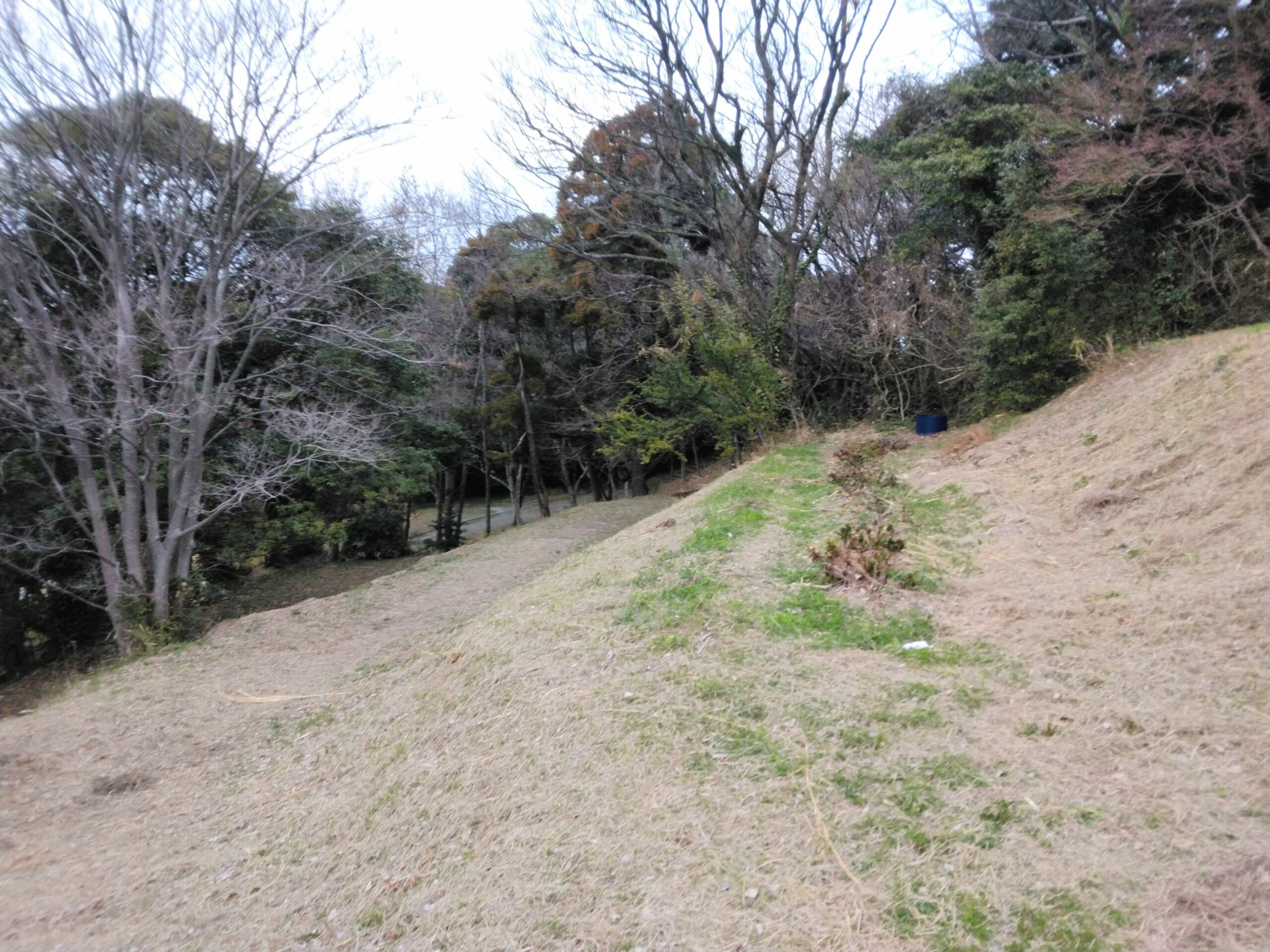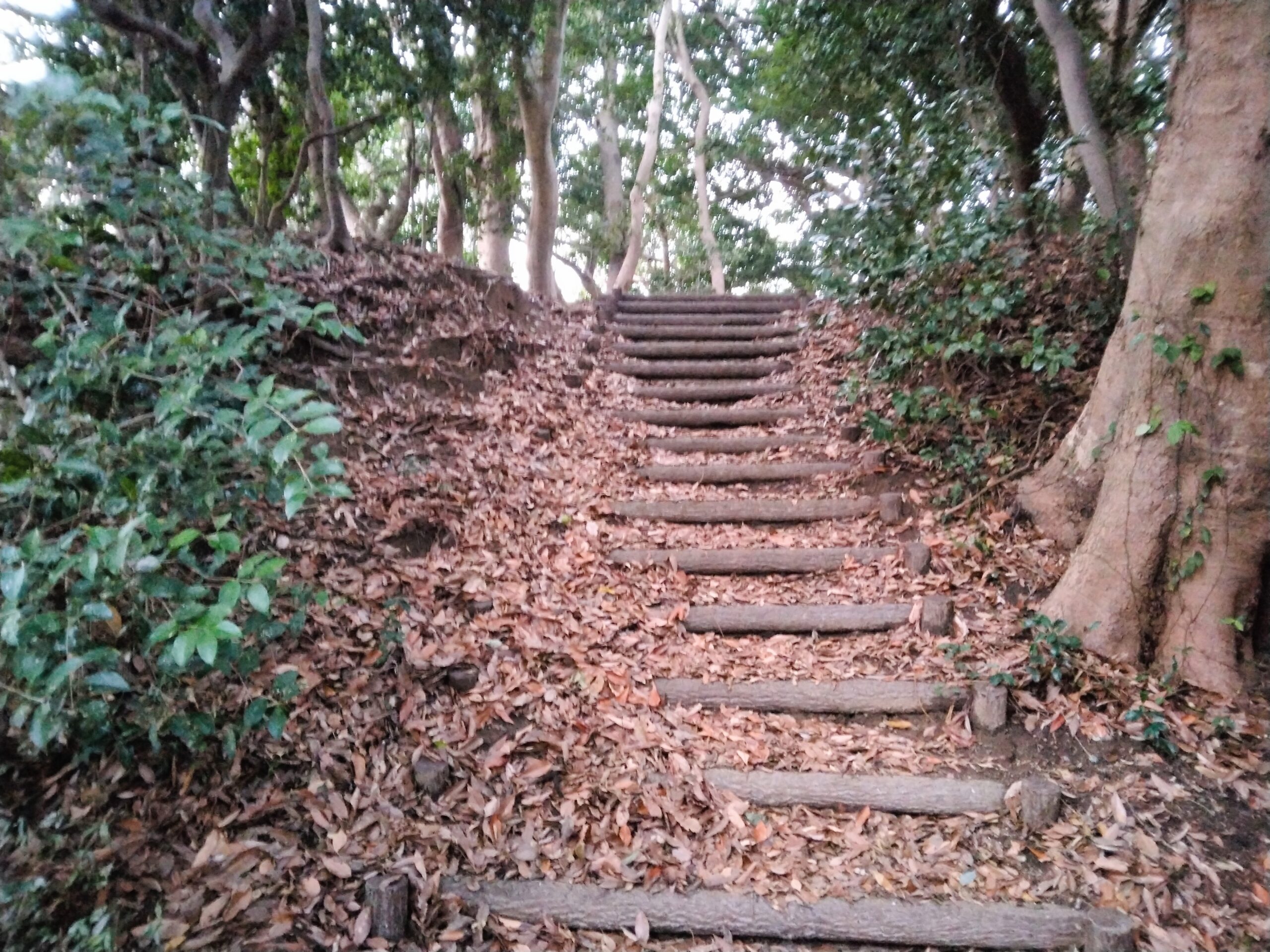 斜面に段々がついているようで、もしかしたら古墳や遺跡なのか?とも思えました。上に進むにつれて舗装された道から、自然道へと足を踏み入れます。草木が両側に並び立ちますが、そんなに急な山道ではないので、やや息が切れる程度で登れます。