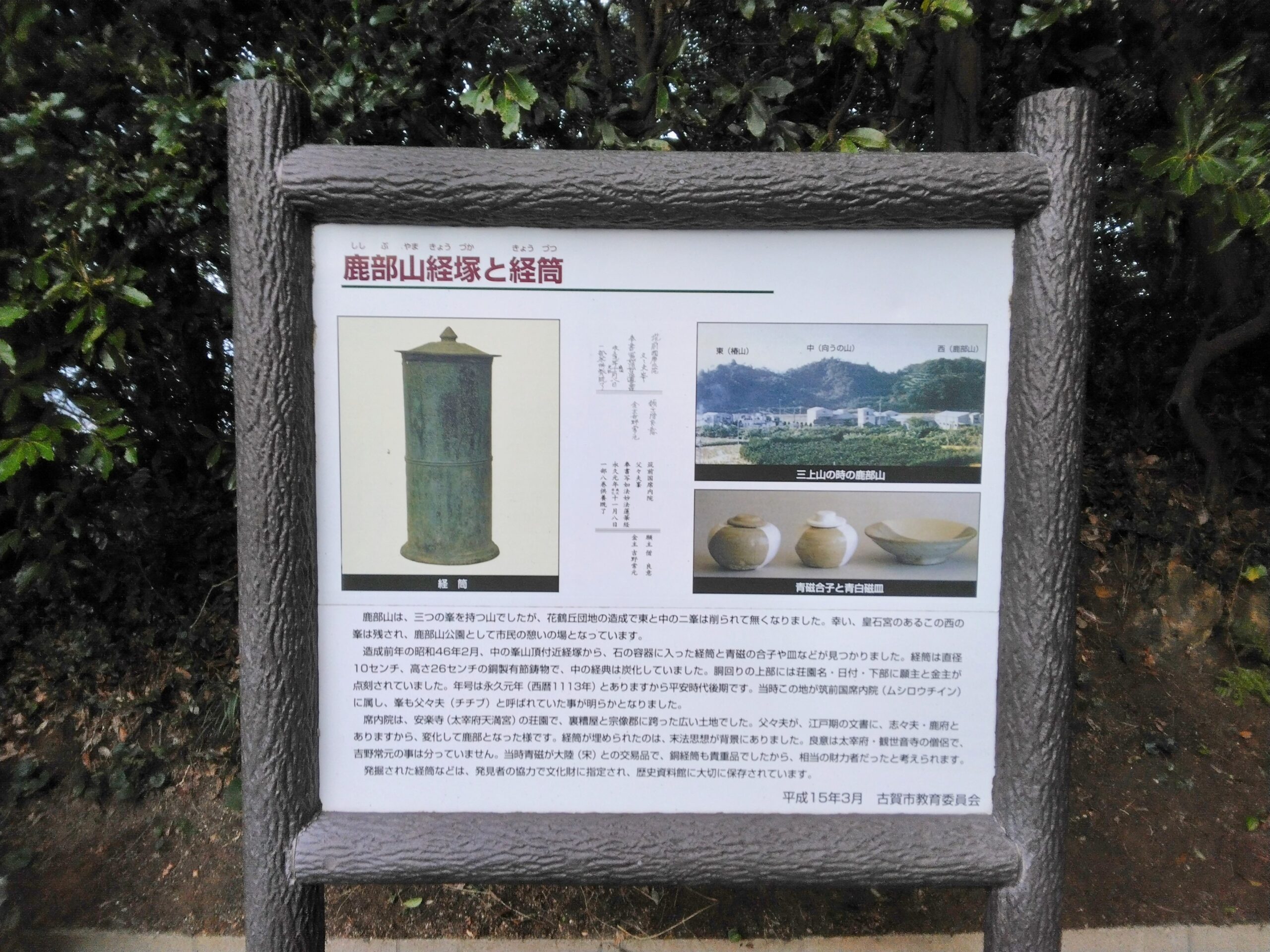 経筒の年号は永久元年(西暦1113年)とあり、平安時代後期のものです。当時は筑前国席内院(ムシロウチイン)に属し、峯が「父々夫(ちちぶ)」とよばれていたことが明らかになったそうです。やがて江戸期の文書に「志々夫」「鹿府」となって「鹿部(ししぶ)」と変化していきました。