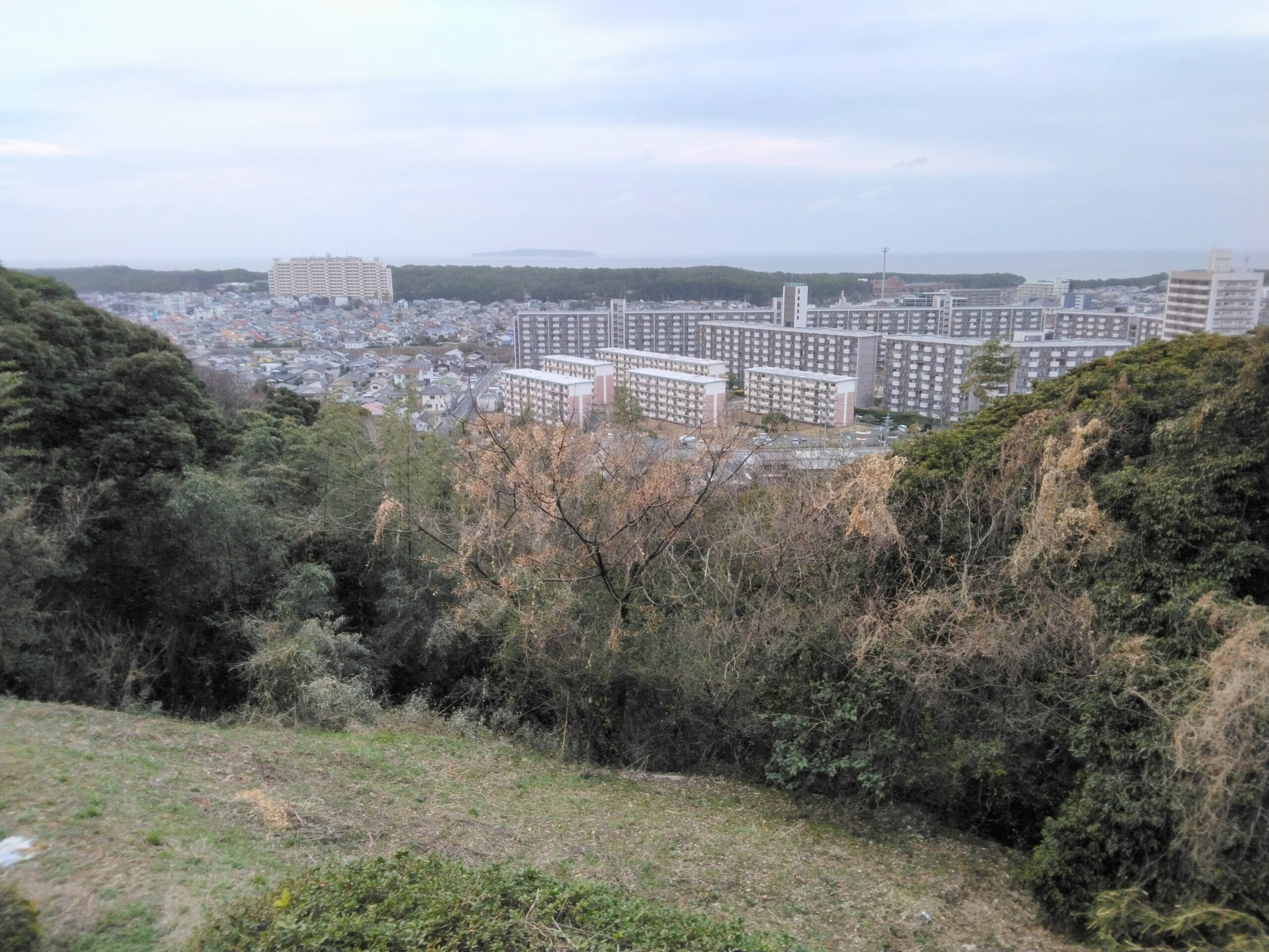 頂上にはさらに上へと続く物見台のような展望台もありました。ここから見渡すと「花鶴丘団地」や「シーサイドパレスフェニックス古賀」を目印に、市内の街並みが広がっていました。沖の方に目を向けると、玄界灘に浮かぶ船のような相島が見えます。