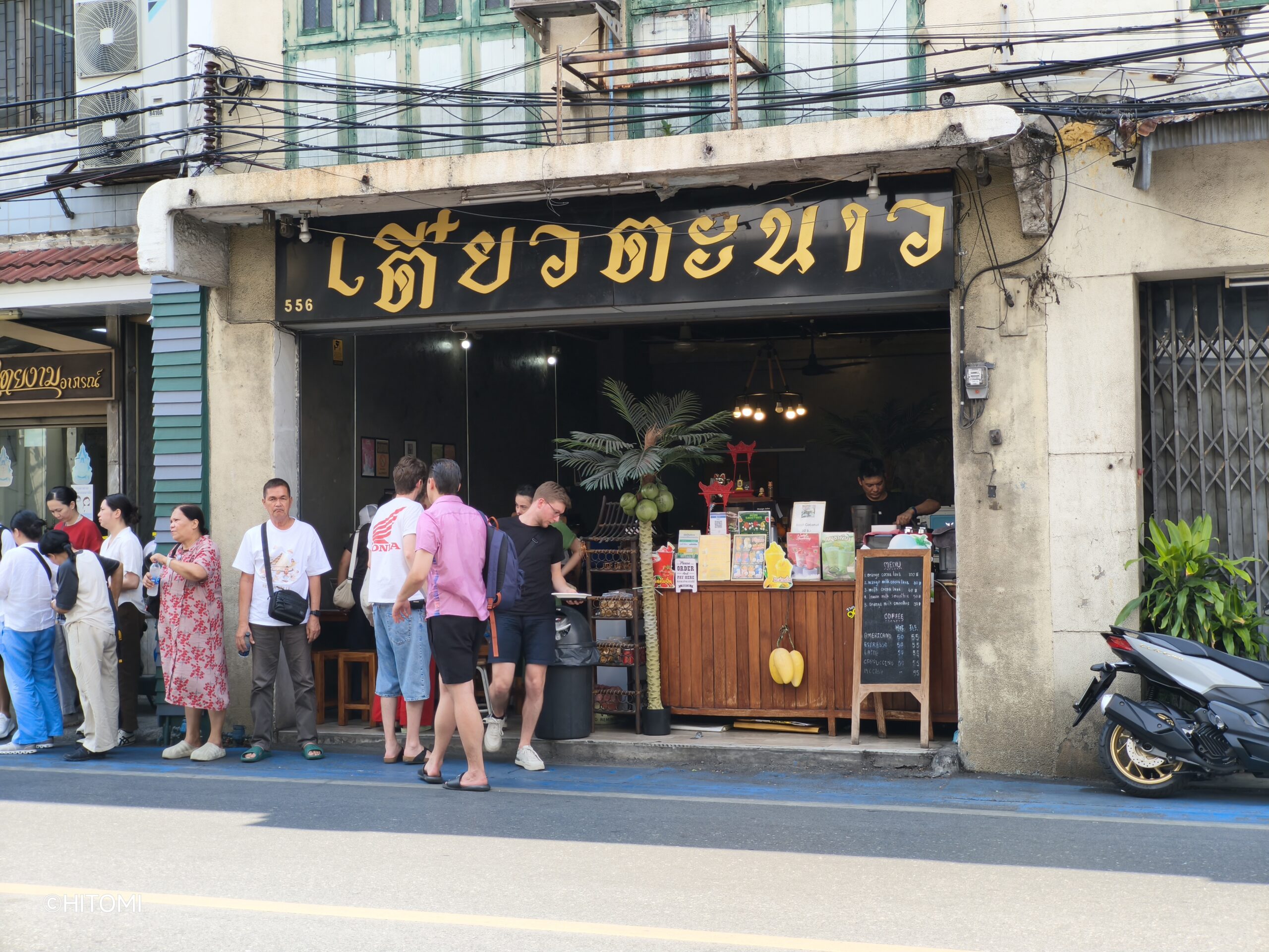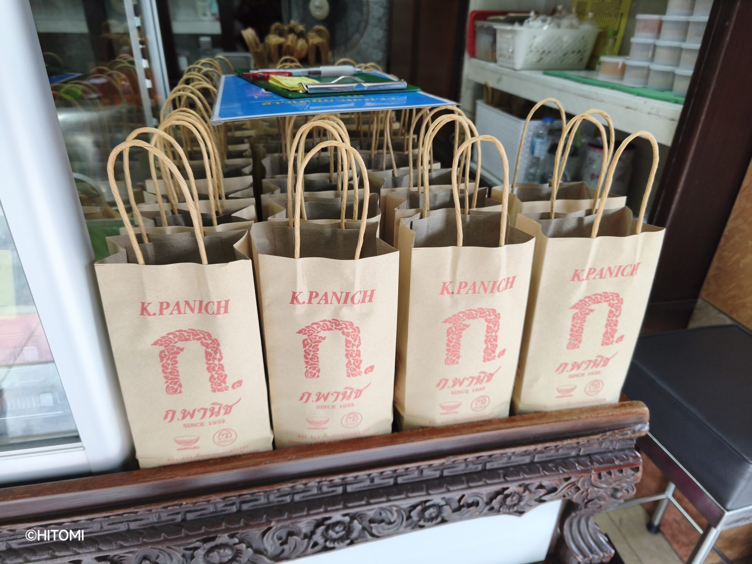 平日の日中でも外国人観光客が次々と列を作る中に並び、店頭で、「イートインか、テイクアウトか」を伝えて注文します。イートインの場合は番号を記入した整理券を渡され、道路を挟んだ向かいの店内で食べることができます。テイクアウトの場合は、店頭に用意された紙袋を渡されます。向かいの店舗は店名から察するに、以前はクイッティアオ(タイヌードル)を出すお店だったようですが、現在はイートインスペースとして利用されています。店内でコーヒーやフルーツスムージー等のドリンクを別途注文することができます。