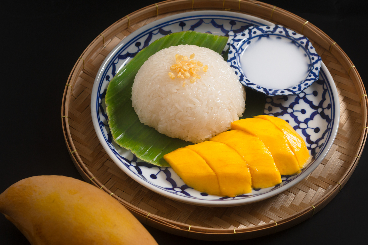 カオニャオ・マムアンは、蒸したもち米をココナッツミルクと砂糖で甘く味つけし、完熟したマンゴーを添えた、古くから親しまれてきた伝統的なタイ菓子です。その起源は、アユタヤ王朝(1351年~1767年)後期にさかのぼるとされています。文献としては、ラーマ2世(1767年~1824年)が舟遊びの際に詠んだ詩をまとめた書物にも登場し、現在のようにもち米とマンゴーを組み合わせて食べるスタイルが広く定着したのは、ラーマ5世(1853年~1910年)の時代といわれています。