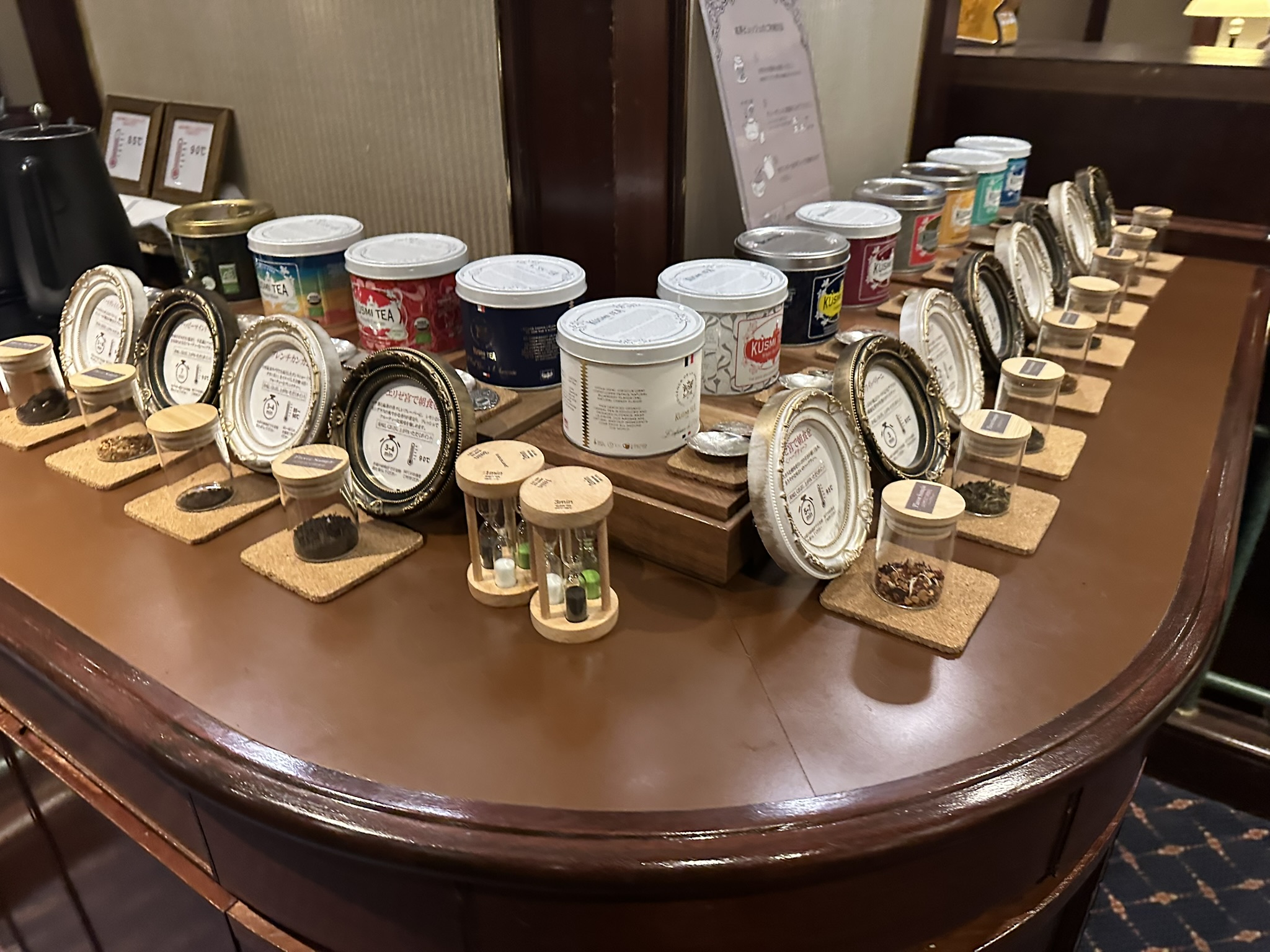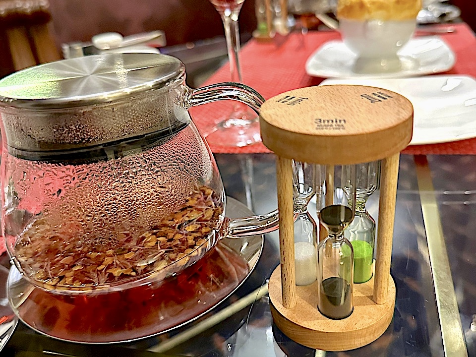 ドリンクはフランスの老舗「クスミティー」12種をフリーフローで楽しめ、自分で茶葉を選び淹れるスタイル。