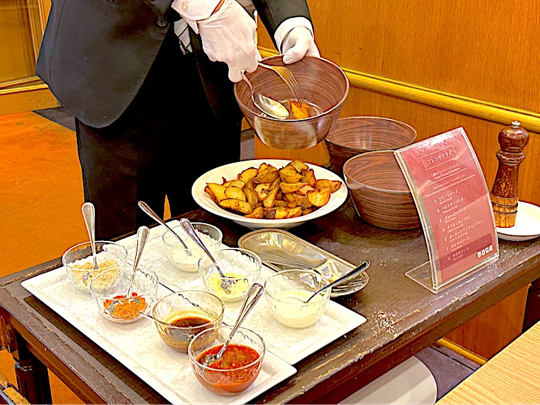 セミビュッフェには、蒸籠蒸しの野菜や前菜がバランスよく揃い、軽めにも、しっかり食べたいときにも対応できる内容。テーブルで仕上げてくれるフレンチフライや、名物の黒カレー、さらにスイーツまで楽しめます。