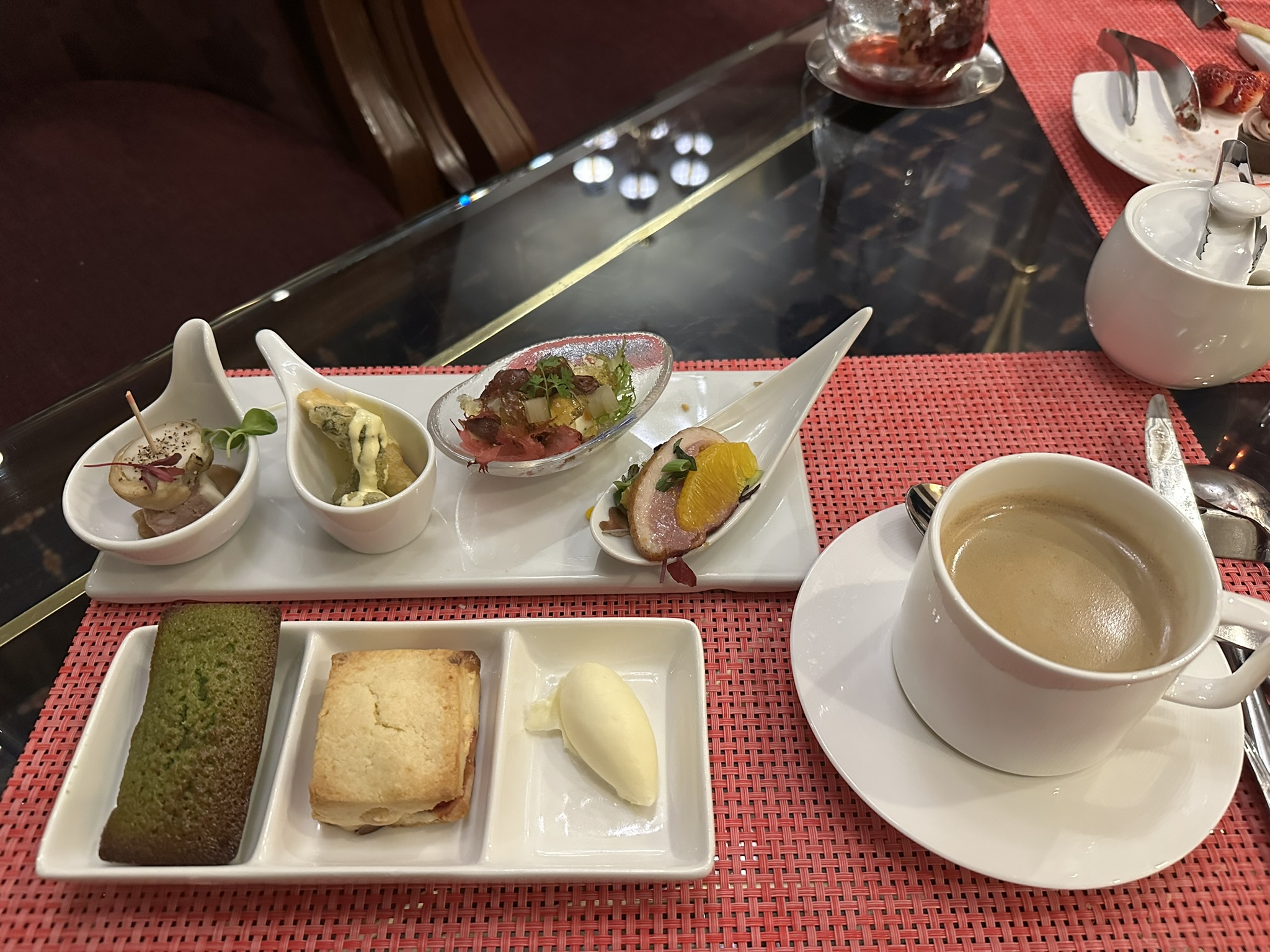 セイボリーには合鴨スモークなど6種が用意され、甘味とのバランスも良好です。