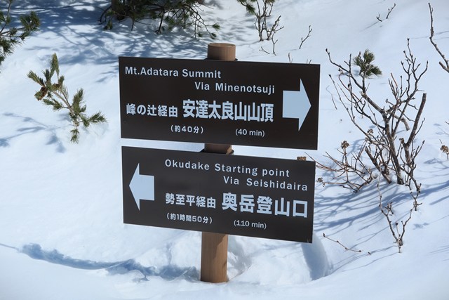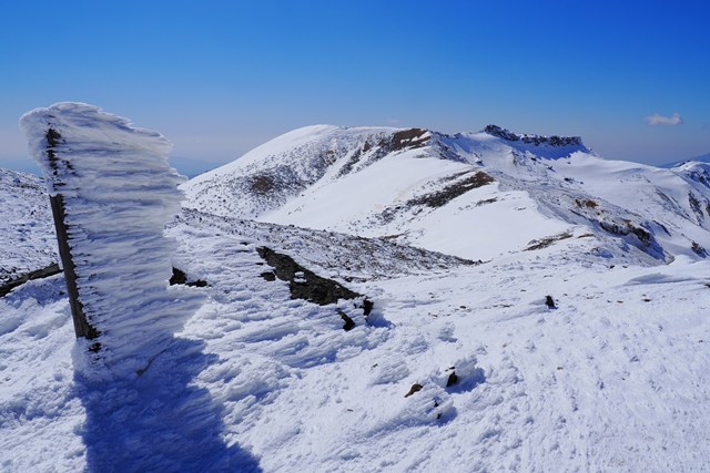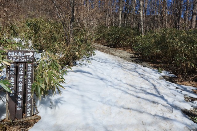 船明神山方向との分岐の柱票には、雪の芸術"エビの尻尾"が付着しています。1,700m級の山々は、春めき始めた下界とは全く異なります。