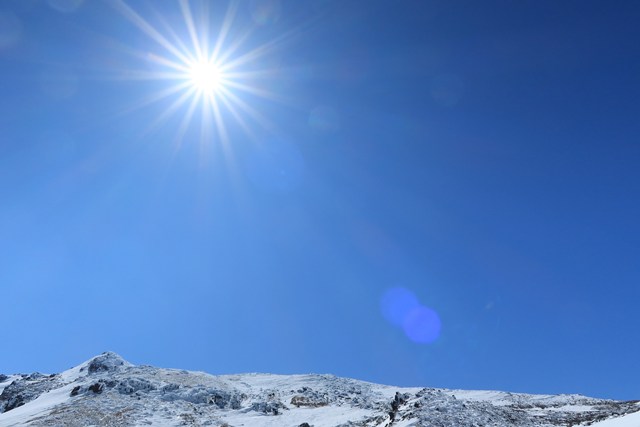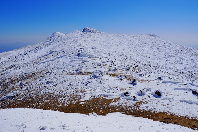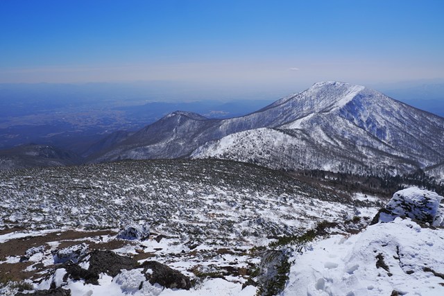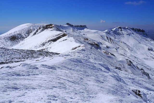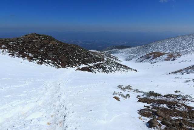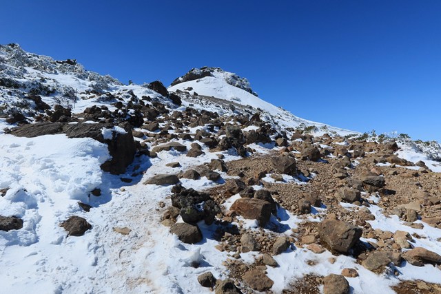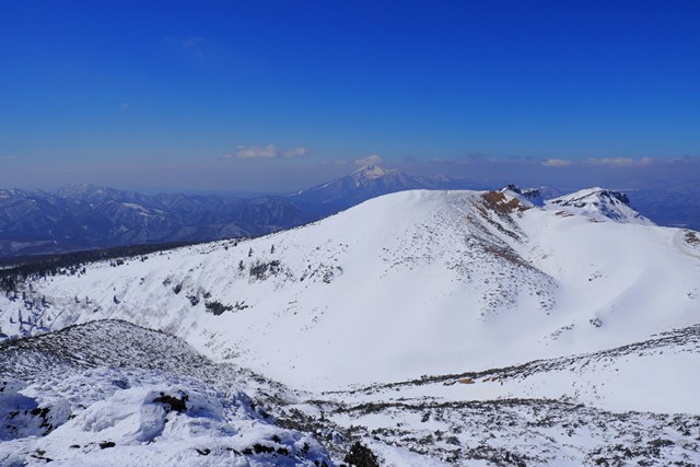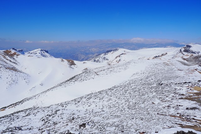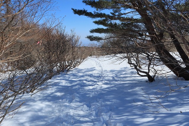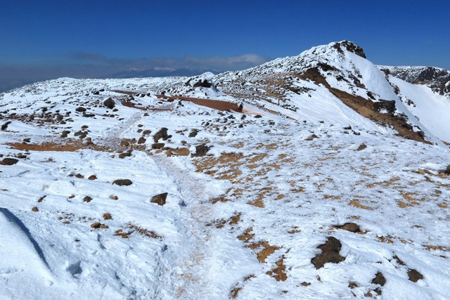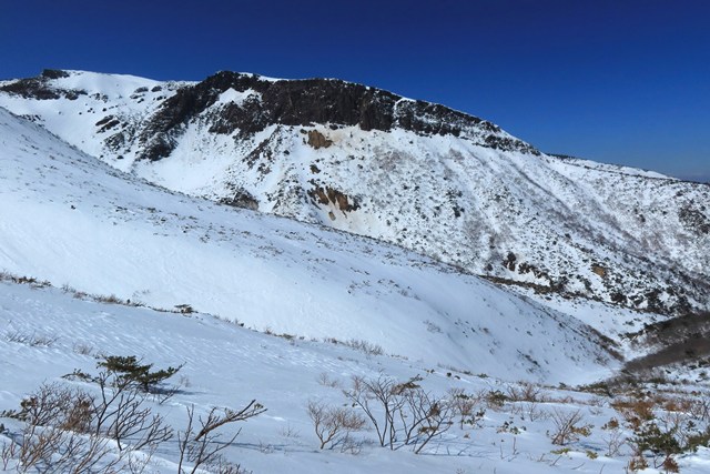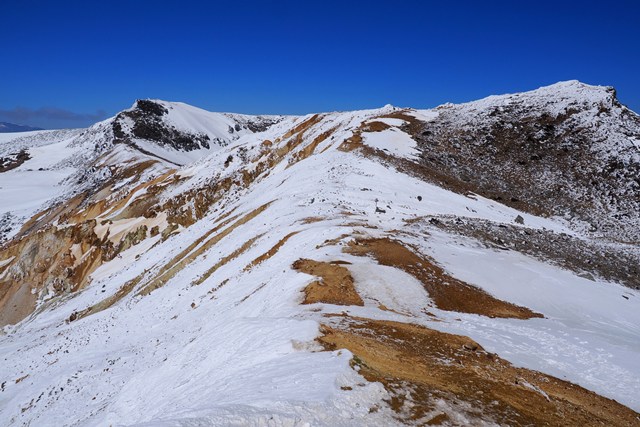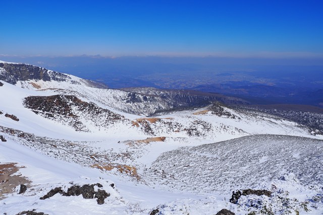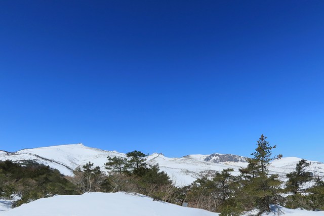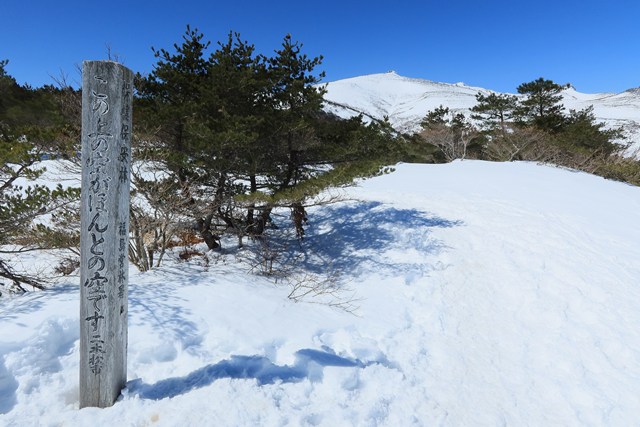 爆裂火口の沼ノ平は、若干ですが雪がソフトな印象を演出しています。