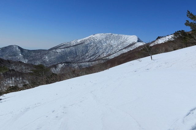 船明神山方向には、稜線の右奥に障子ヶ岩の姿もよく確認できます。