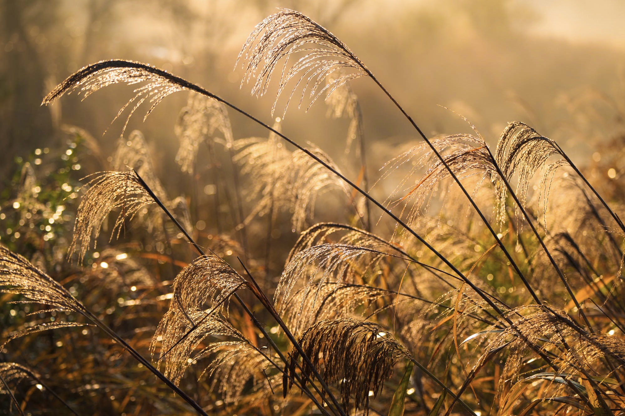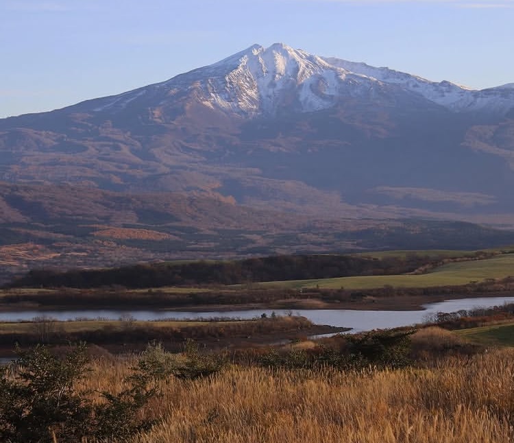 冬師湿原の魅力は、秋の朝に見られる幻想的な光景です。秋の夜明けには冷え込みが強まり、日が昇る直前には湿原一面を覆うススキや野草の葉先に無数の朝露が宿ります。そして草原全体がダイヤモンドをちりばめたようにキラキラと輝きだします。背景にそびえる鳥海山が朝日を浴びて赤く染まる様子は、早起きをした人だけが味わえる至福のご褒美です。