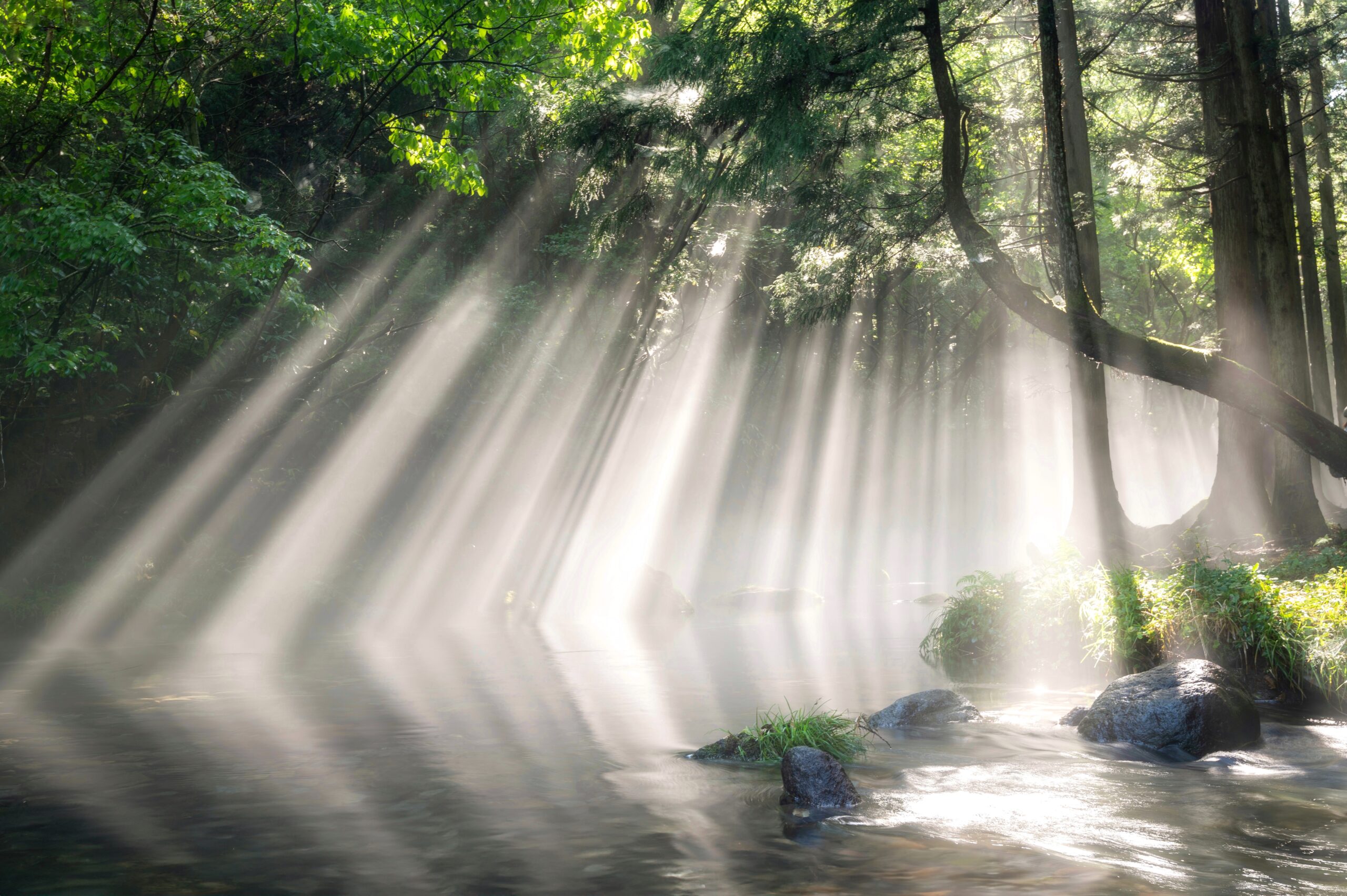 元滝の一番の見どころは、夏の早朝にだけ現れる奇跡の瞬間です。湿度の高い夏の朝、木々の隙間から差し込む太陽の光が、滝から立ち上る霧に反射し、光芒が出現します。