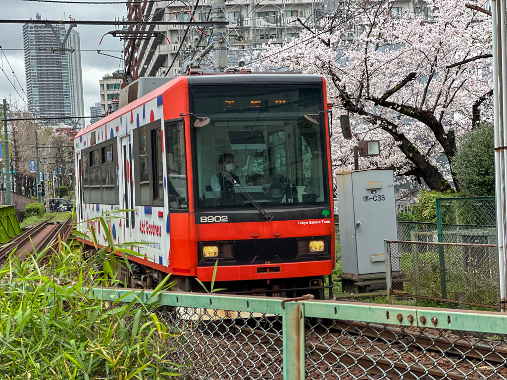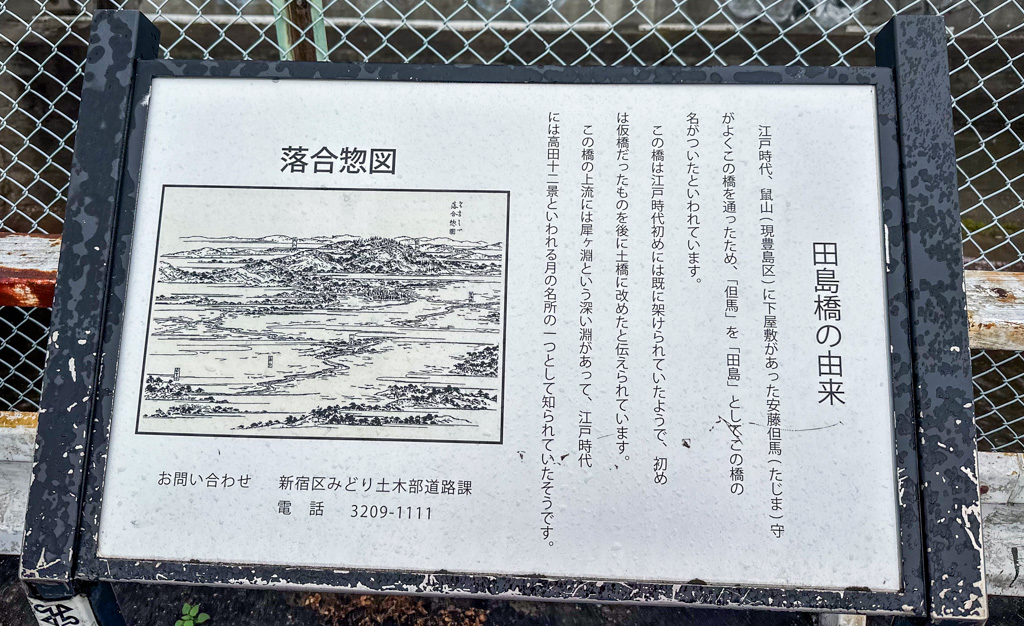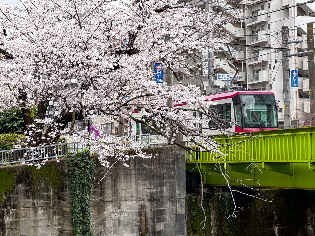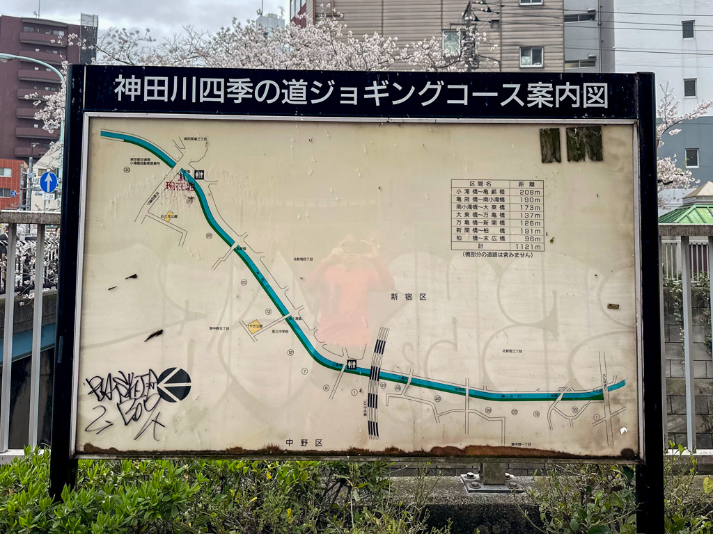 高田馬場駅から㉓神高橋に出ると、そこからは神田川に沿った散策路が整備されています。少し進んで、明治通りを渡ると左手に都電荒川線が見えてきます。都電を渡って直ぐに左折すると散策路の始まりです。