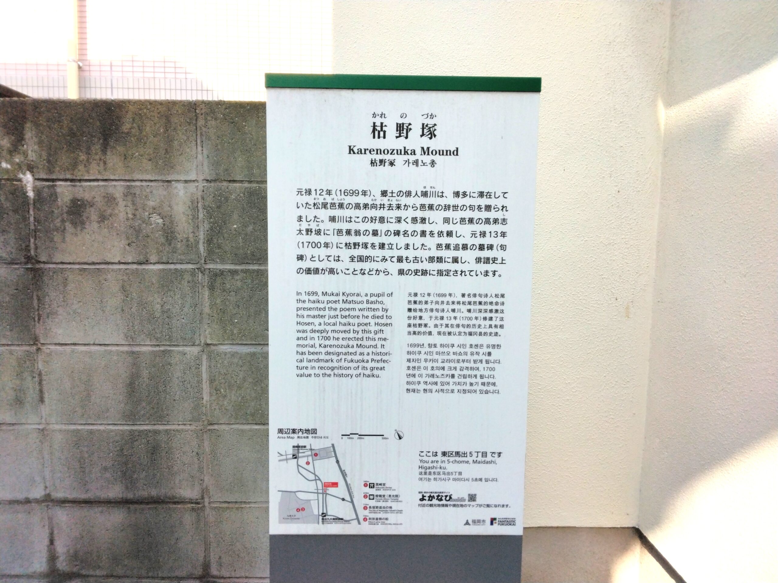 元禄12年(1699年)、郷土の俳人哺川(ほせん)は、博多に滞在していた松尾芭蕉の高弟向井去来から芭蕉の辞世の句を贈られました。哺川はこの好意に深く感激し、同じ芭蕉の高弟志太野坡(しだやば)に「芭蕉翁の墓」の碑名の書を依頼し、元禄13年(1700年)に枯野塚を建立しました。芭蕉追慕の墓碑(句碑)としては、全国的にみても古い部類に属し、俳諧史上の価値が高いことなどから、県の史跡に指定されています。