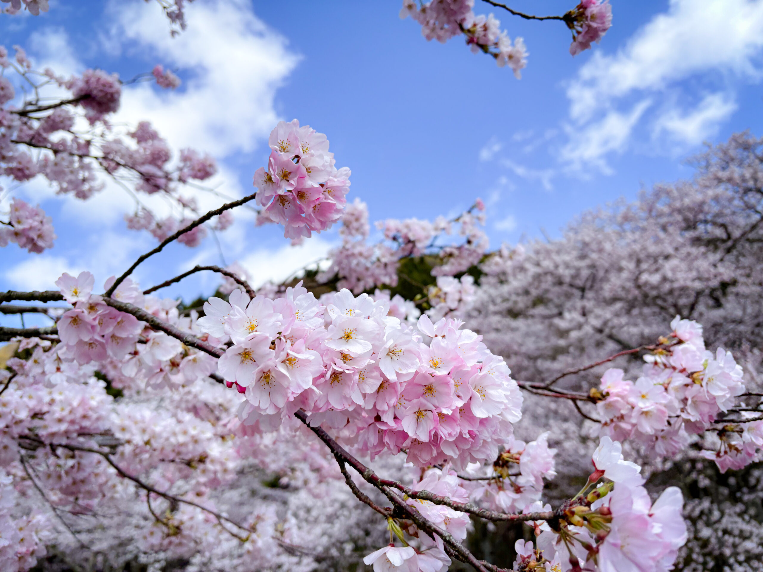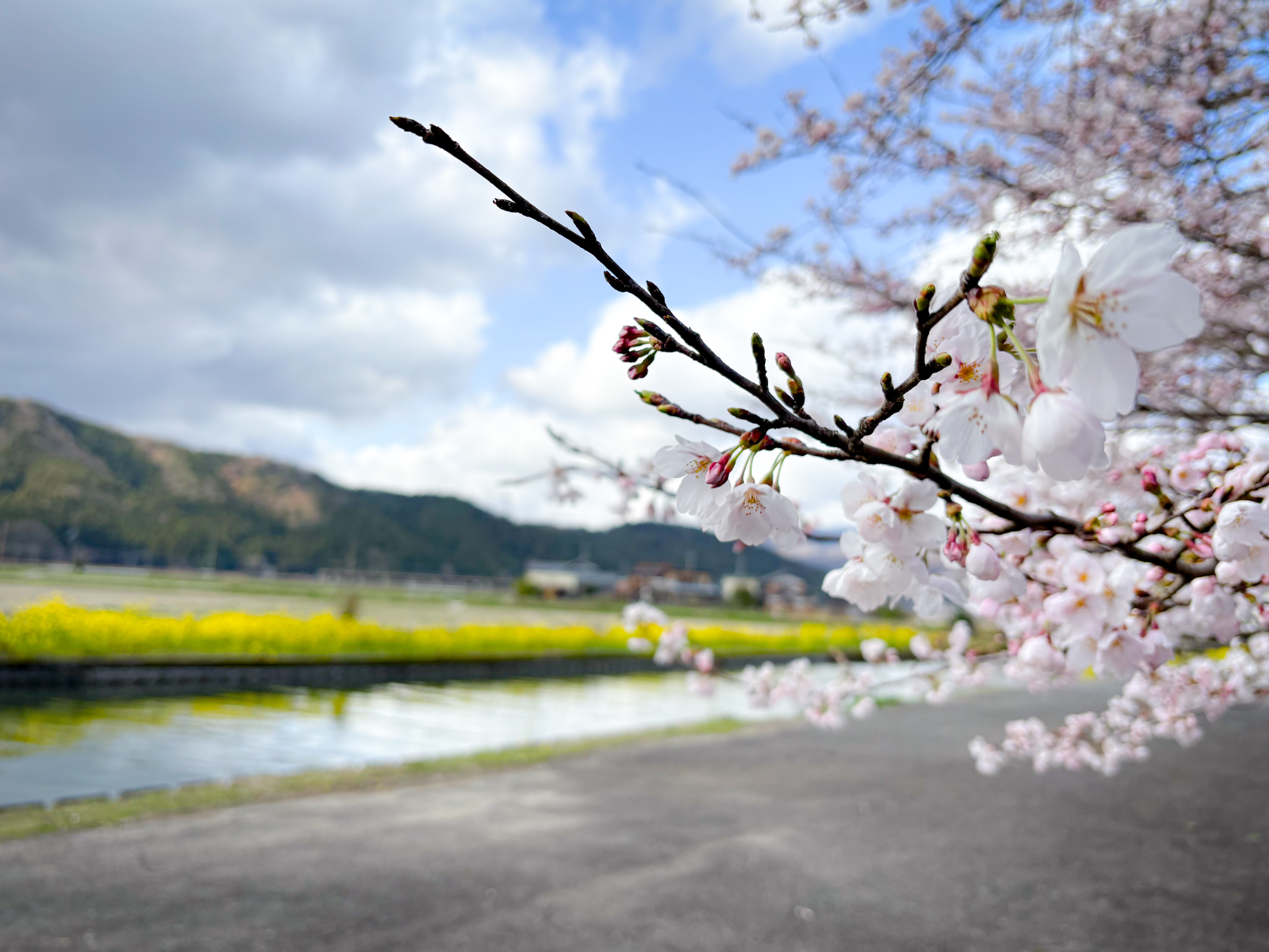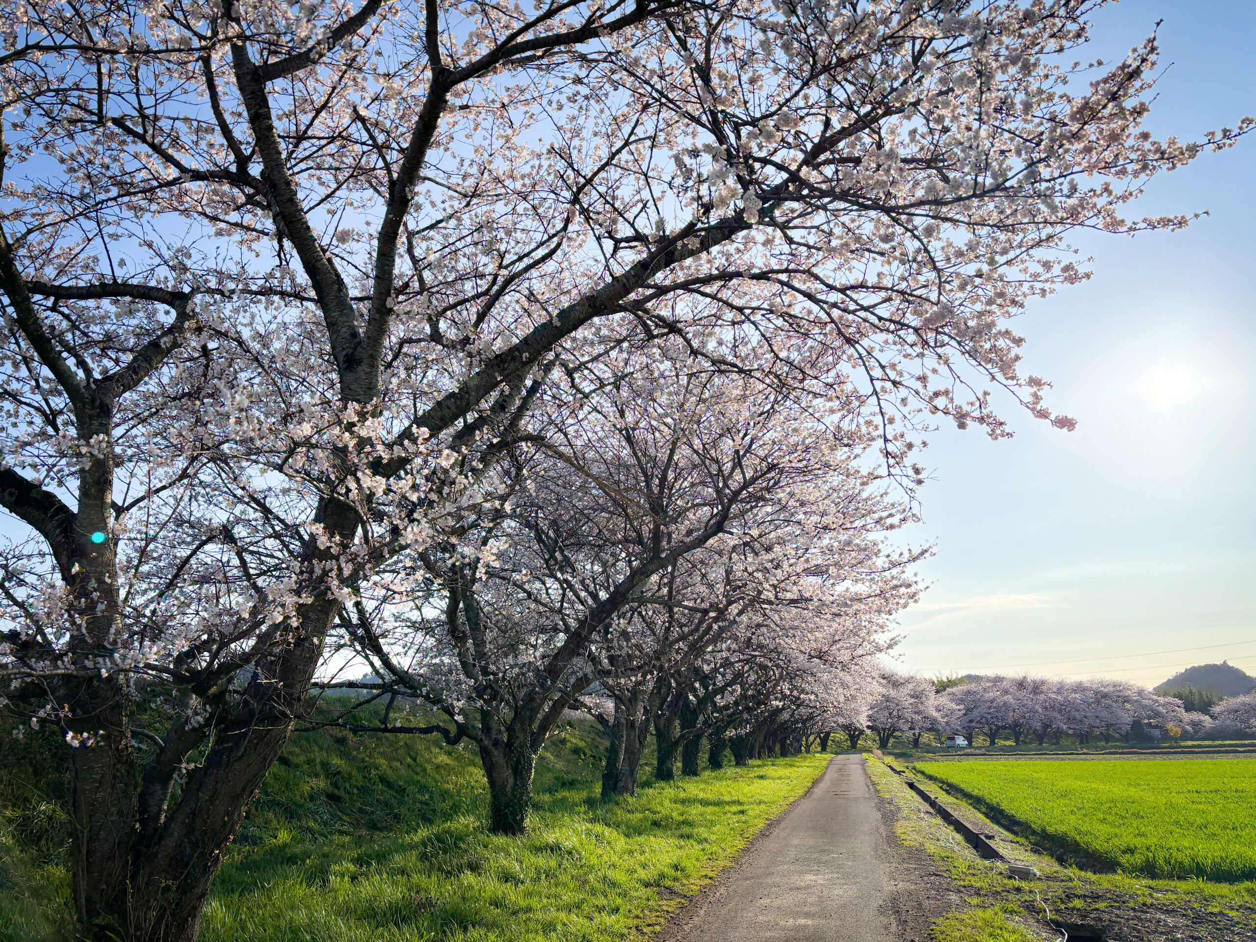 最後に訪れたのは、米原市新庄の桜。地元の人々に親しまれる穏やかな風景が広がっています。田畑の道沿いに続く桜並木は、どこか懐かしさを感じさせ、空の青さと相まって、素朴でありながら心に残る美しさを見せてくれます。