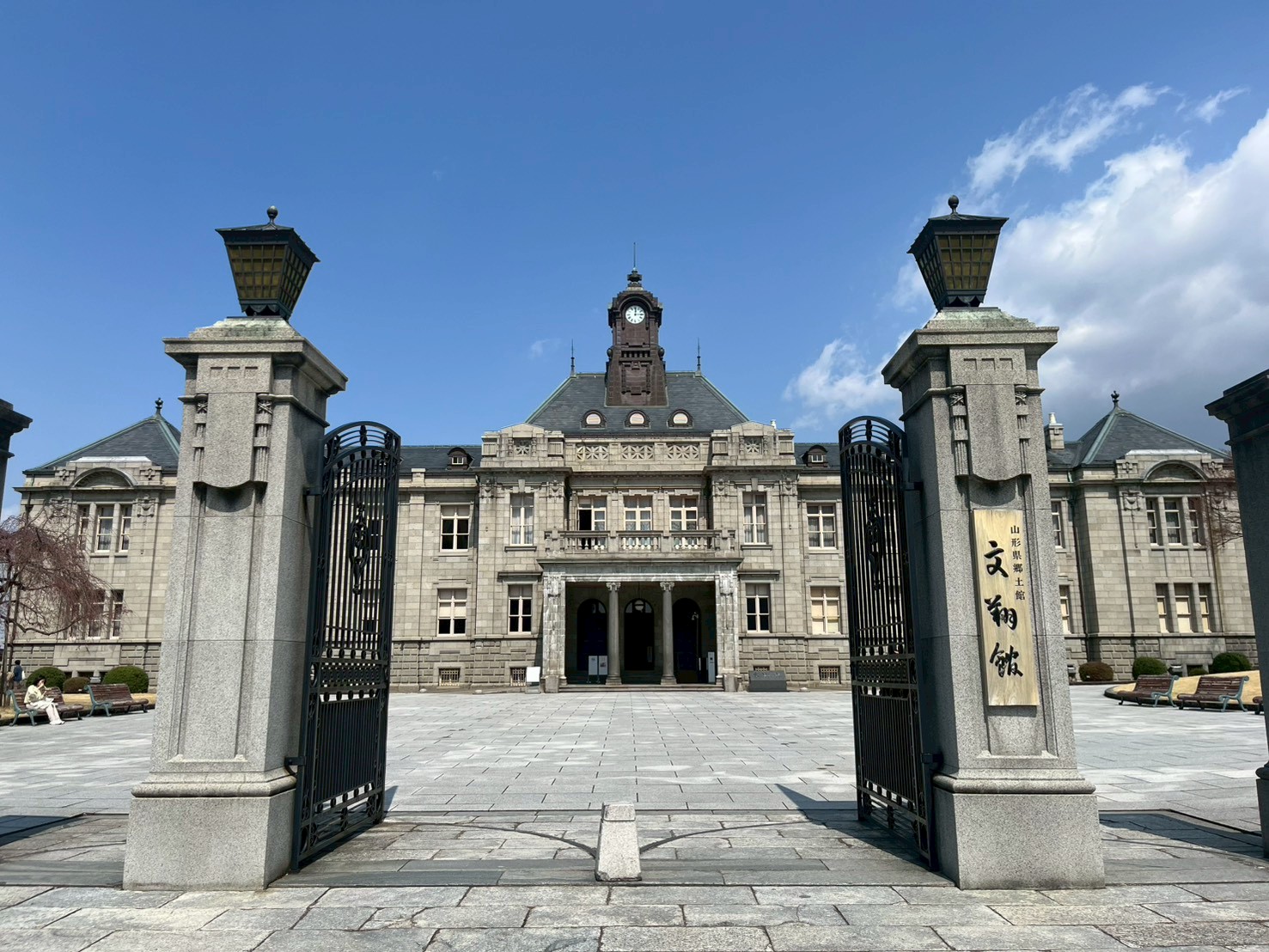 TAN6ビルから山形市役所前へ延びる目抜き通りを9分ほど北へ進むと、そのつきあたりに、荘厳な石造りの建物が現れます。旧県庁舎であり、現在は山形県郷土館として愛される「文翔館」です。