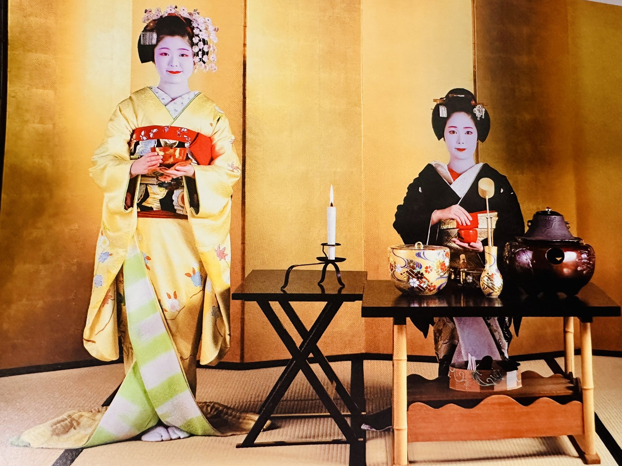 都をどりの楽しみは、舞台だけではありません。茶券付きの観覧席では、公演前にお茶席を体験することができます。芸妓さんがお茶を点て、舞妓さんが控える場面も見られるなど、花街ならではのもてなしは、この時期ならではの特別なひとときです。