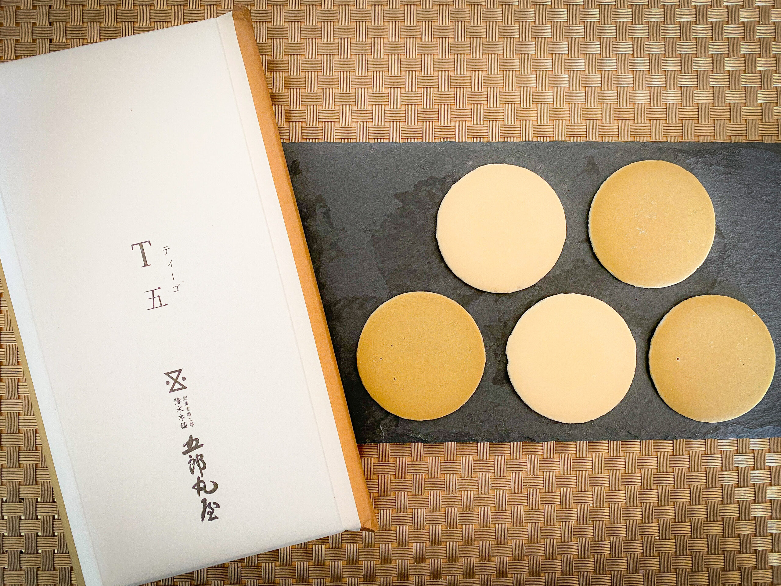 観光庁「究極のお土産」に選定された、大人の和菓子「T五」(ティーゴ)。薄い煎餅に和三盆糖を塗り重ねて、口の中で雪のようにすっと溶けていく上品な味わいが特徴です。