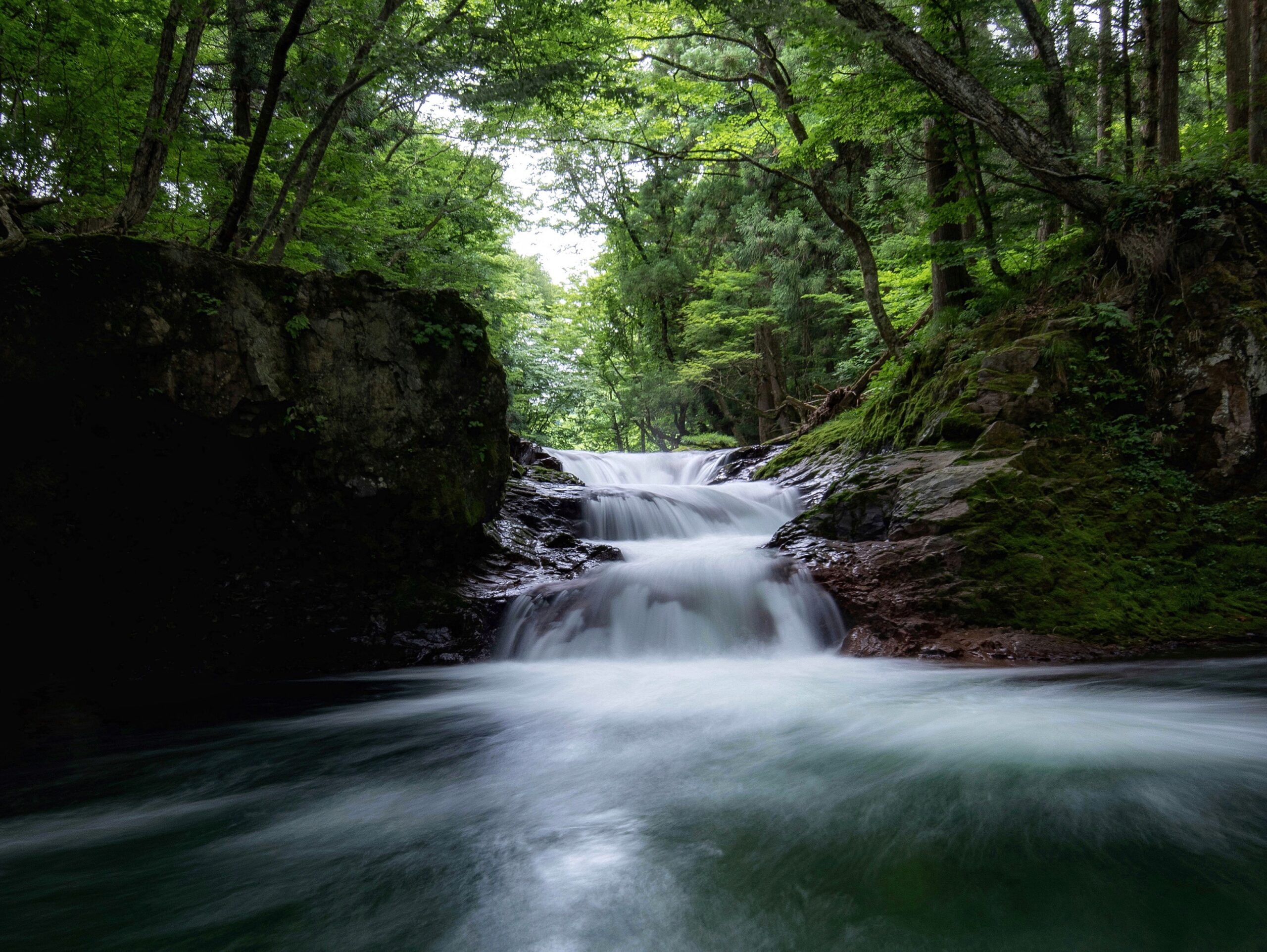 秋田市中心部から車で40分。河辺地域の岩見川上流にある「伏伸(ふのし)の滝」は、手軽に大自然を味わえる憩いの場です。この滝の特徴は、垂直に落ちる一般的な渓流とは異なり、階段状になった岩肌を水が滑るように流れ落ちる「渓流滝」の美しさにあります。落差こそ大きくないものの、3段にわたって幾重にも重なる水の流れは非常に優雅で、周囲の景観と見事に調和しています。
