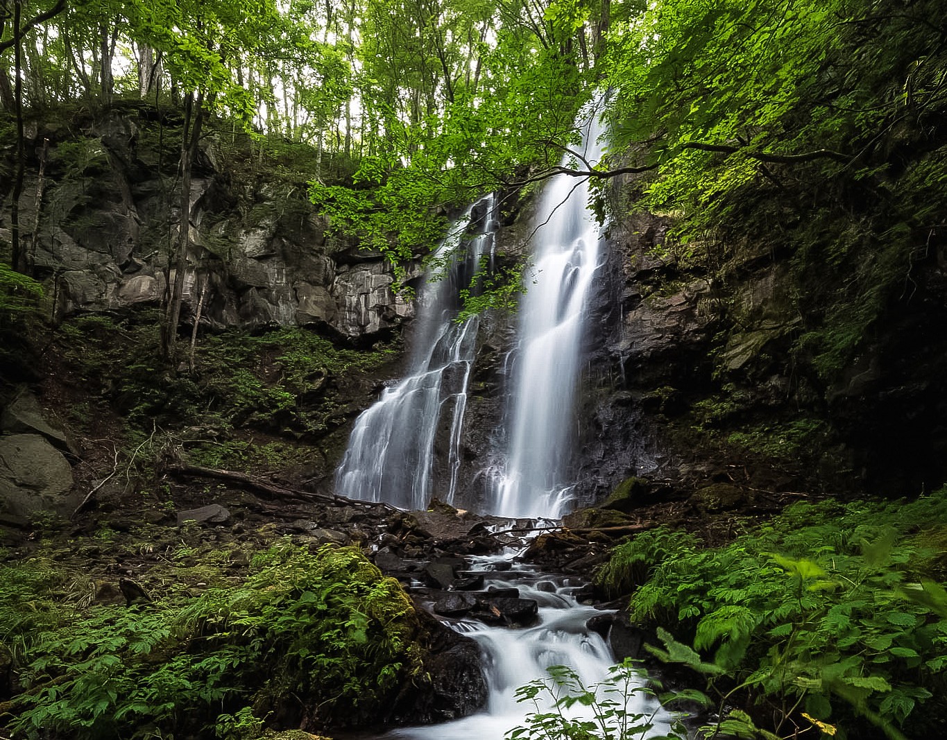 秋田を代表する景勝地、田沢湖を見下ろす高原エリアに位置するのが「友情の滝」です。この滝の大きな特徴は、岩肌を滑るようにして横に二筋に分かれて流れ落ちる、優美な姿にあります。雪解け水が流れ込む春先は、年間を通しても特に水量が多く、その清らかな水の調べは訪れる人の心を癒してくれます。