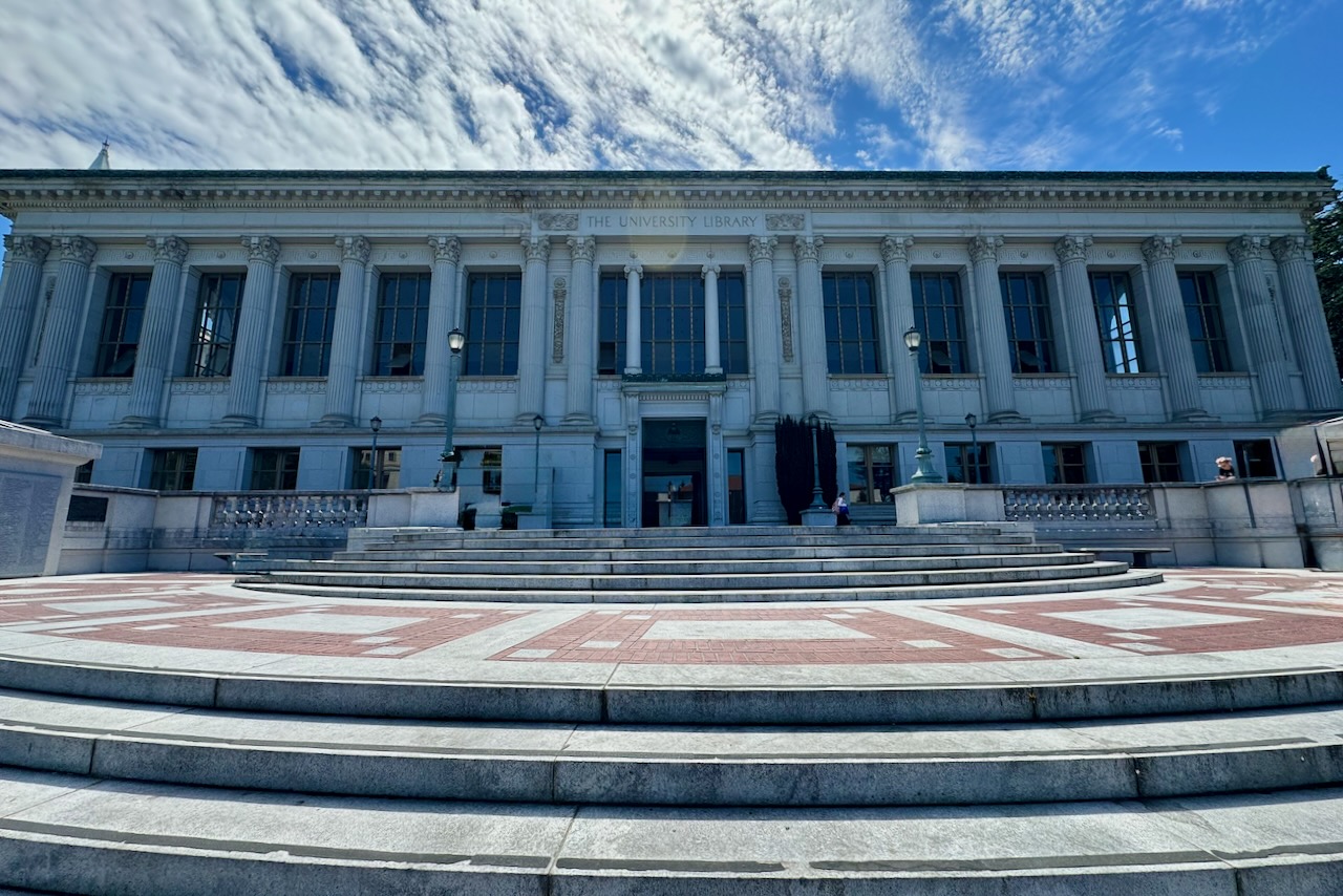 ゲートをくぐりそのままキャンパス中央の道を進むと、右手にキャンパスの象徴セイザータワーが見えてきます。晴れた日にはサンフランシスコ湾や橋が見える丘陵地で、UCバークレーの精神を象徴している場所です。そして学内散策なら必ず見ておきたい図書館が、1911年建設の荘厳なドゥ・メモリアルライブラリーで、中に入ることができます。足音さえ気になってしまうほどで、静なる活気がひしひし感じ、思わず背筋を伸ばしてしまいます。