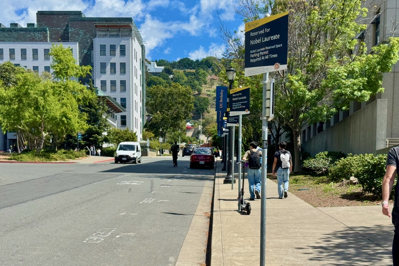 セイザータワーからハースト・サークルへ歩くと路上駐車に、青地に白抜きで“NL(Nobel Laureate)”と記された表示があります。ノーベル賞受賞者向けに用意された特別なパーキングスポット。ノーベル賞受賞者が多すぎて、普通の大学とはちょっと基準が違う。タワー周辺に点在する表示は、この大学らしくユニーク。ここでは、世界を驚かせる発見をしても、車を停める場所を確保するだけで一苦労。駐車場が欲しければノーベル賞を取るしかない…なんて冗談が本気で囁かれている。 そんなインテリすぎる悩みを横目に、丘を下ってキャンパスの外へと向かいます。