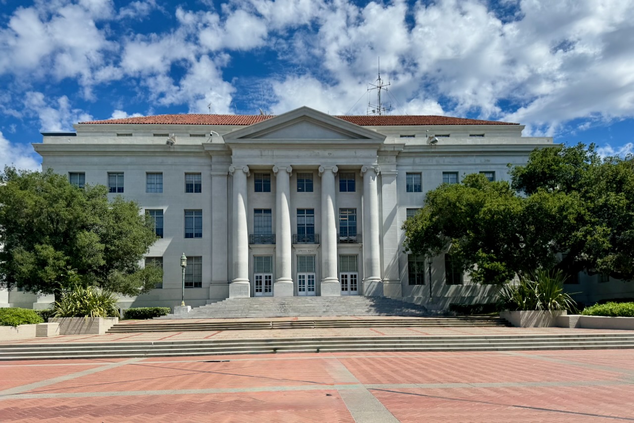 早速バンクロフト・ウェイからスタート。早速現れるのが、スプロールホールと広場。学生が談笑する平和な広場ですが、実はアメリカの歴史を動かしてきた「現場」です。1964年に「フリースピーチ・ムーブメント(言論の自由運動)」が展開された場所としてあまりにも有名。この学生運動は、学生の政治活動の自由をめぐる議論を全米に広げ、大学のあり方に大きな影響を与えました。