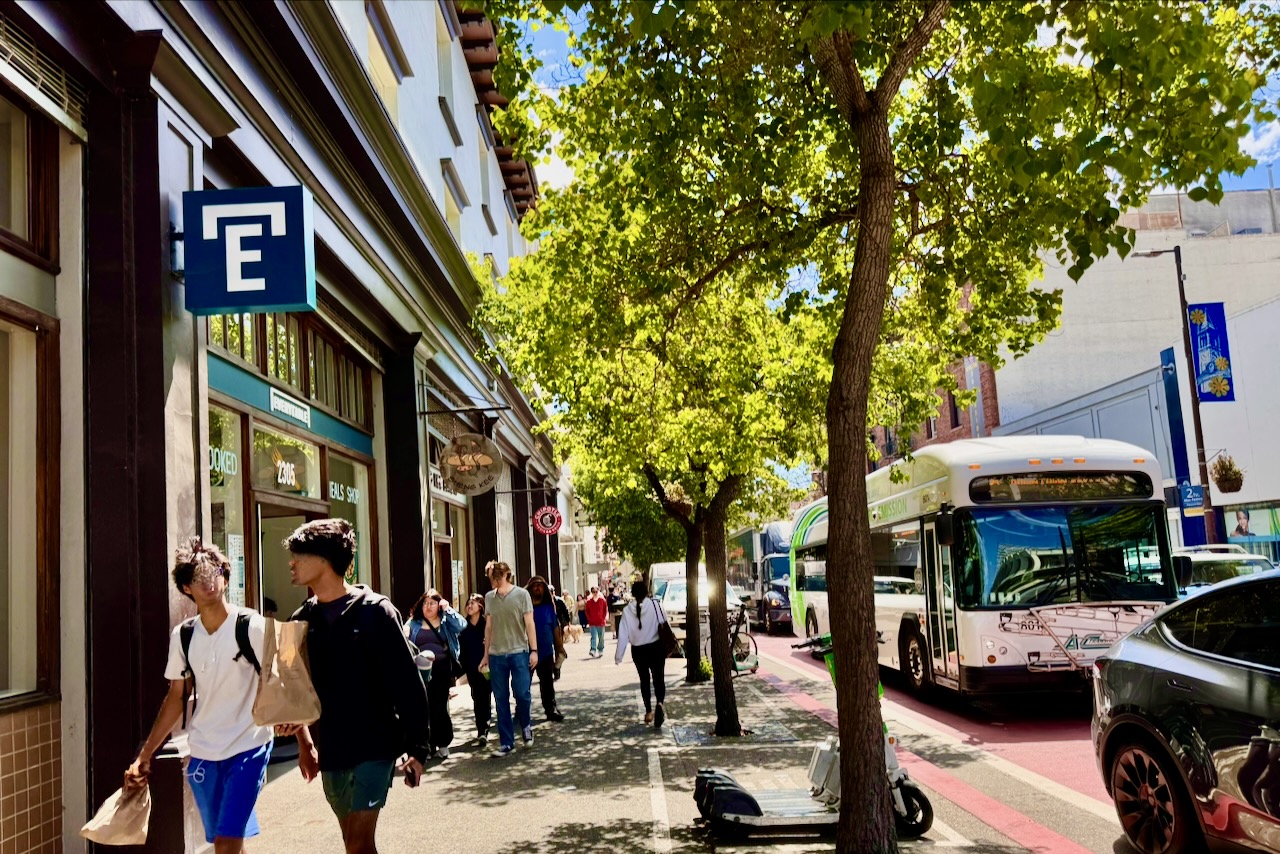 セイザーゲートから南、キャンパスを出た途端、空気が一変します。自由な気風が色濃く残るテレグラフAveです。
