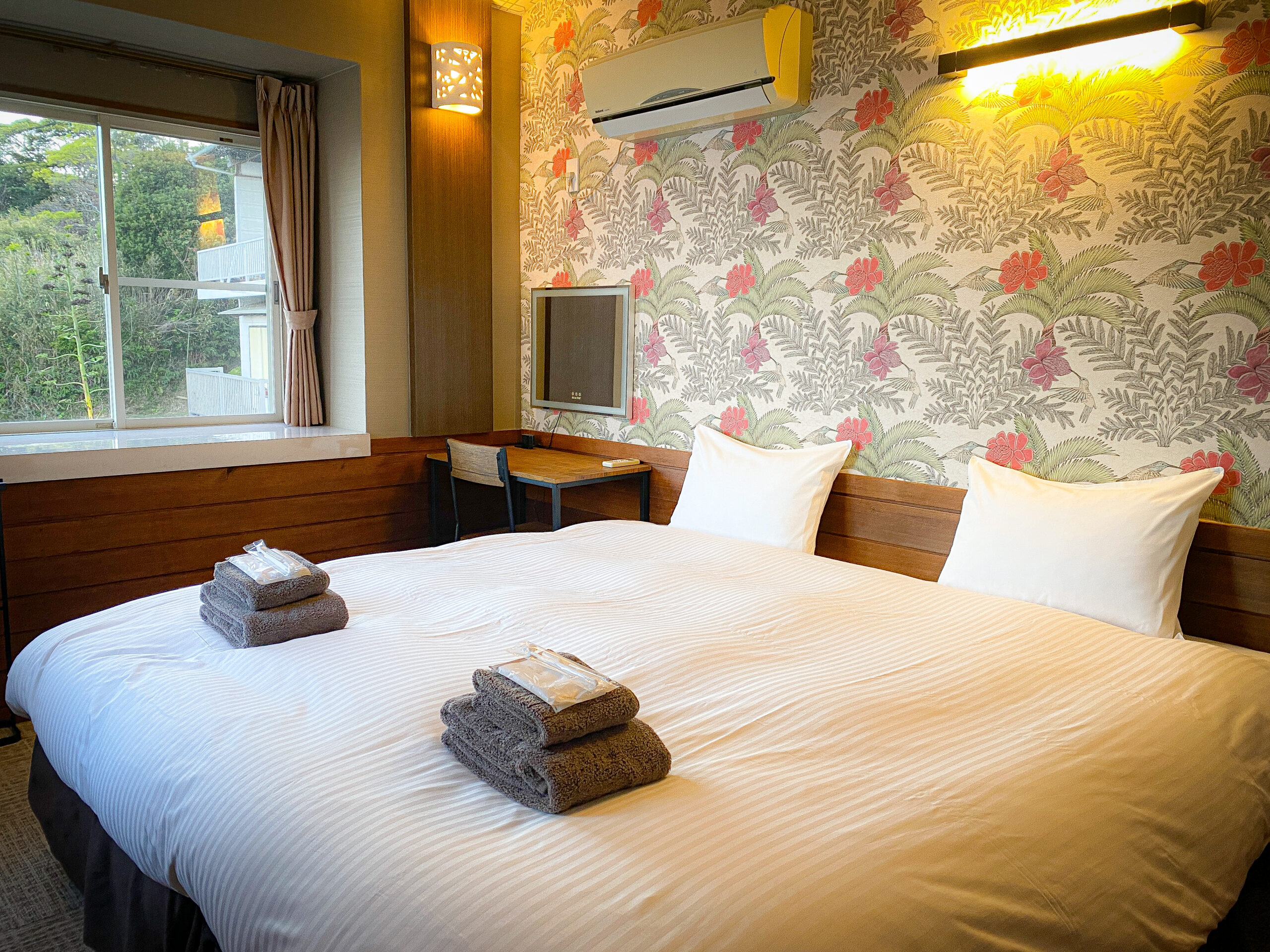 客室のタイプは、キングベッド1台 × 1室とシングルベッド2台 × 6室の2タイプ。ベットがふかふかで、心地いい眠りにつくことができました。オーシャンビューの客室から見える海も絶景。寝起きにキラキラした海が見えるので、いい気分に。各部屋にデスクがあるので、ちょっとした仕事や朝の支度をするのに便利です。