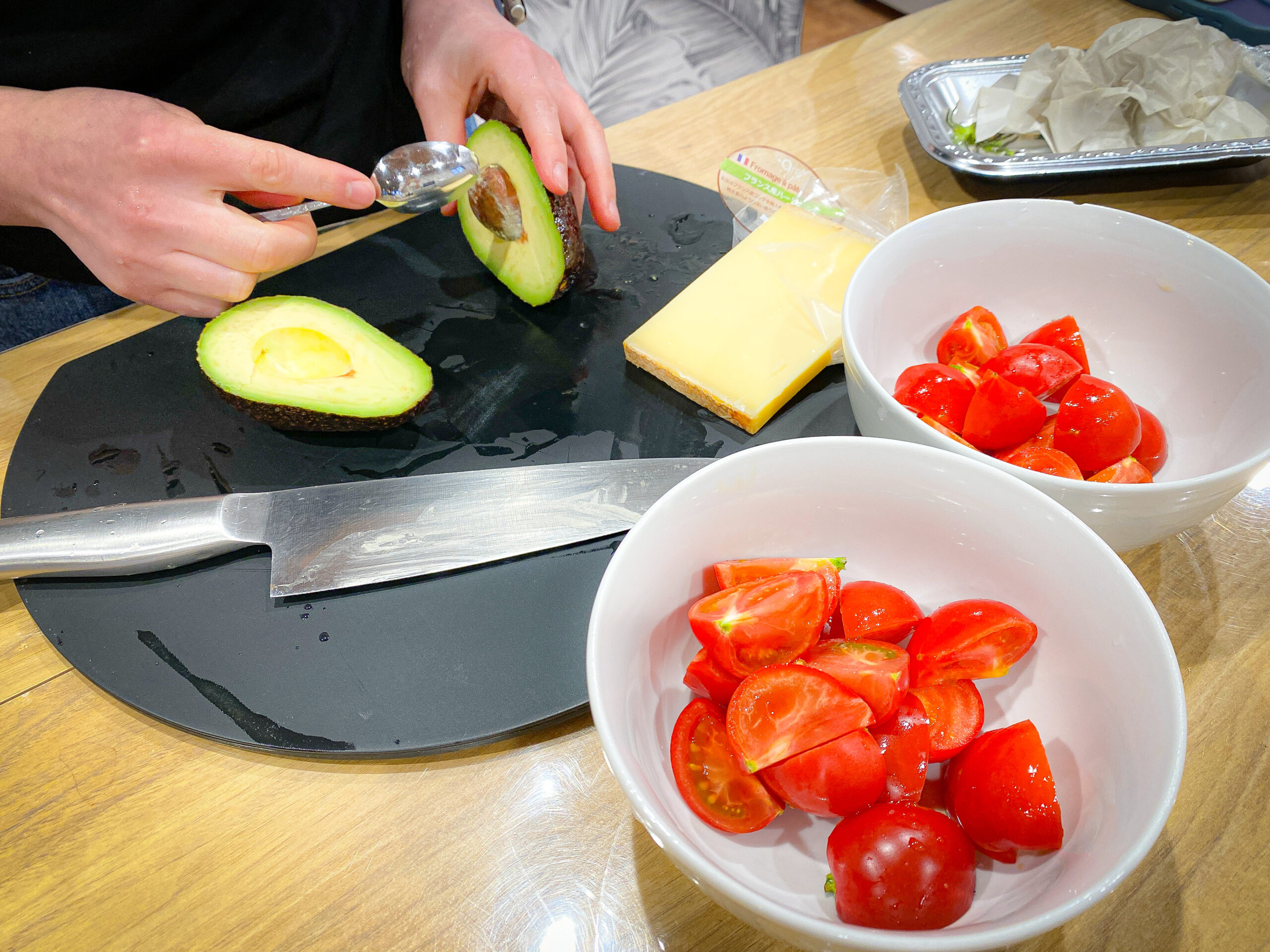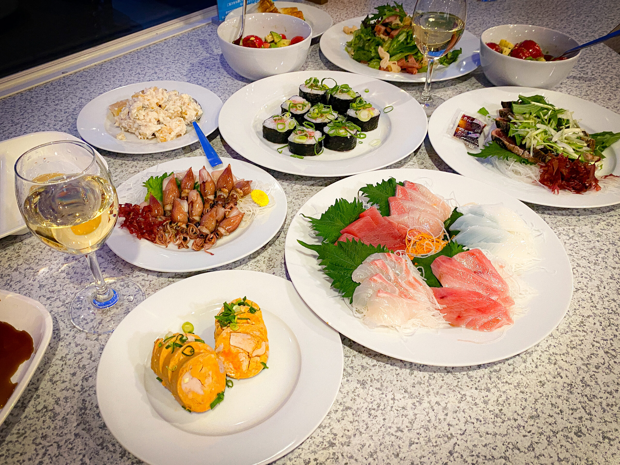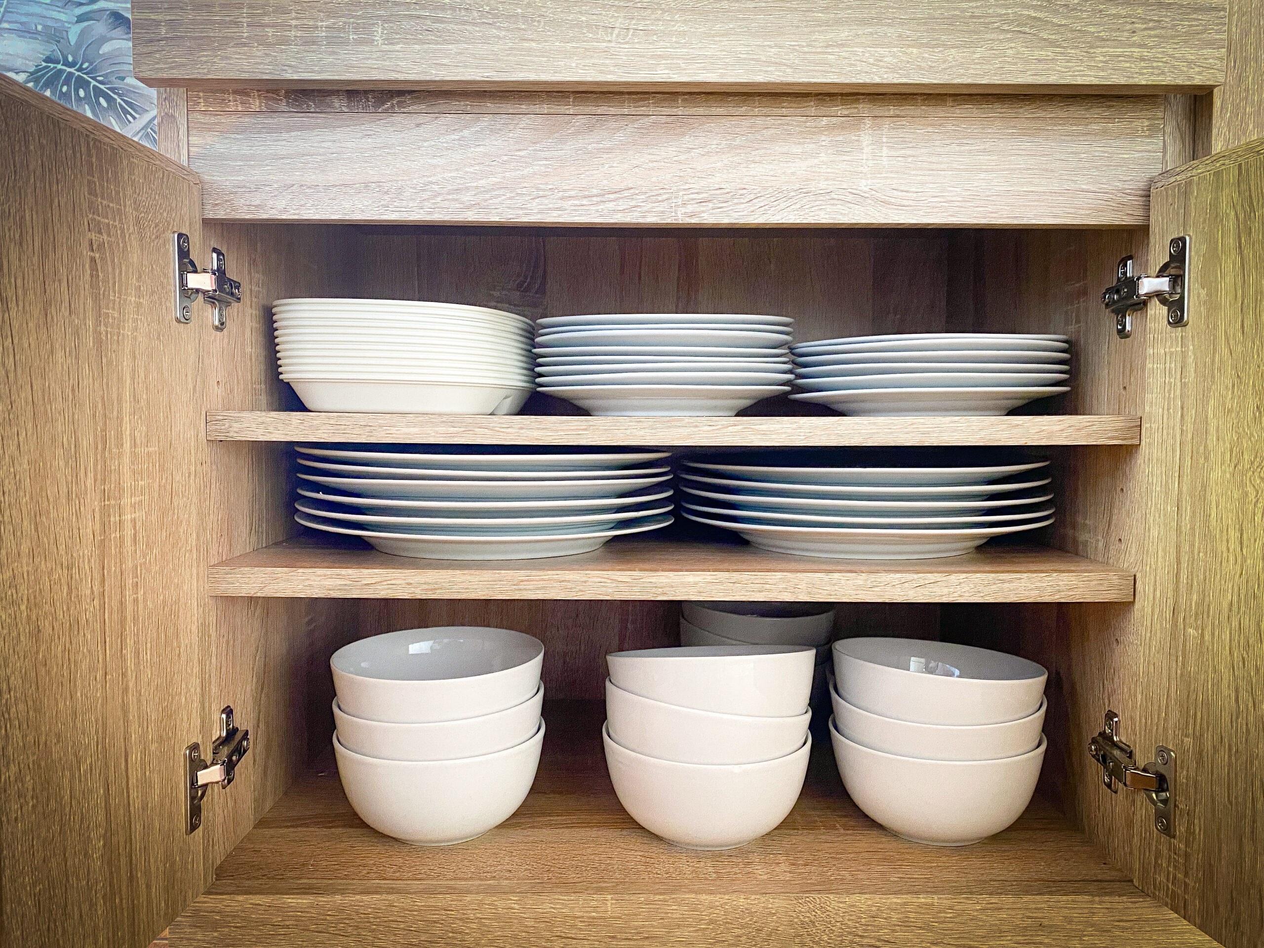 キッチンは食器やカトラリーが充実していて、料理時間も楽しめます。ピンクソルト(ヒマラヤ岩塩)とブラックペッパー、オリーブオイルは揃っています。