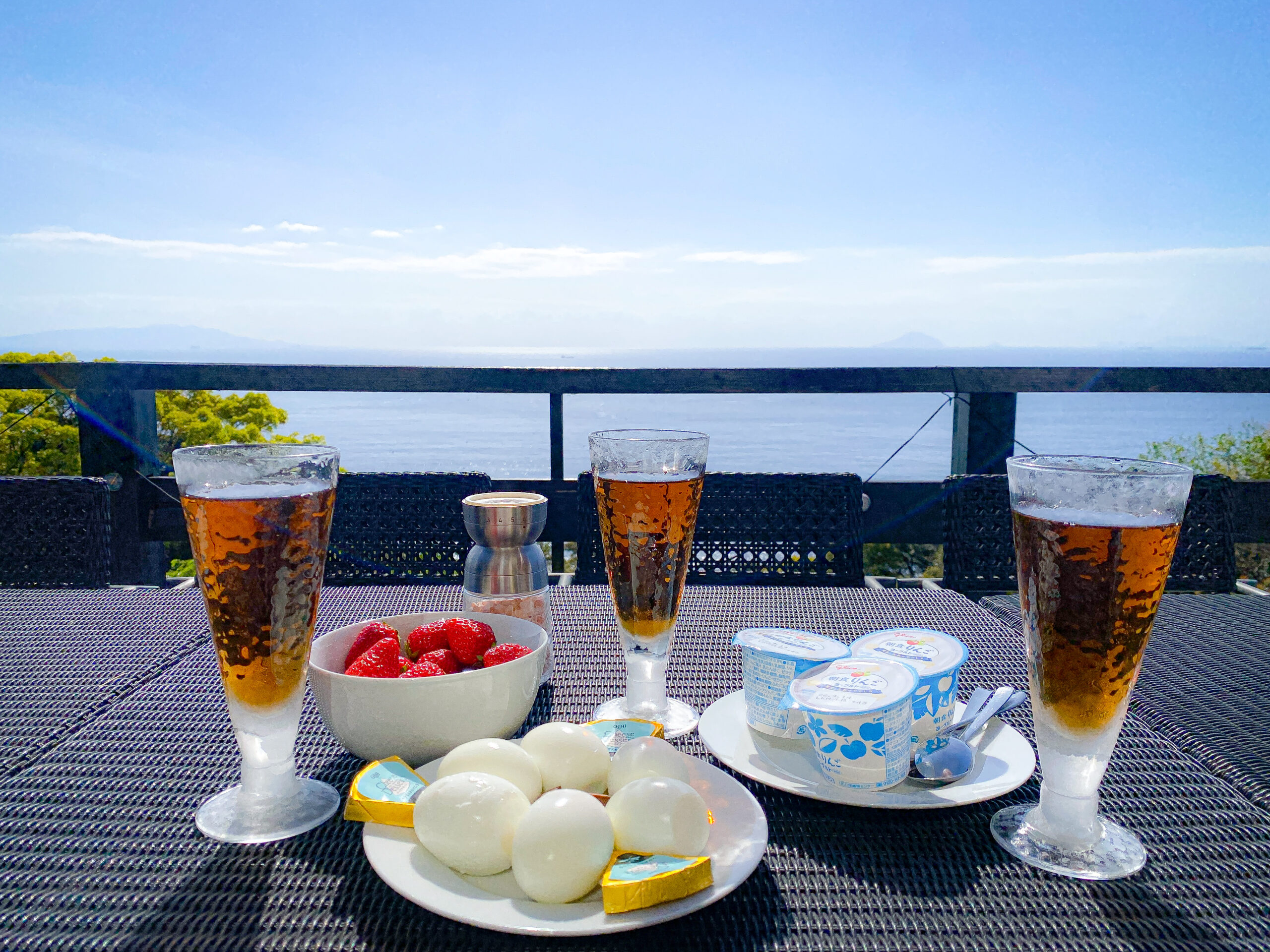 晴れた日は、海の向こうに伊豆諸島の島々が。テラスにはアメリカンスタイルのグリル(※有料)もあるので、夏は夜風に吹かれながらBBQするのもおすすめです。