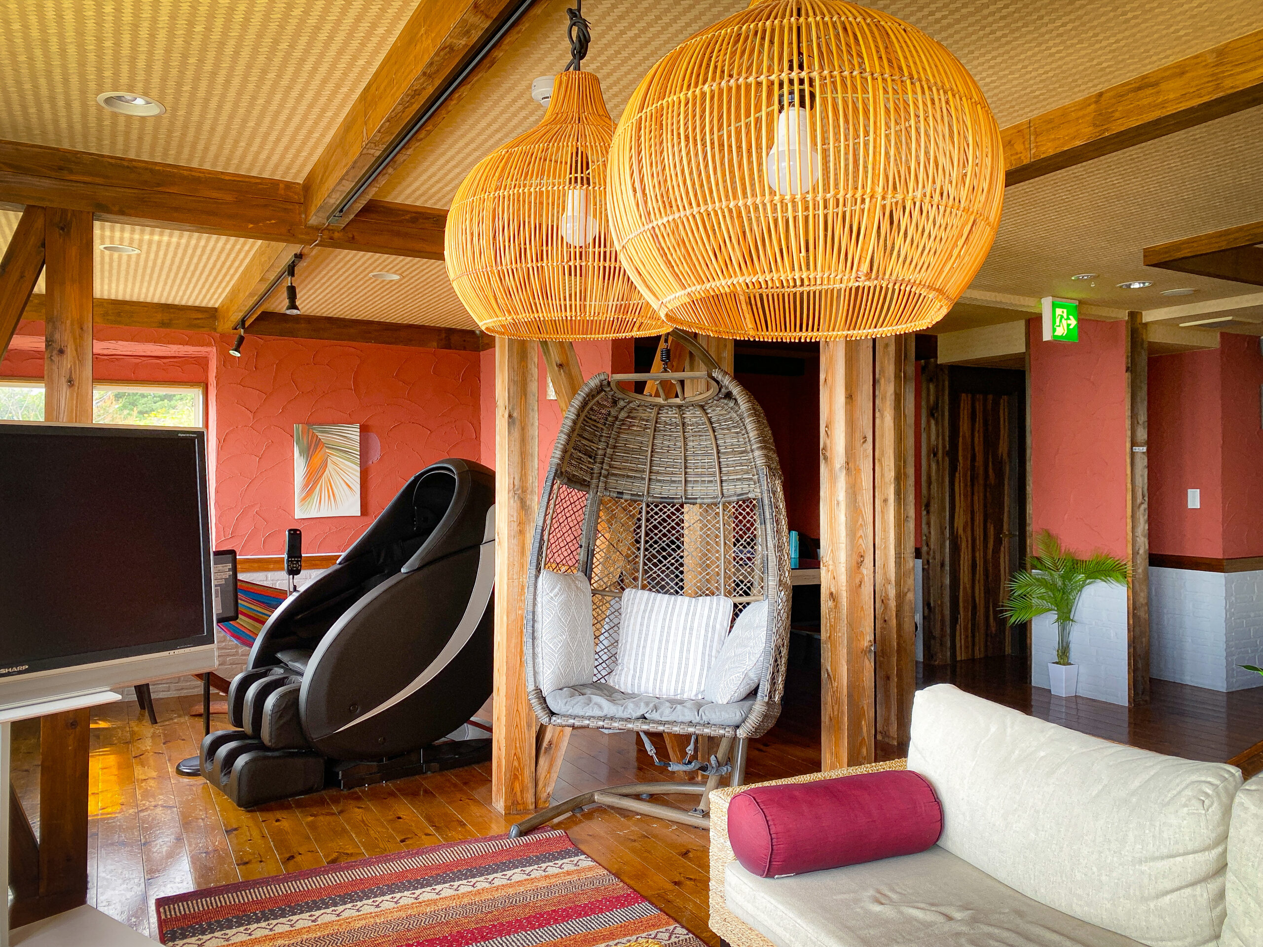 思わず写真を撮りたくなってしまう、フォトジェニックなソファーや椅子も揃います。奥にはマッサージチェア(※有料)や、ハンモックもあり、日常を忘れてリラックスするにはぴったり。