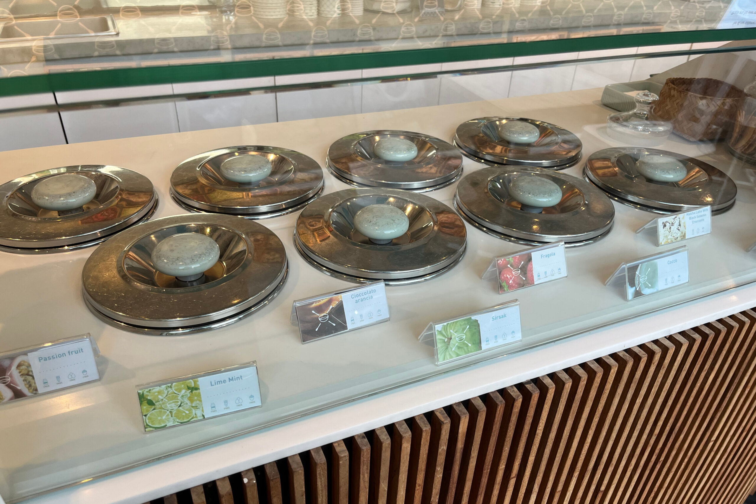 今回訪れたガヤジェラートのスミニャック店では、フレーバーが15種類ほど用意されていました。時期によってフレーバーに変動はあるようですが、バリ島らしい南国フルーツを使ったフレーバーからチーズケーキなど濃厚そうなフレーバーまでさまざまに取り揃えられています。フレーバーの数やカップの大きさは自分で選択できるようでした。2種類のフレーバーを選ぼうとすると、フレーバーの種類が豊富過ぎて目移りしてしまいます。フレーバー選択に迷っていると、店員さんが好きなだけテイスティングしてもよいとのことで、いくつか気になるフレーバーをお試しさせてもらいました。